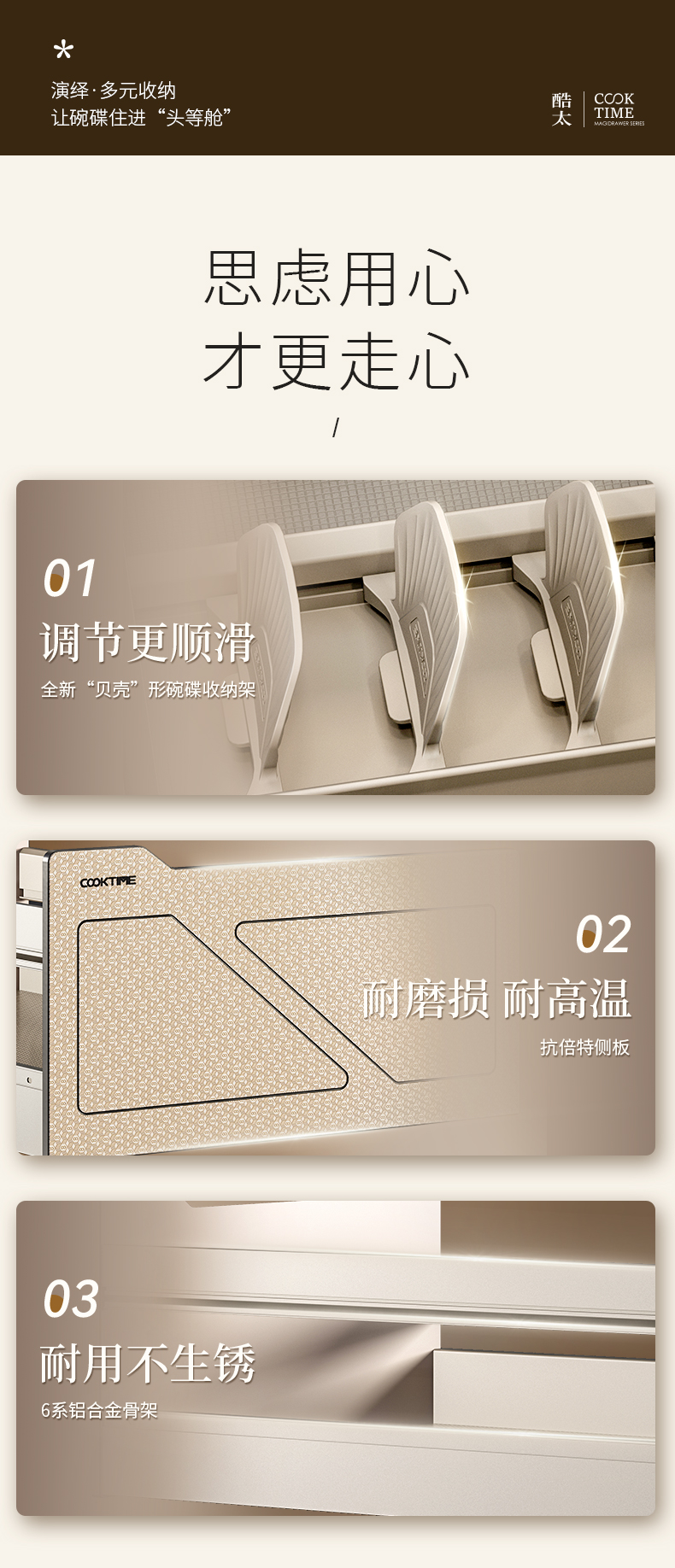 - 酷太坚持8年自主研发,已获得专利证书130项,拥有一套领先市场的厨房收纳系统,为千万中国家庭解决厨房脏乱差,缔造厨房新生活。