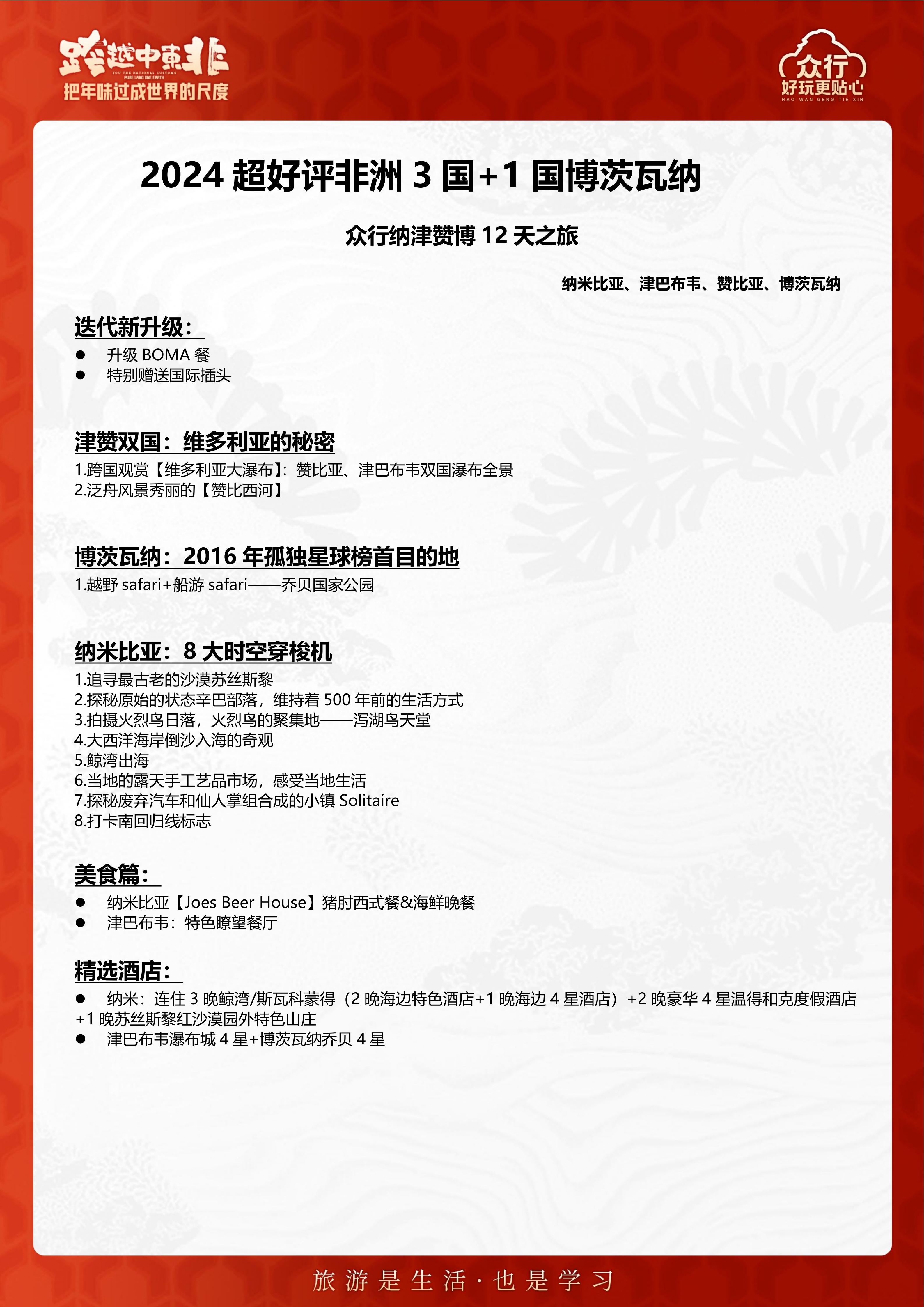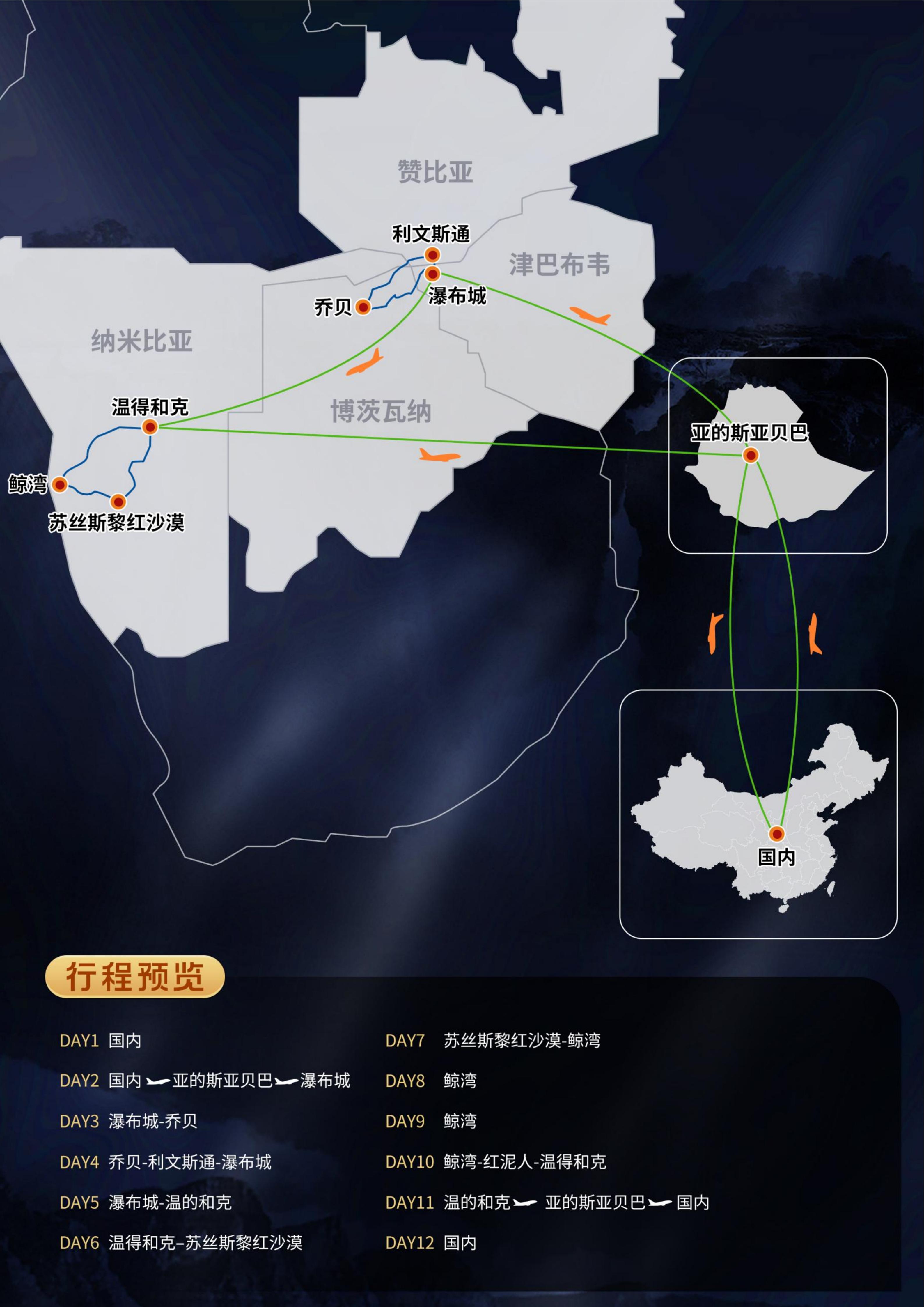 【春节】<非洲四国·纳米比亚、津巴布韦、赞比亚、博茨瓦纳12天>维多利亚大瀑布、赞比西河游船、乔贝国家公园、苏斯斯黎红沙漠、鲸湾港口出海、三明治湾冲沙、辛巴红人部落