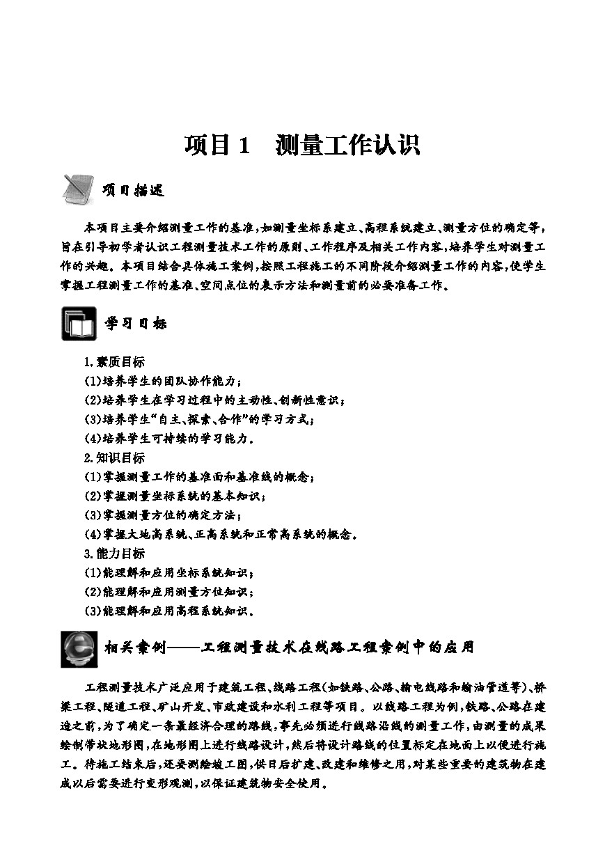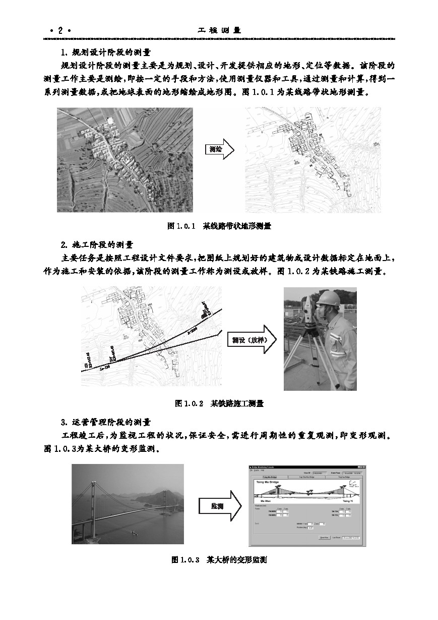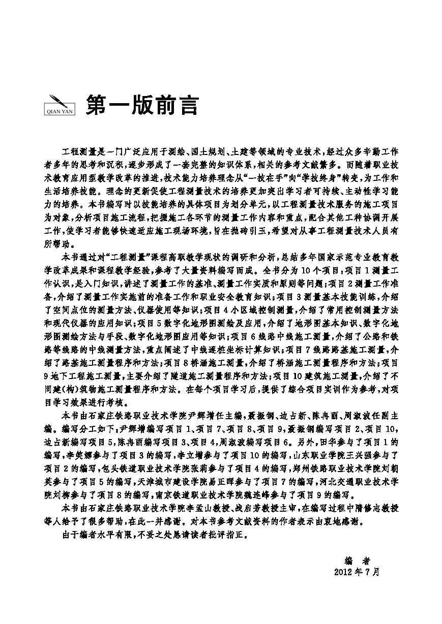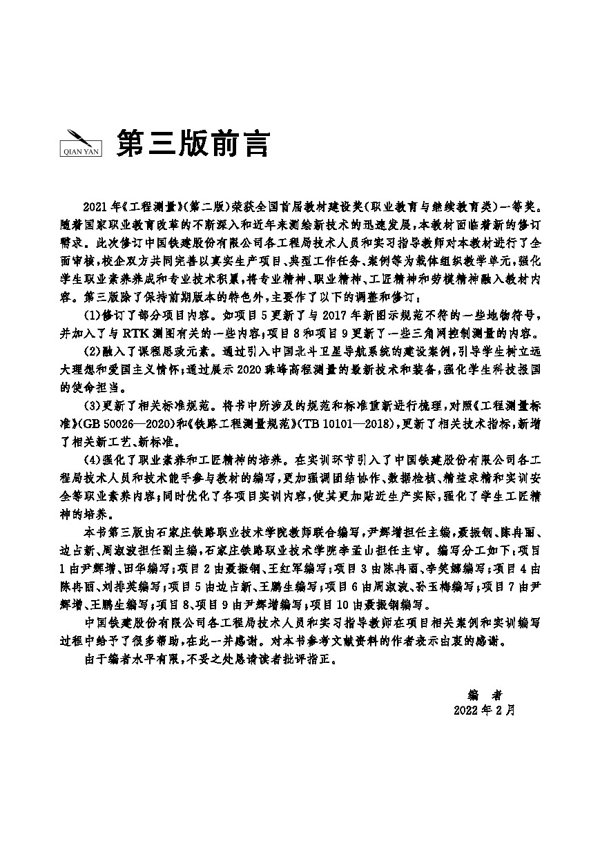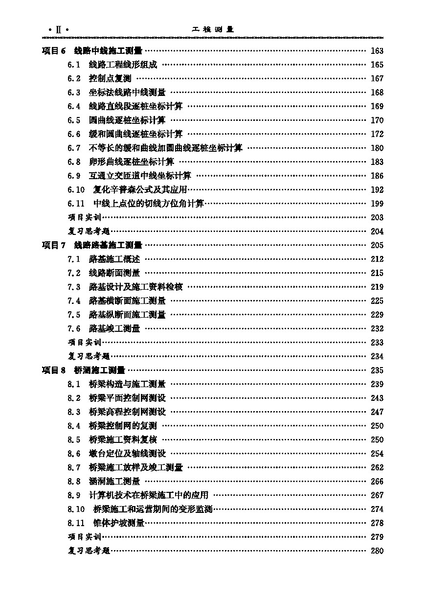 本书为“十二五”职业教育国家规划教材 高等职业教育铁道工程技术专业“十四五”规划教材。本书一共包含十个项目。项目1为测量工作认识;项目2为测量工作准备;项目3为测量基本技能训练;项目4为小区域控制测量;项目5为数字化地形图测绘及应用;项目6为线路中线施工测量;项目7为线路路基施工测量;项目8为桥涵施工测量;项目9为隧道施工测量;项目10为建筑施工测量。本书最大的特色为针对线路、路基、桥涵、隧道分别设置了相关的施工测量内容。
