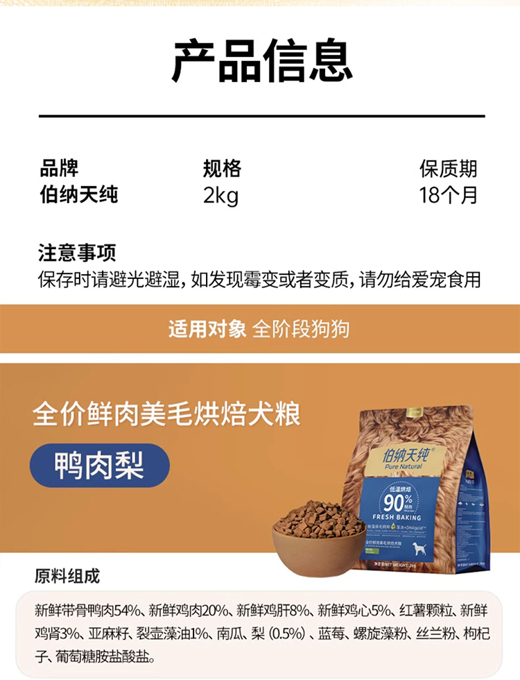 伯纳天纯低温烘焙粮狗粮成犬粮幼犬粮鲜肉美毛鸭肉梨清火鸡肉鱼配方