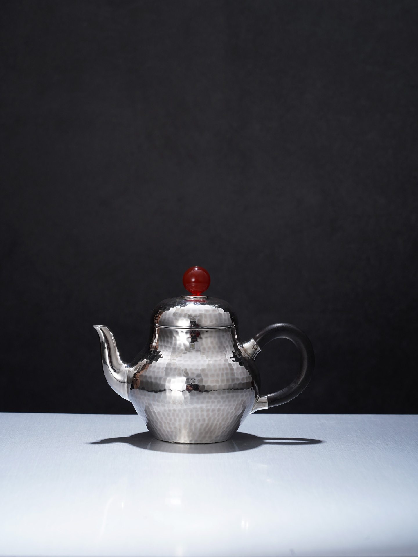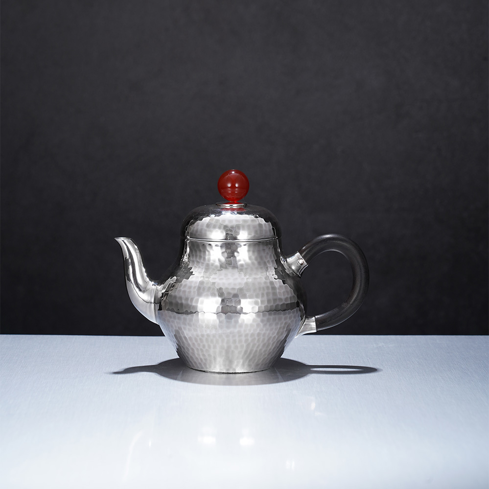 【寓意】:纯银壶身以锤纹精铸,宛若月下涟漪;玛瑙壶摘似丹心一点,取“丹心照月”之名,喻君子如明月朗照,心怀忠贞,茶香氤氲间,亦见天地澄明。