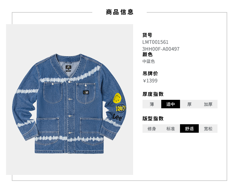 【Smiley®联名】Lee22春夏新品舒适中蓝男牛仔夹克外套LMT001561