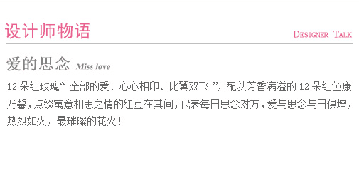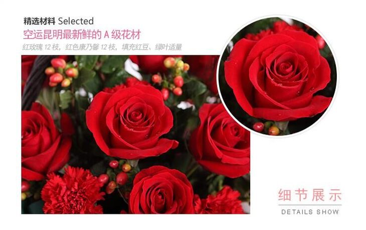 红玫瑰12枝,红色康乃馨12枝,填充红豆、绿叶适量(如当地红豆缺货,用相思梅等其他寓意相近配材替代。)