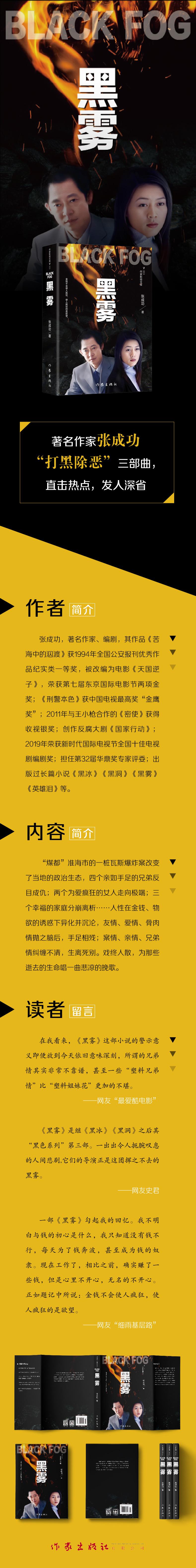 在我看来,《黑雾》这部小说的警示意义即便放到今天依旧意味深刻,所谓的兄弟情其实非常不靠谱,甚至一些“塑料兄弟情”比“塑料姐妹花”更加的不堪。 ——网友“最爱酷电影”《黑雾》是继《黑冰》《黑洞》之后其“黑色系列”第三部。一出出令人扼腕叹息的人间悲剧,它们的导演正是这团挥之不去的黑雾。 ——网友史君 一部《黑雾》勾起我的回忆。我不明白与钱的初心是什么,我只知道没有钱不行,每天为了钱奔波,甚至成为钱的奴隶。现在工作了,相比之前,确实赚了一些钱,但是心里不开心,无名的不开心。正如题记中所说:金钱不会使人疯狂,使人疯狂的是欲望。 ——网友“细雨基层路”《黑雾》经典台词金钱不会使人疯狂,使人疯狂的是欲望。夜色会使有的人感到压抑,也会使有的人感到亢奋。一个人,尤其是一个女人,如果为了金钱,连脸都不要了,那她也就一钱不值了!春去夏来,风渐渐地热了。吹开了稻花,吹黄了麦芒,也吹烫了淮海煤田那一座座高耸的“乌金”之山。随着一声穿透漫漫尘雾的枪响,一个悲剧落下了沉重的帷幕。