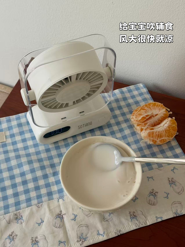 日常其实低档位就非常凉快了, 一直觉得100档有点多了,吹久有点冷。 结果周末我妹带孩子过来玩才发真的很有必要🤩 小孩是饿不得,一饿就得吃, 辅食凉的慢,没有这个风扇真不行! 开100档吹一分钟就凉了💨~