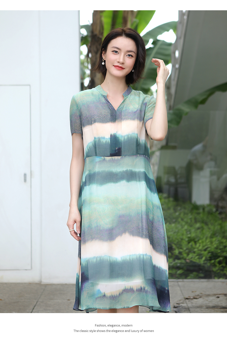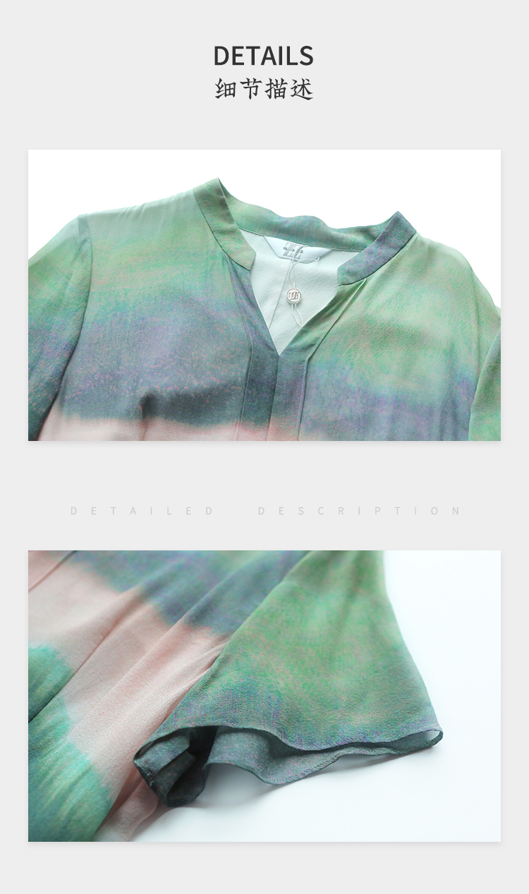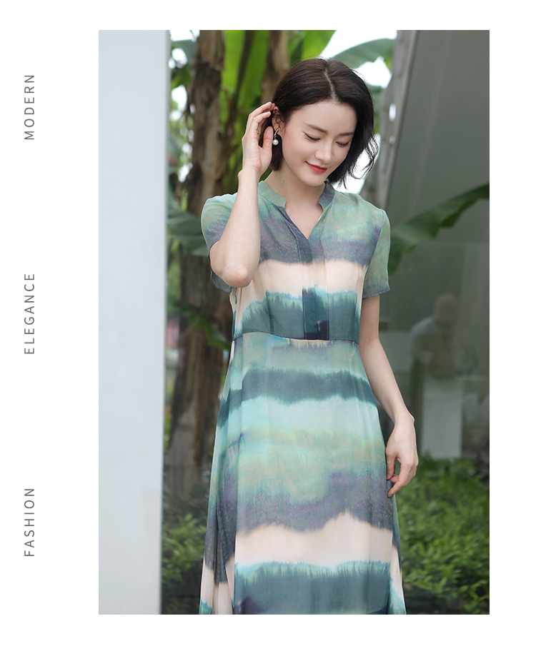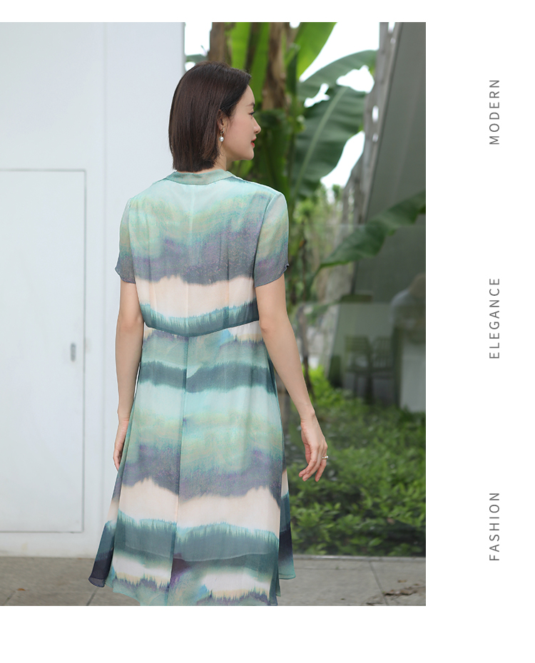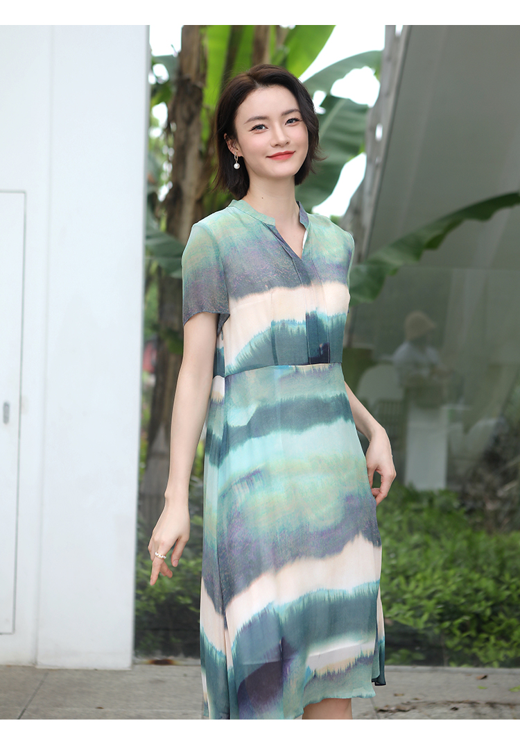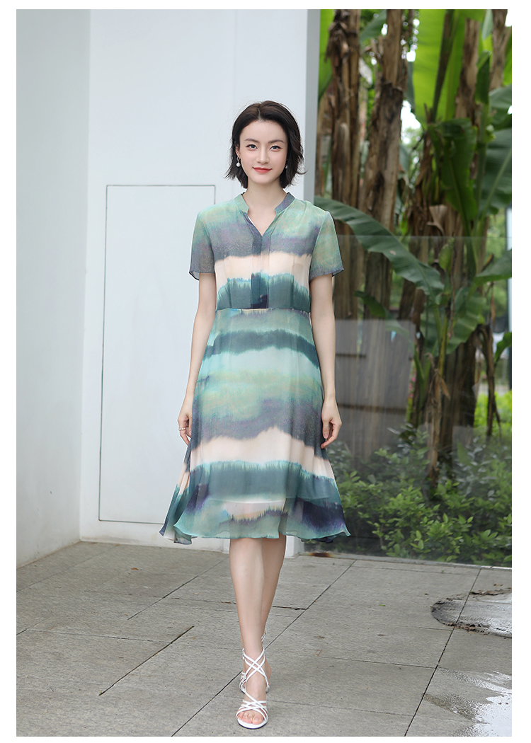 佐尔美夏季新款 气质时尚V领渐变桑蚕丝中长连衣裙女E32LS92