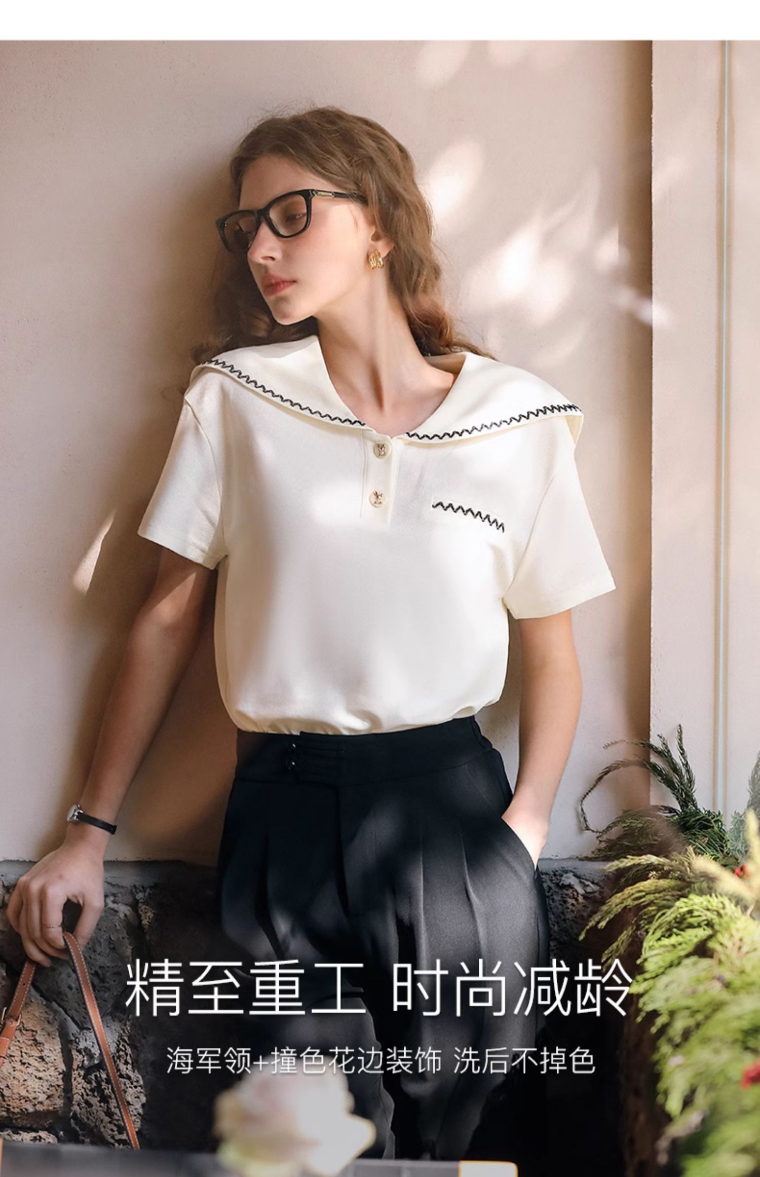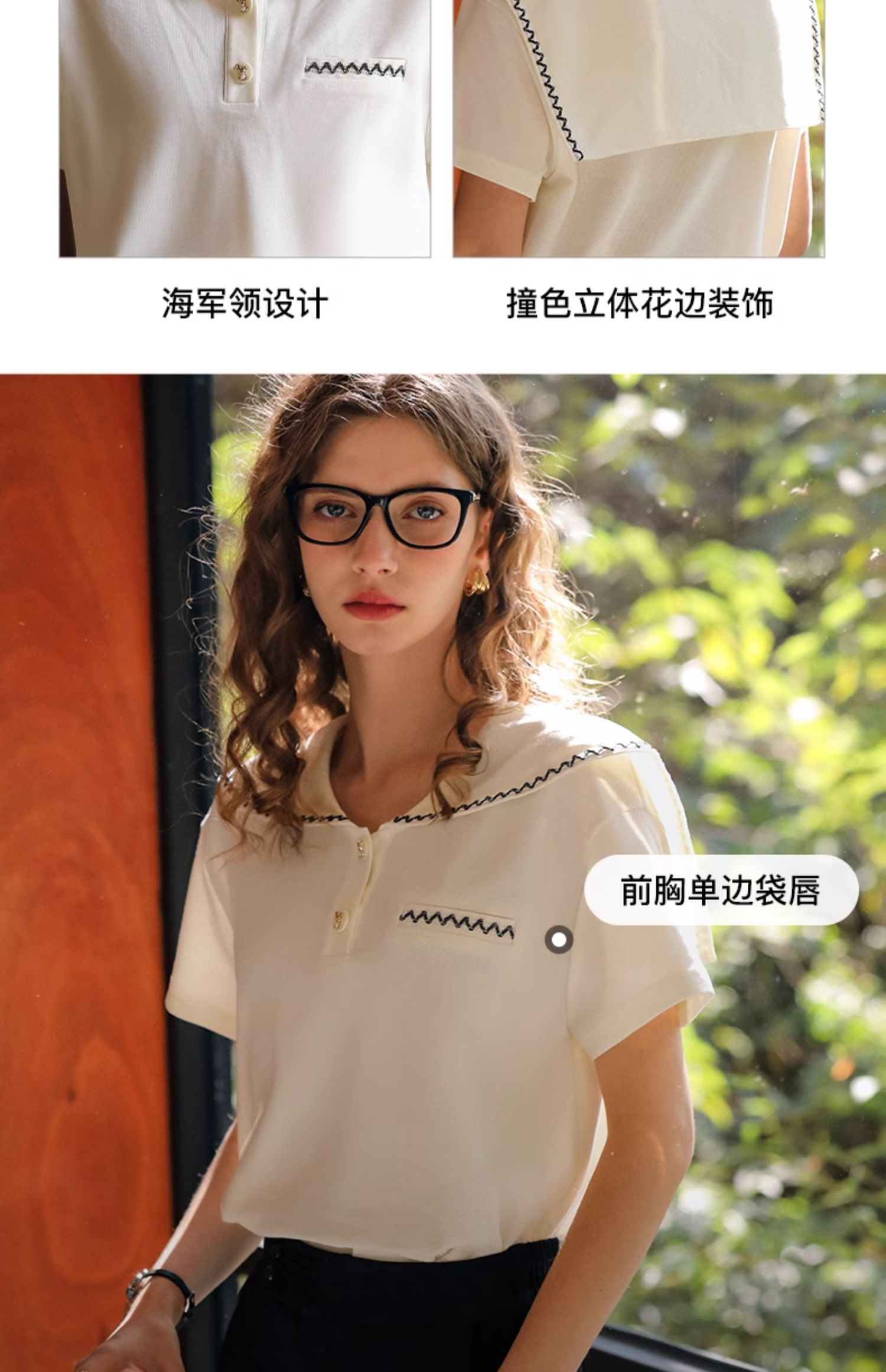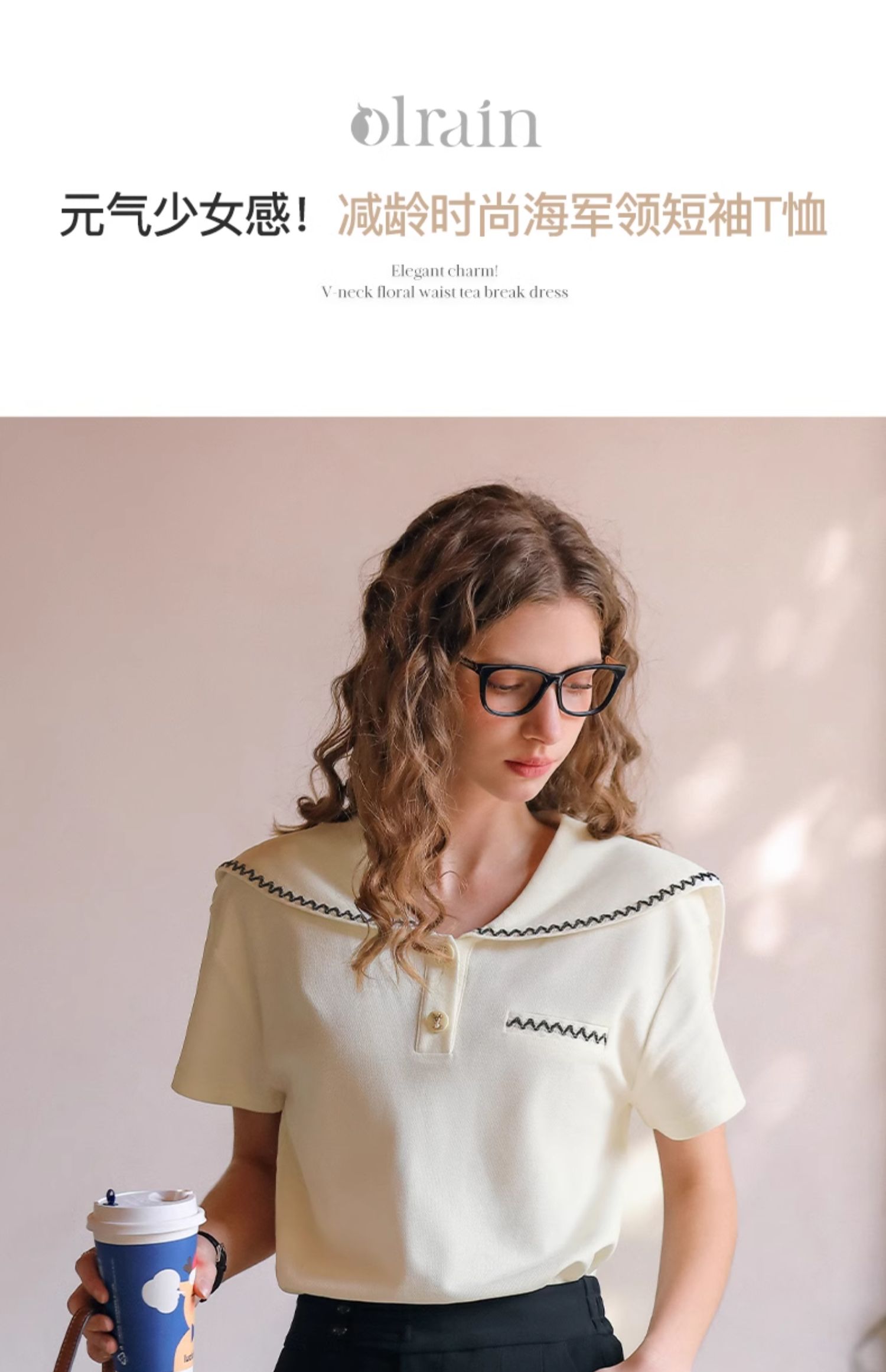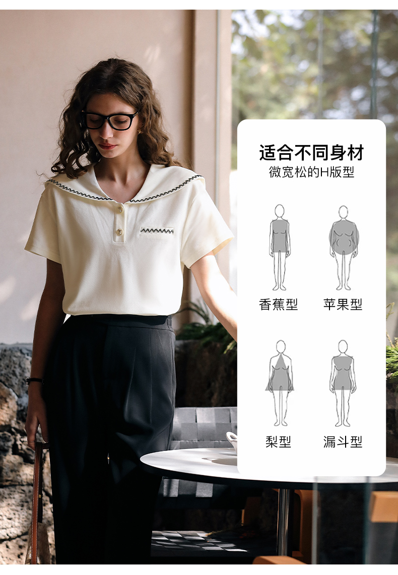 OLrain欧芮儿米白色T恤女夏季2024新款小个子时尚海军领短袖上衣