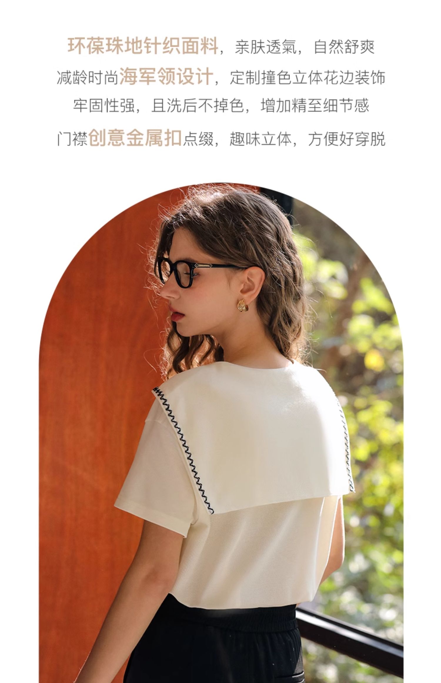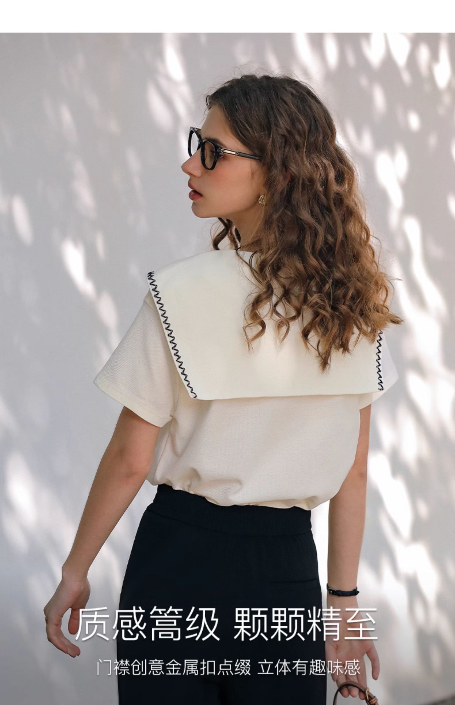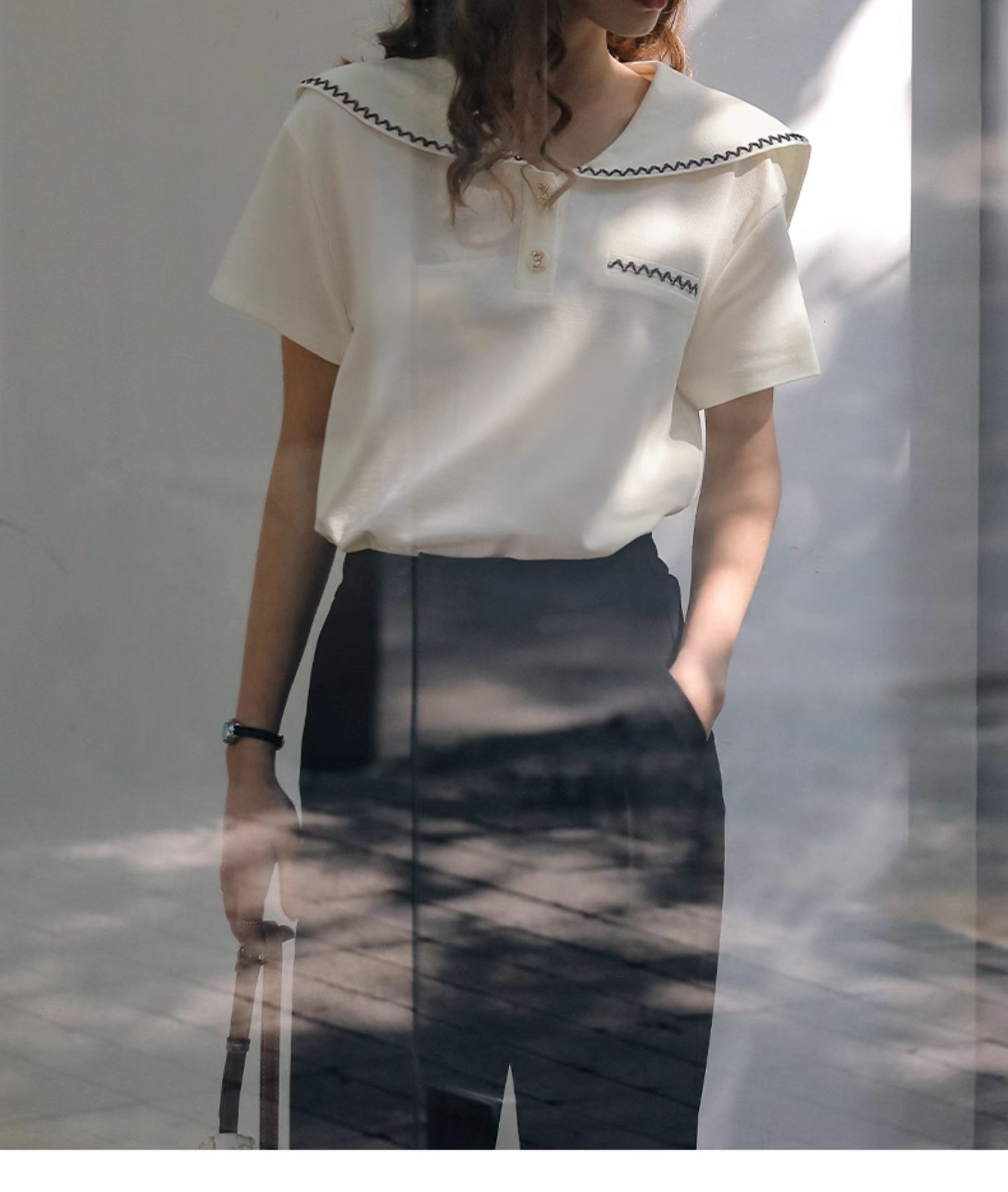 OLrain欧芮儿米白色T恤女夏季2024新款小个子时尚海军领短袖上衣