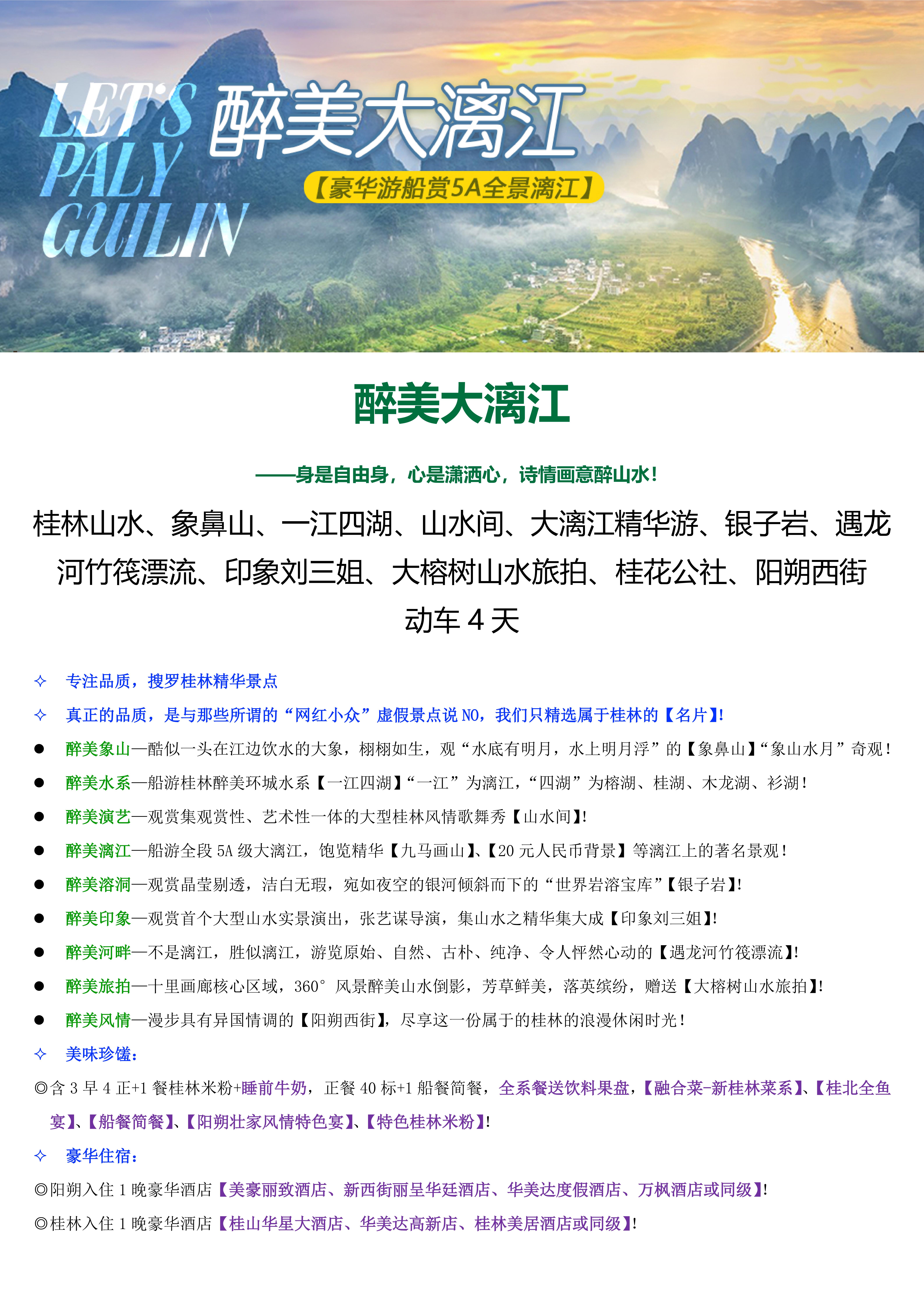 <桂林+阳朔4天3晚动车团(20人精致小团)>桂林山水、象鼻山、一江四湖、山水间、大漓江精华游、银子岩、遇龙 河竹筏漂流、印象刘三姐、大榕树山水旅拍、桂花公社、阳朔西街