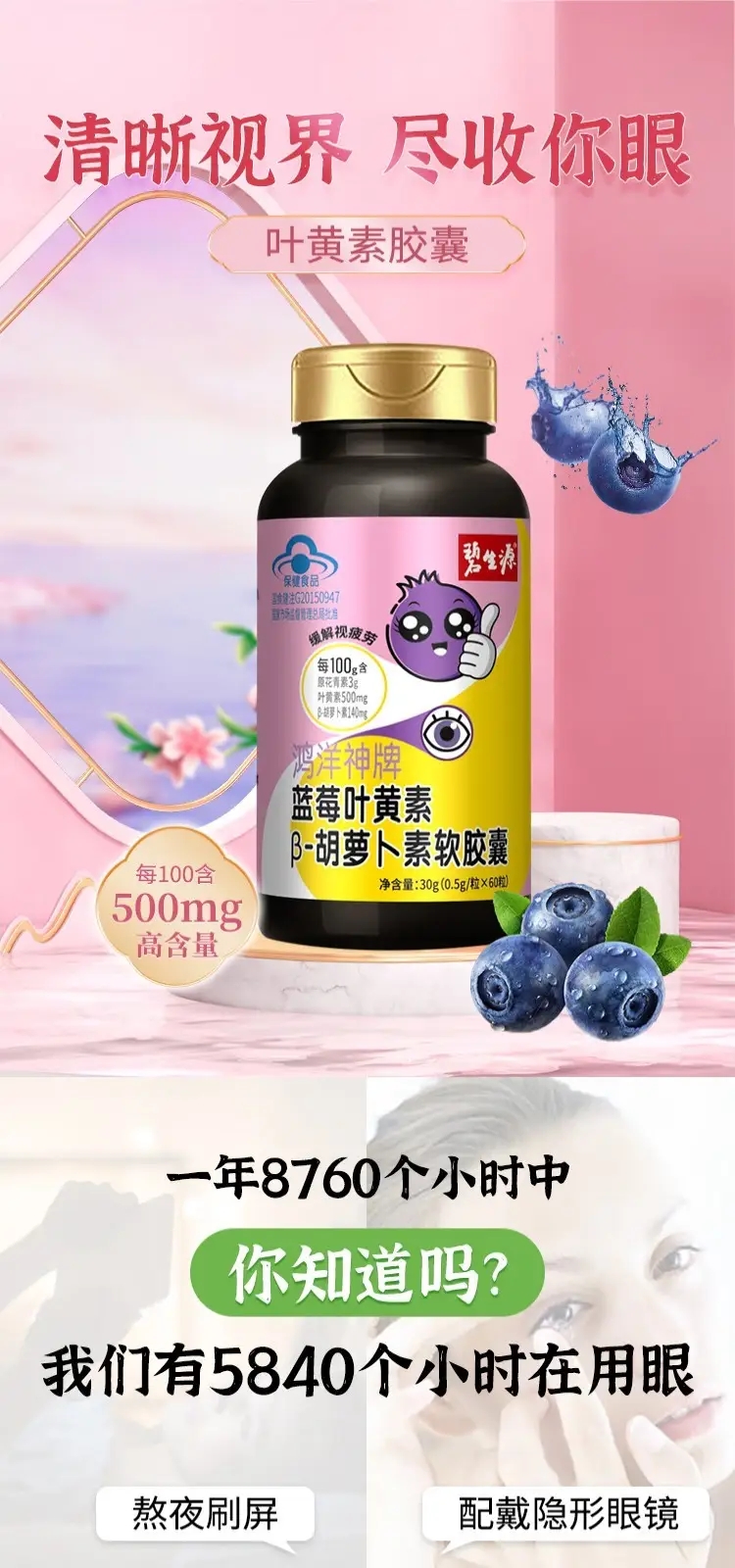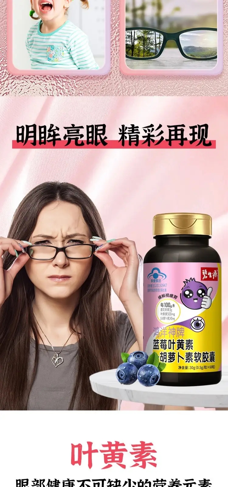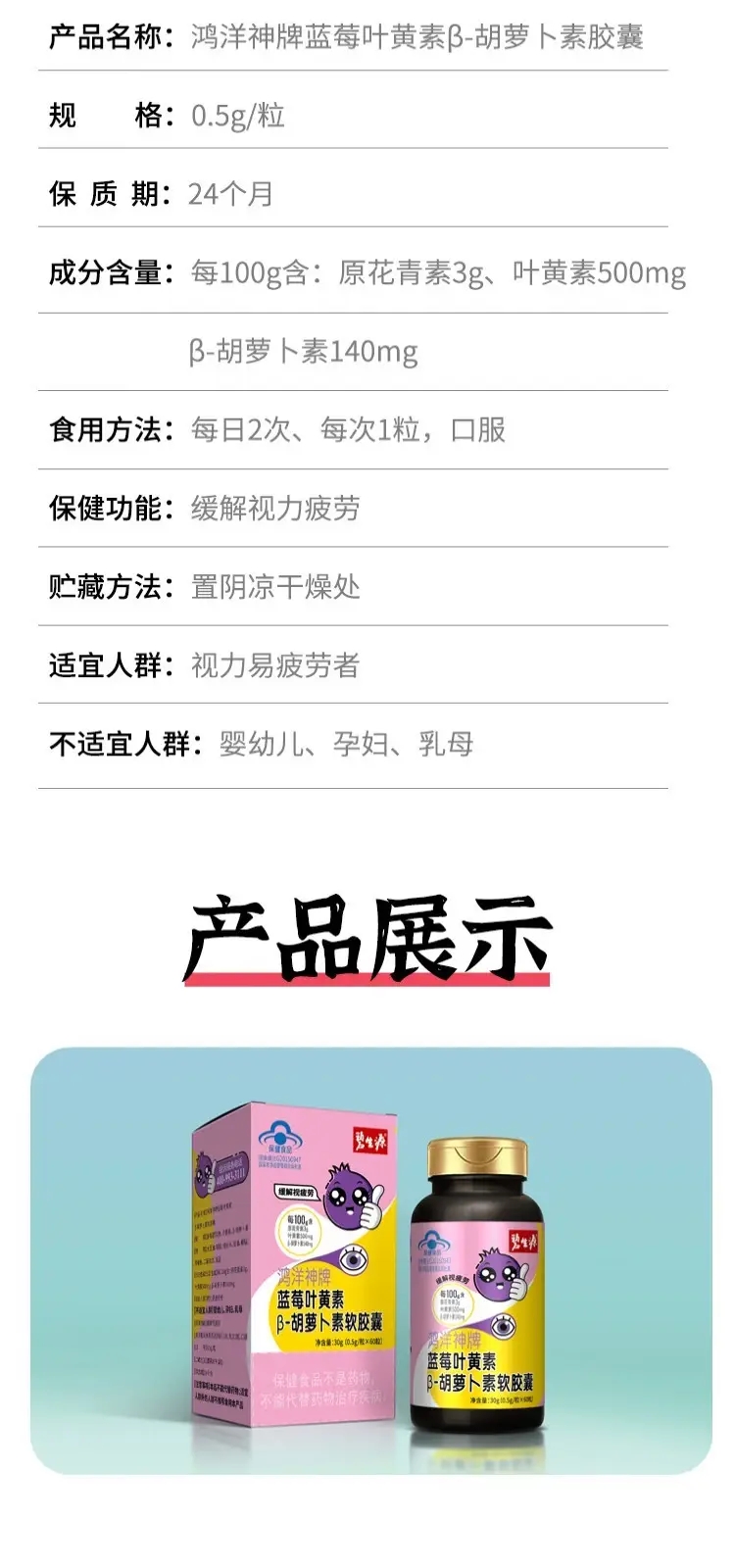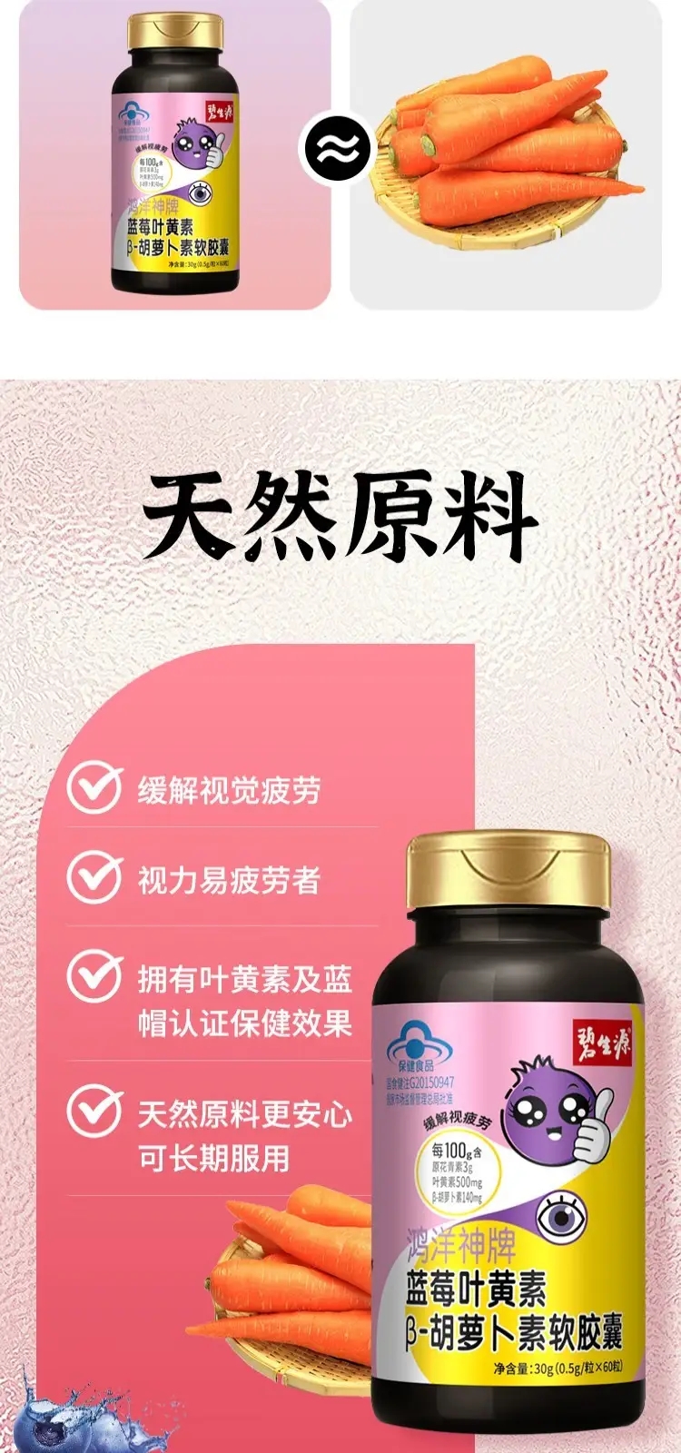 碧生源 鸿洋神牌蓝莓叶黄素β-胡萝卜素软胶囊缓解眼部疲劳 0.5g*60粒/盒 蓝帽认证成人男女通用