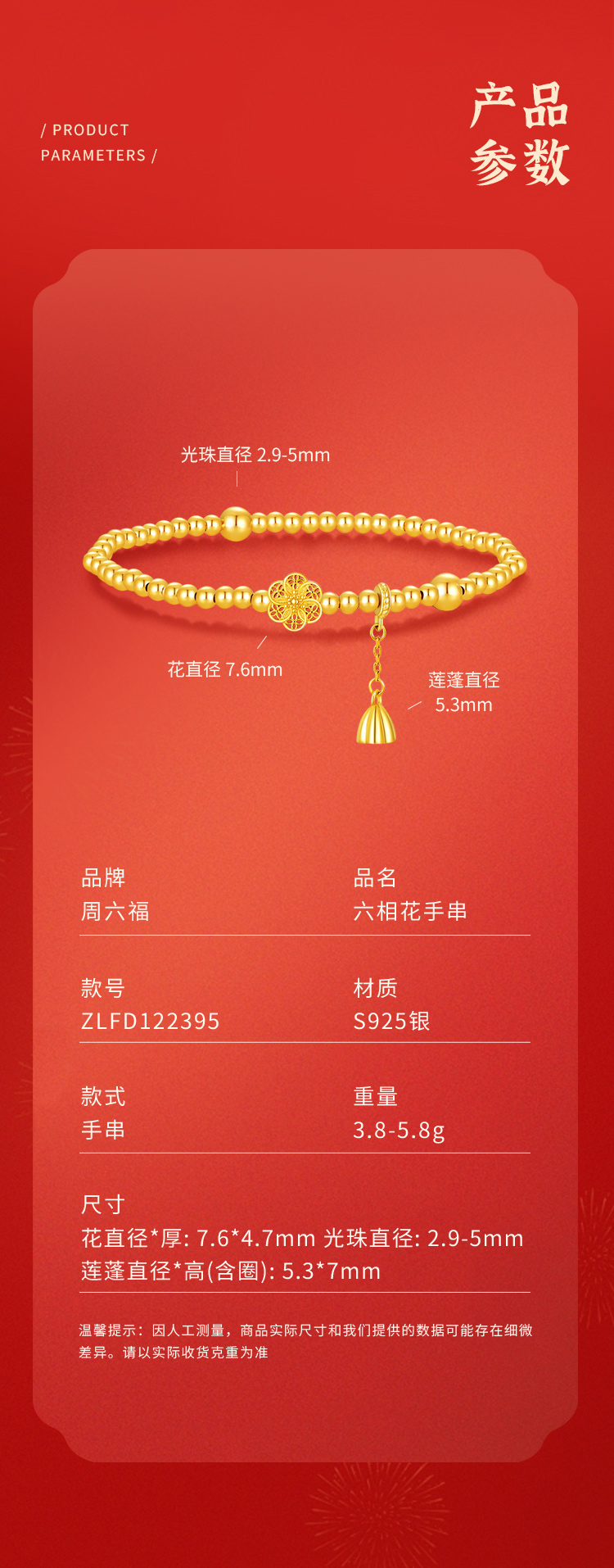 周六福S925银六相花手串ZLFD122395★