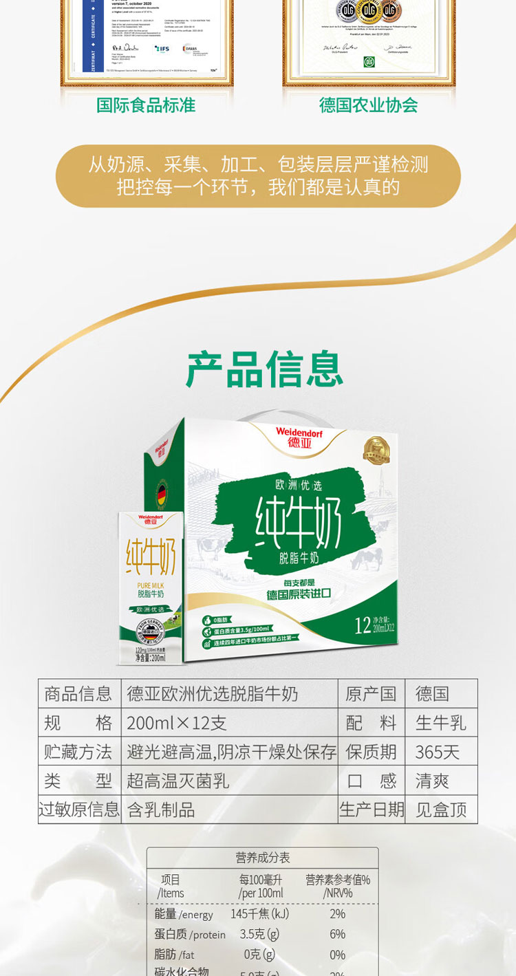 德亚欧洲优选脱脂牛奶(200mlx12)