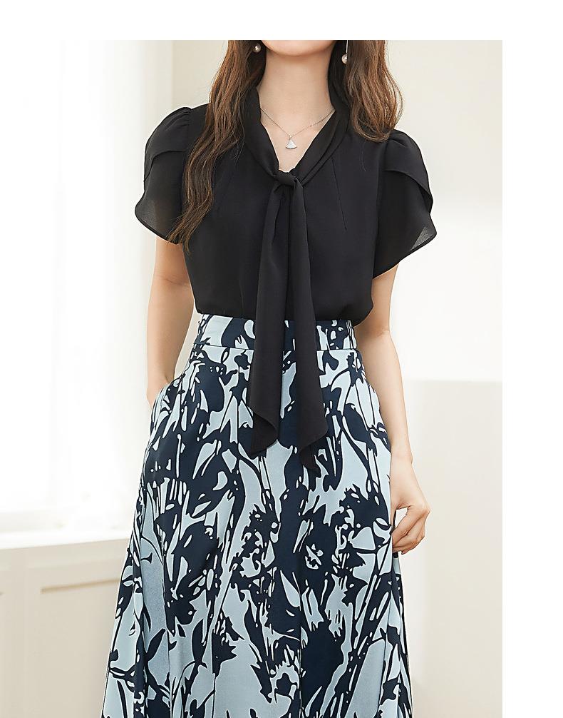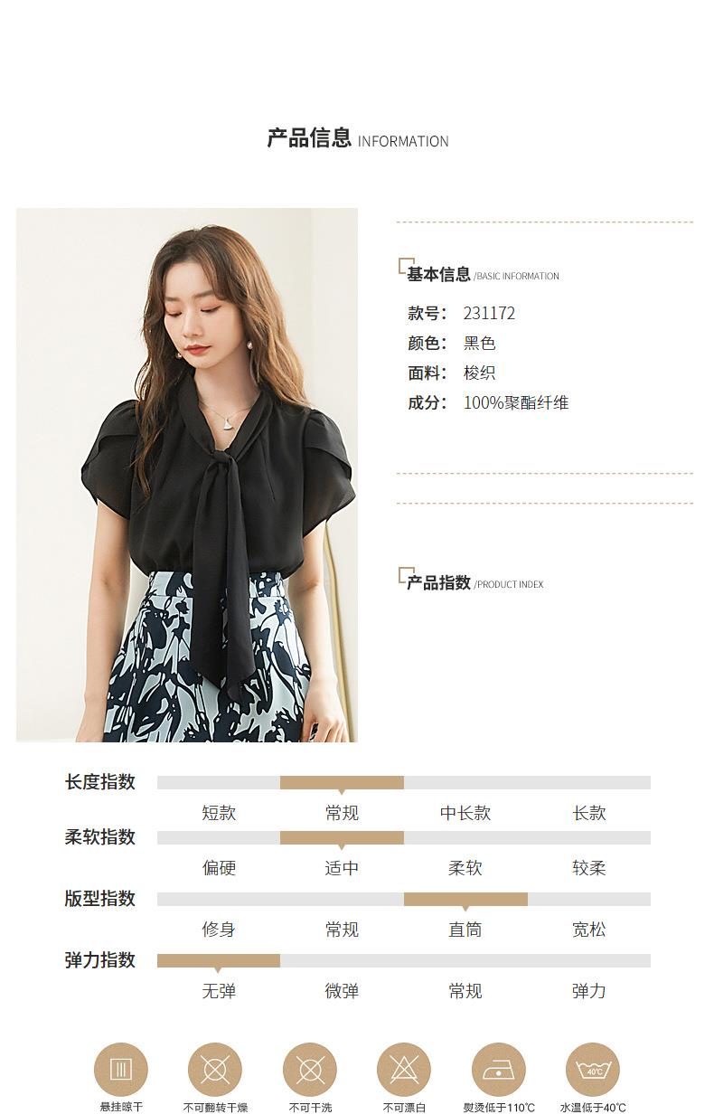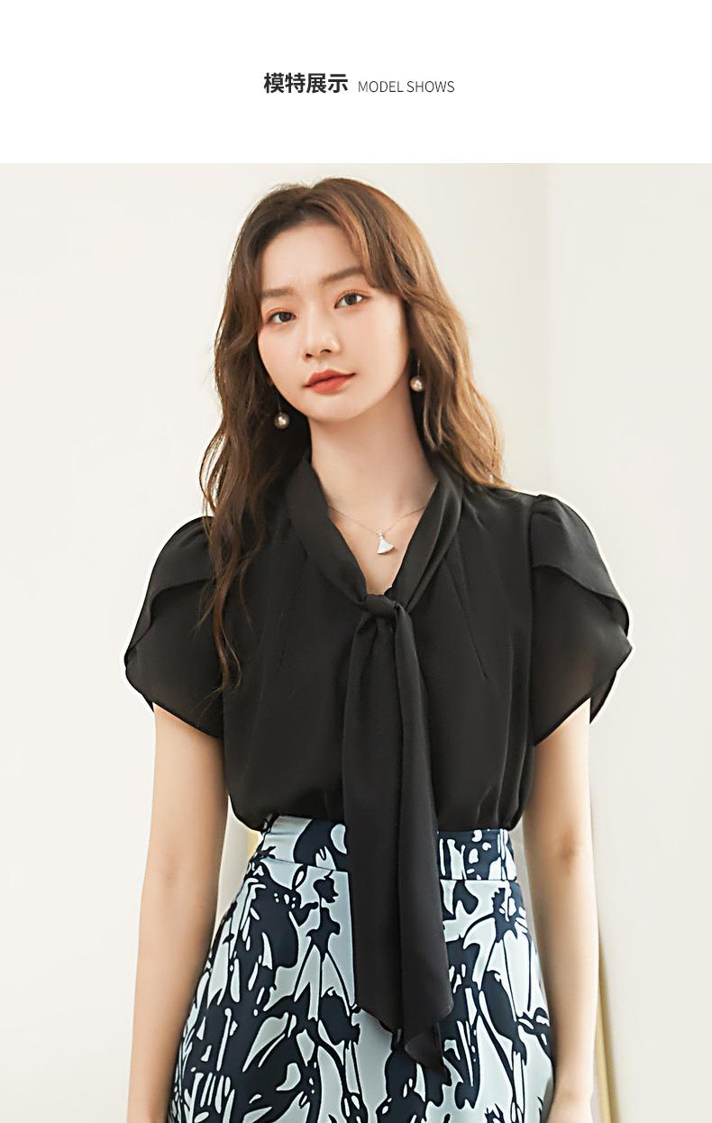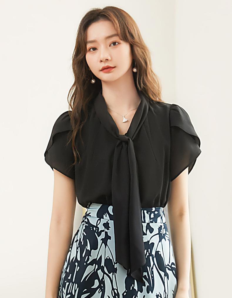 百姿 都市气质雪纺衫2023夏季新款系带V领花瓣袖薄款小衫女231172