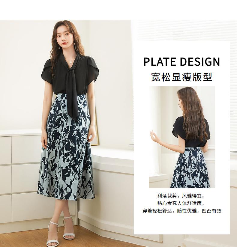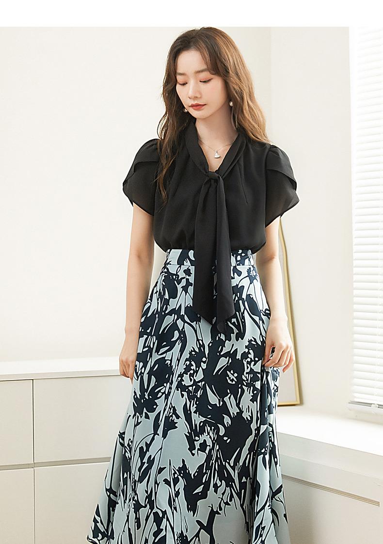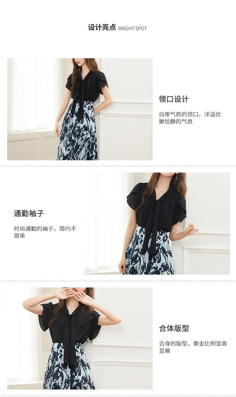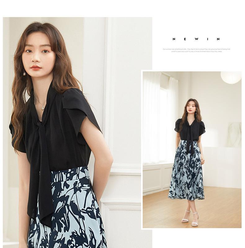 百姿 都市气质雪纺衫2023夏季新款系带V领花瓣袖薄款小衫女231172