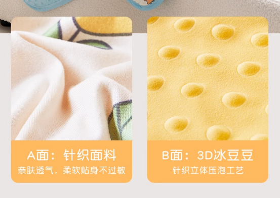AB面设计,一被两盖。 一面是A类针织棉,母婴级的全面面料,将柔软、透气性做到了极致,不怕摩到皮肤,不用套被套也柔软又舒适,一年四季都适用。 反面立体豆豆绒,保暖恒温,不掉毛不掉色!
