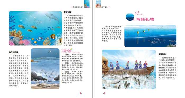 1.《滨海明珠》魅力海港亚洲海滨欧洲海滨美洲海滨非洲海滨大洋洲海滨2.《海洋宝库》美丽富饶的海洋海洋的馈赠人类丰富的食品厂人类的医药原料仓人类的聚宝盆人类开发的另一片沃土人类探寻艺术的资料馆保护海洋资源3.《冰雪极地》认识极地感知南极探秘北极人类与极地4.《船舶概览》船舶的发展军用船舰民用船舶海上运动艇5.《多彩海鱼》认识鱼类早期的鱼类鲨鱼和鳐鱼家族身怀绝技的海洋鱼类长相奇特的海洋鱼类长相美丽的海洋鱼类经济鱼类6.《航海英雄》眺望新世界航海的先行者航海帝国崛起之路认知新世界的先驱探索英雄7.《海战狼烟》桨帆战船时代风帆战舰时代的到来铁甲舰时代的海战一战和二战时期的海战导弹时代的海战中国海战8.《美丽海洋》我们的地球浩瀚的洋与多姿的海多样的海洋地貌神奇的海洋现象9.《海中胜景》绝美的海洋迷人的海湾梦幻的海滩美丽的海岛10.《海洋生物》模样古怪的海洋生物穿着盔甲的海洋生物美丽却不好惹的海洋生物形似植物的海洋动物海中的哺乳动物盘旋在海面上的海鸟海洋植物11.《海底探密》海底世界的样貌神秘的深海生物海底遗迹海底科考海底空间利用12.《海洋灾害》冷酷无情的海啸恐怖的海上风暴海洋冰害海雾灾害其他海洋灾害历史上著名的海滩