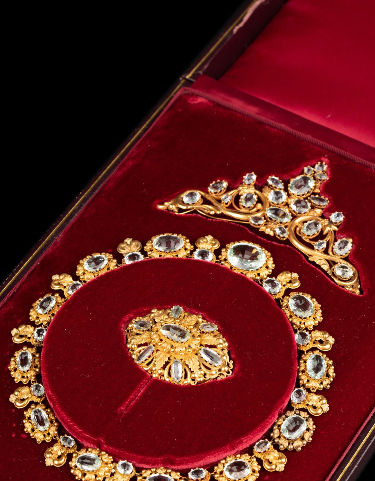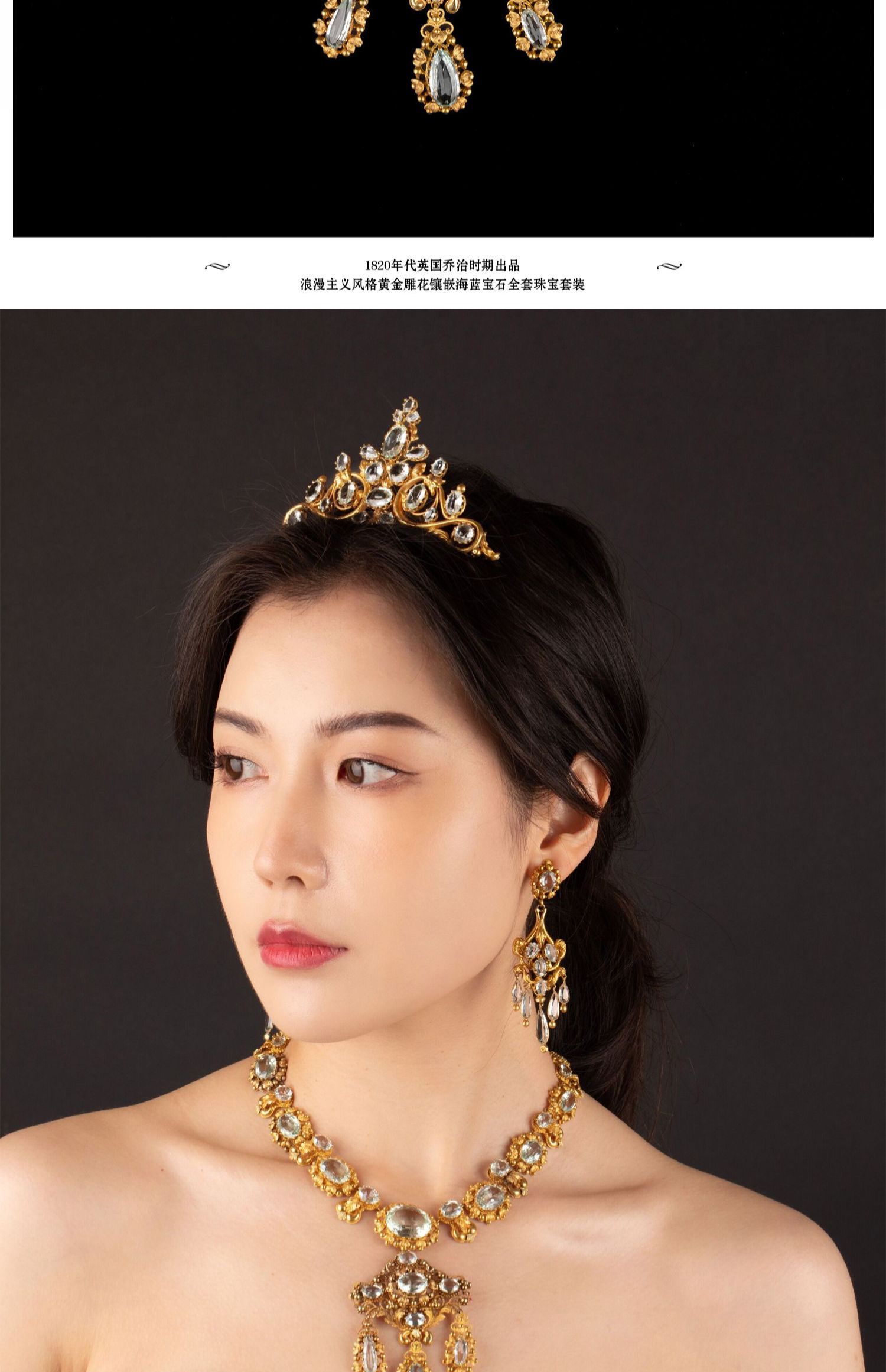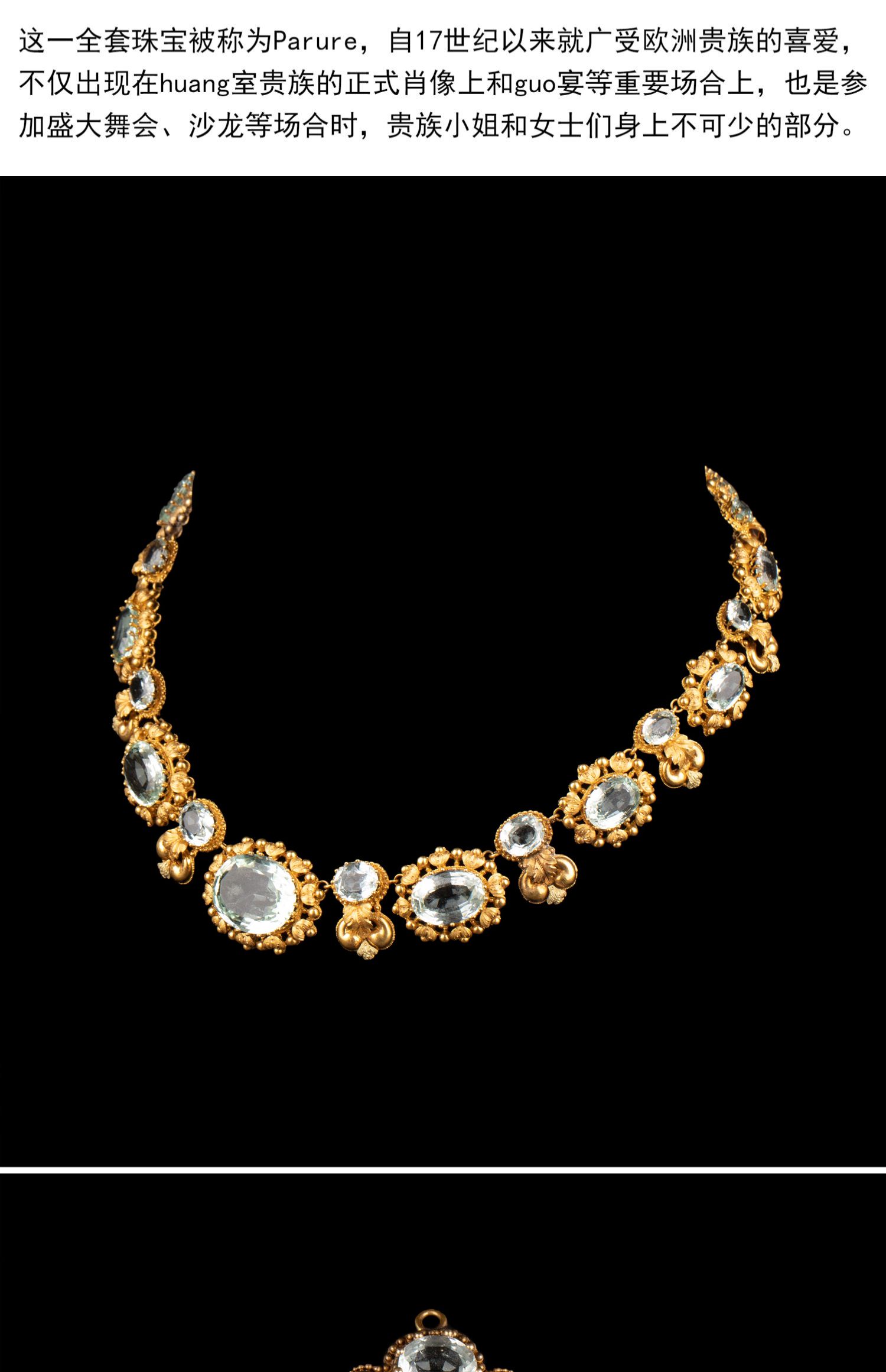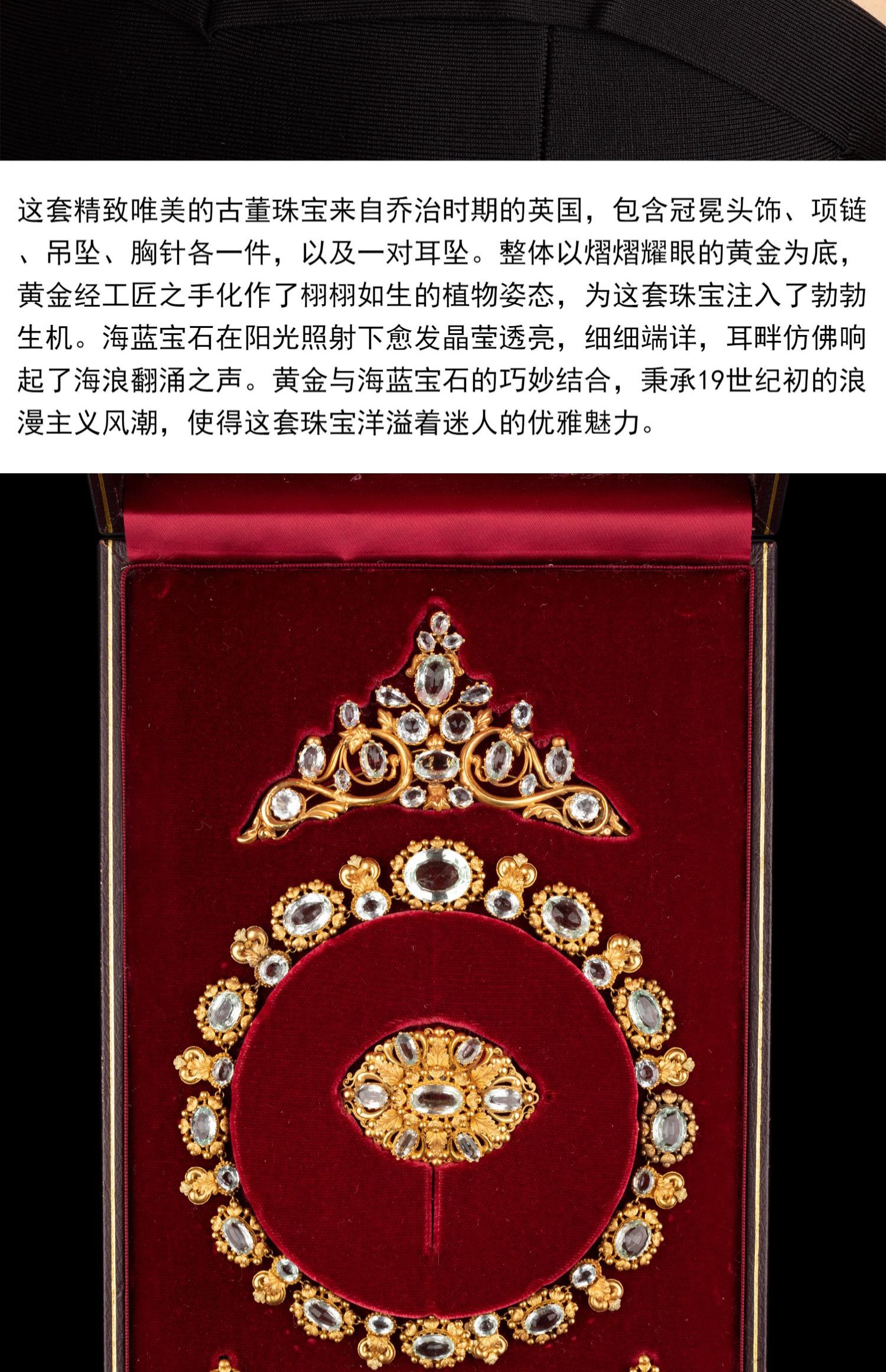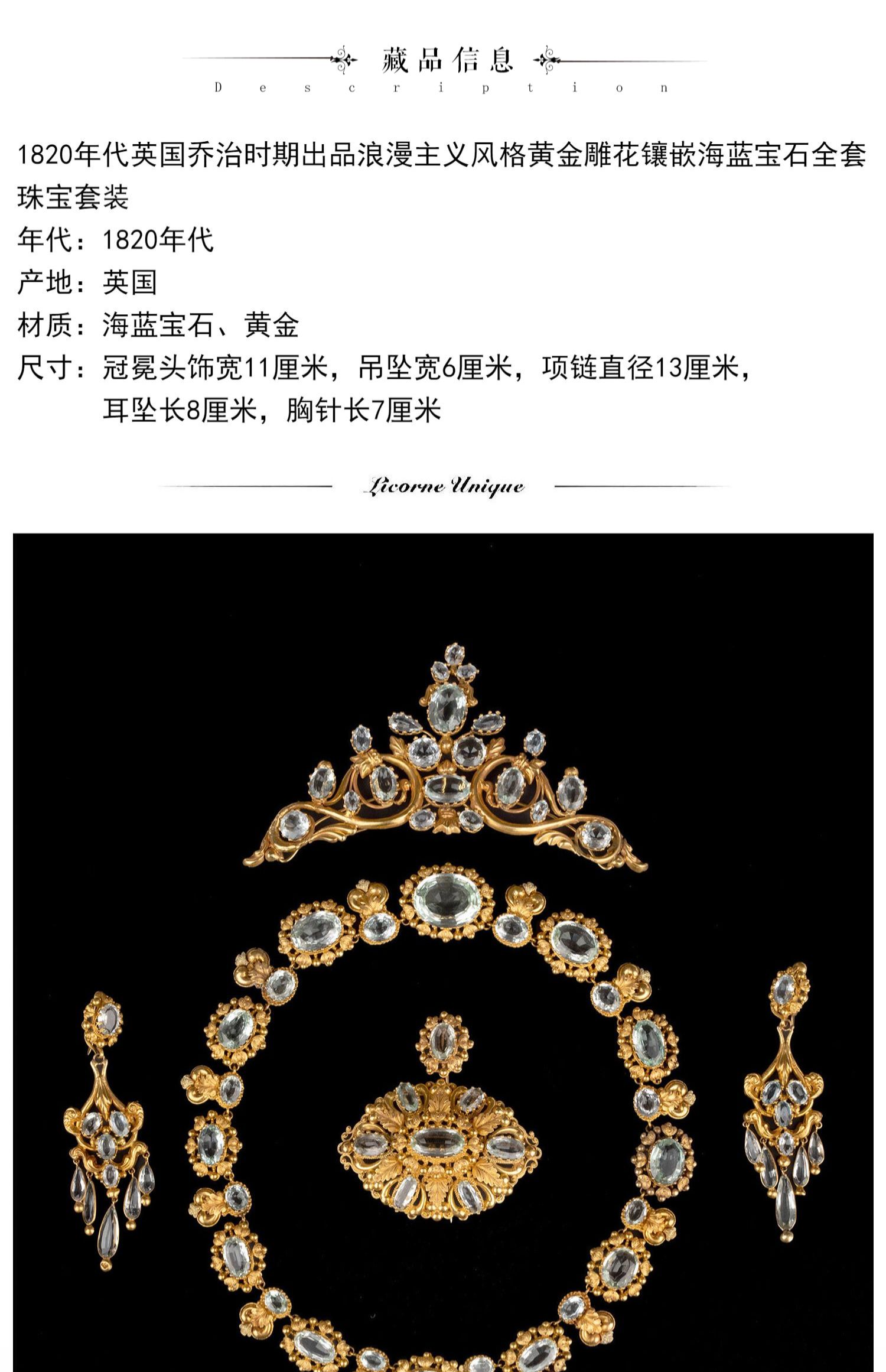 独角鹿西洋古董珠宝首饰套装浪漫主义风格黄金雕花镶嵌海蓝宝石
