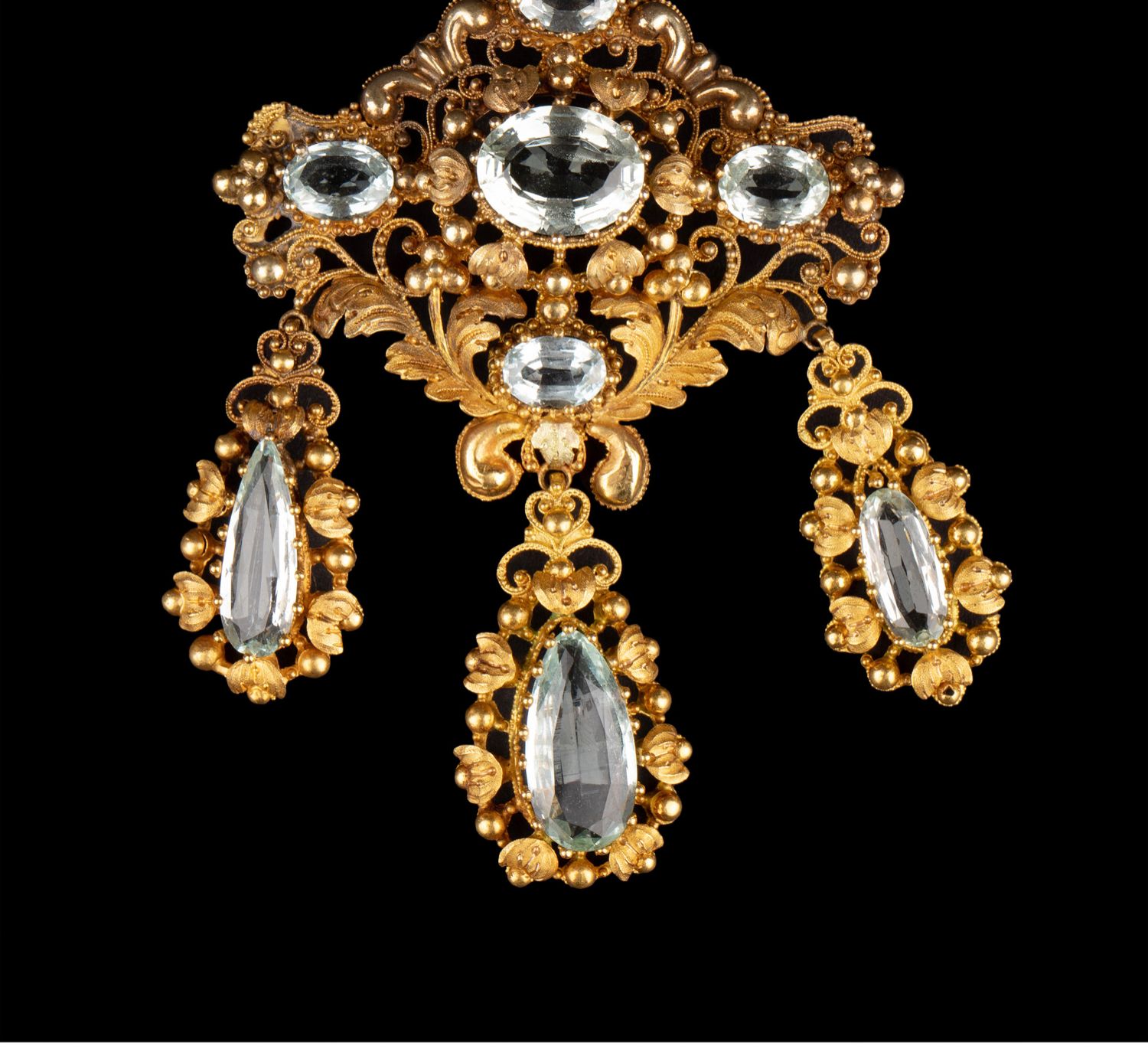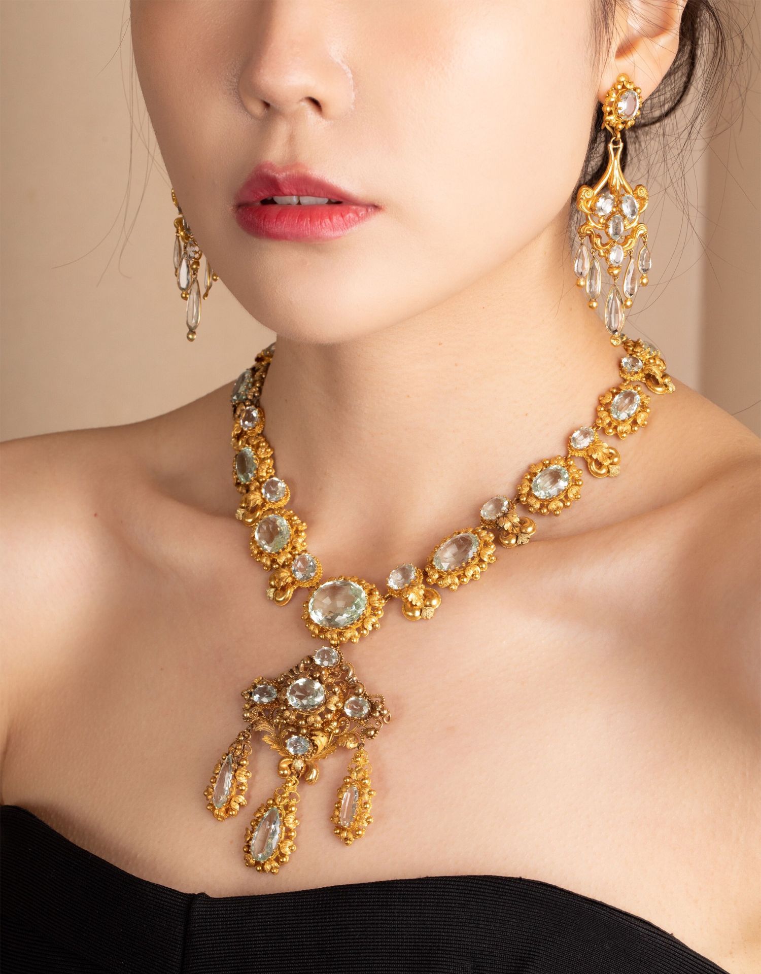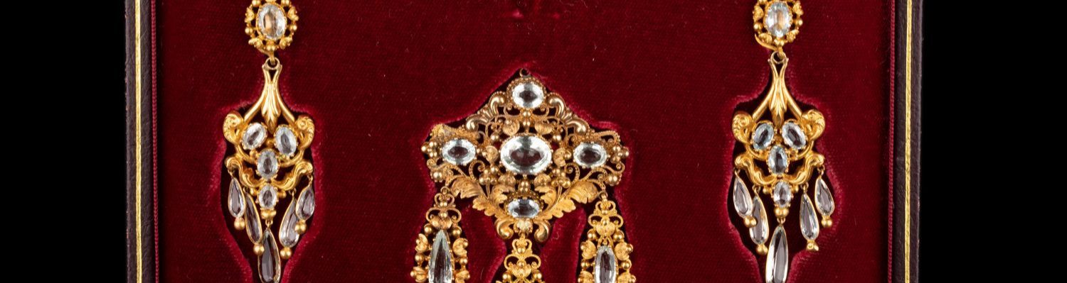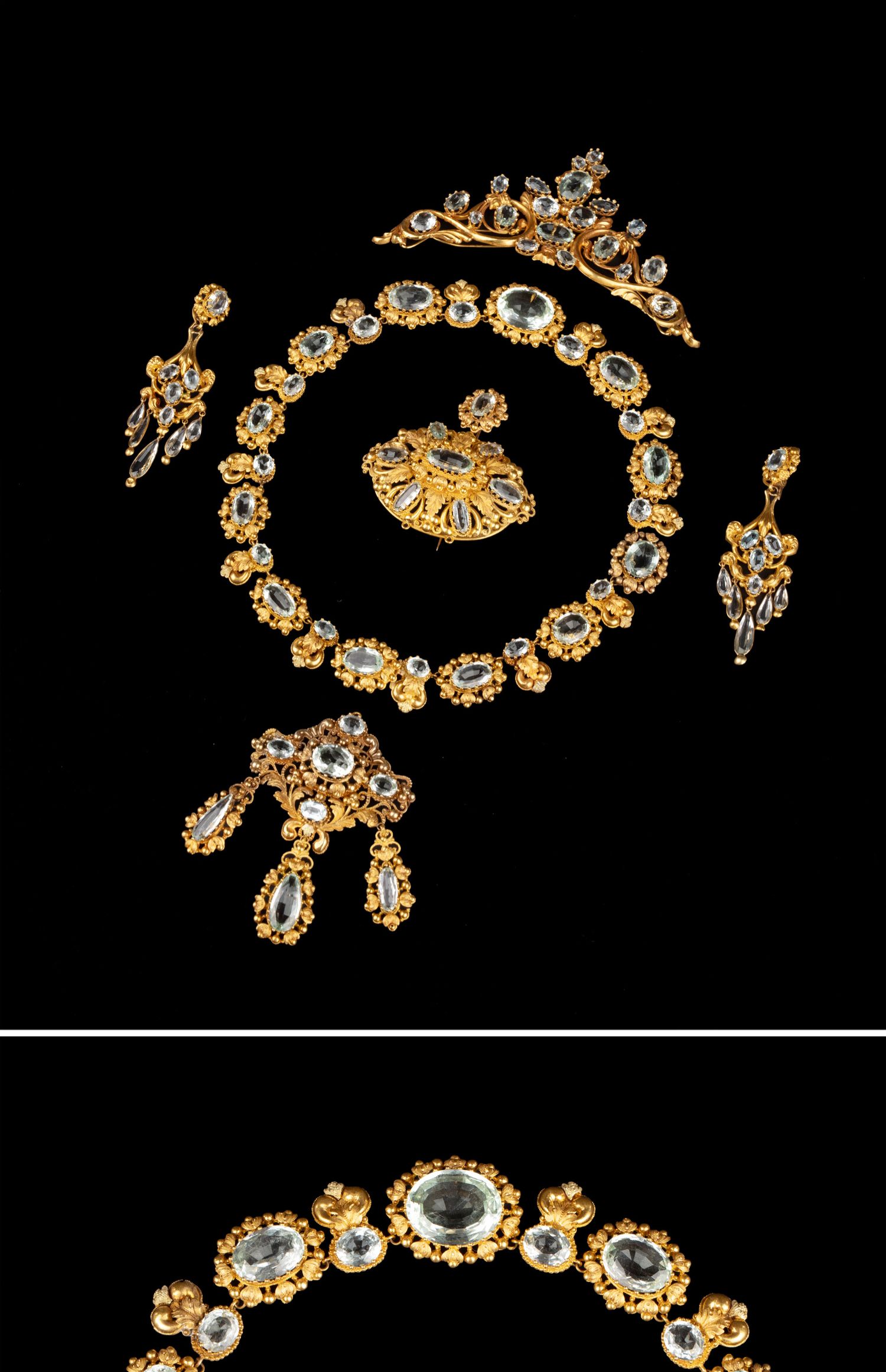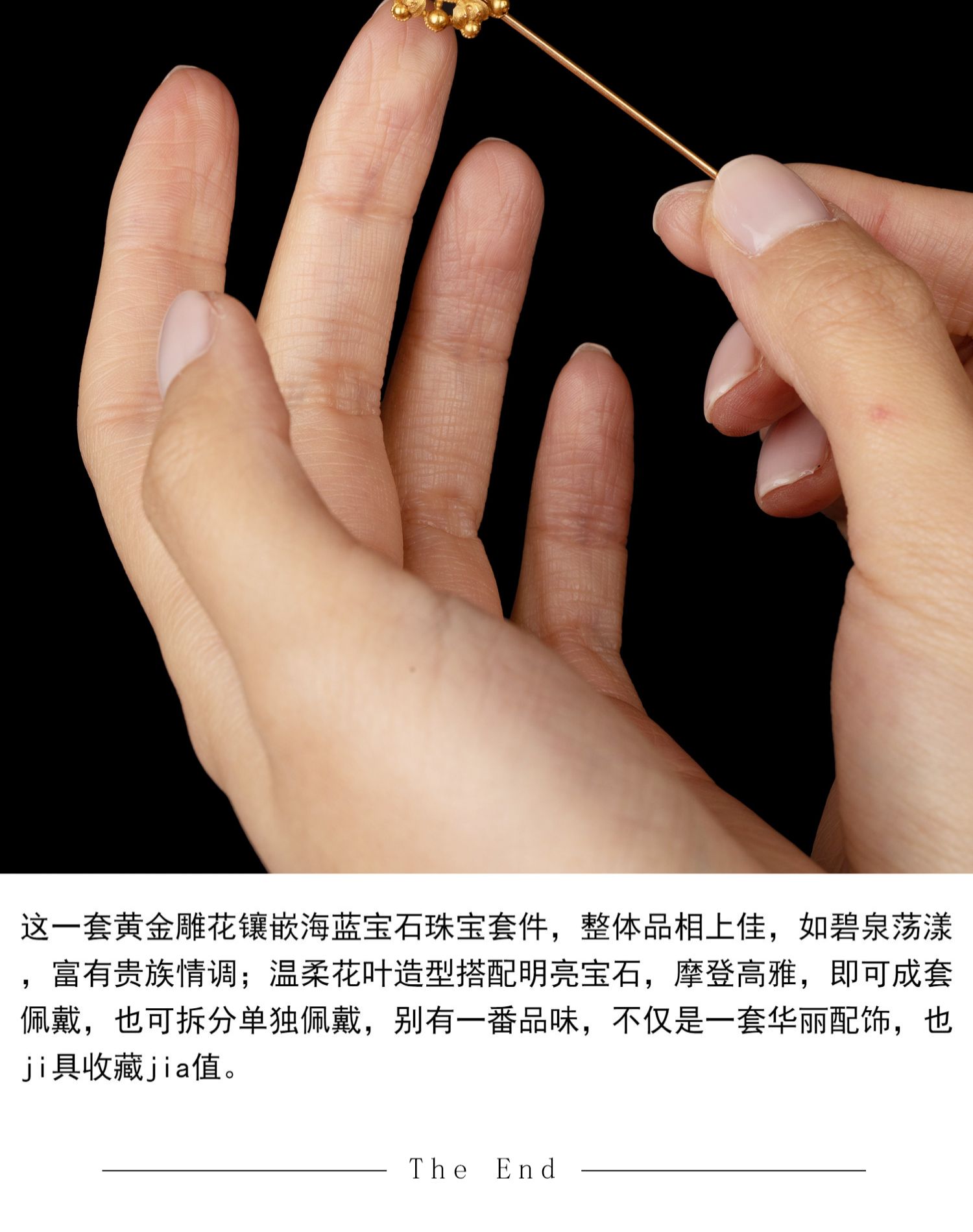 独角鹿西洋古董珠宝首饰套装浪漫主义风格黄金雕花镶嵌海蓝宝石