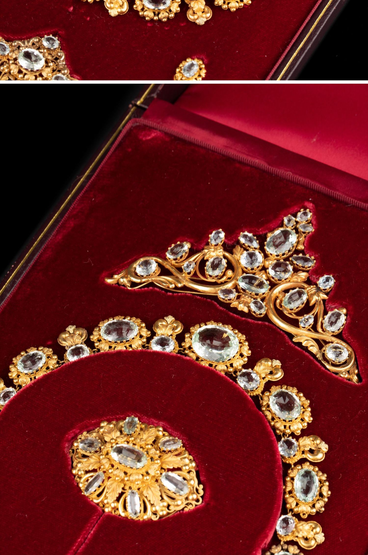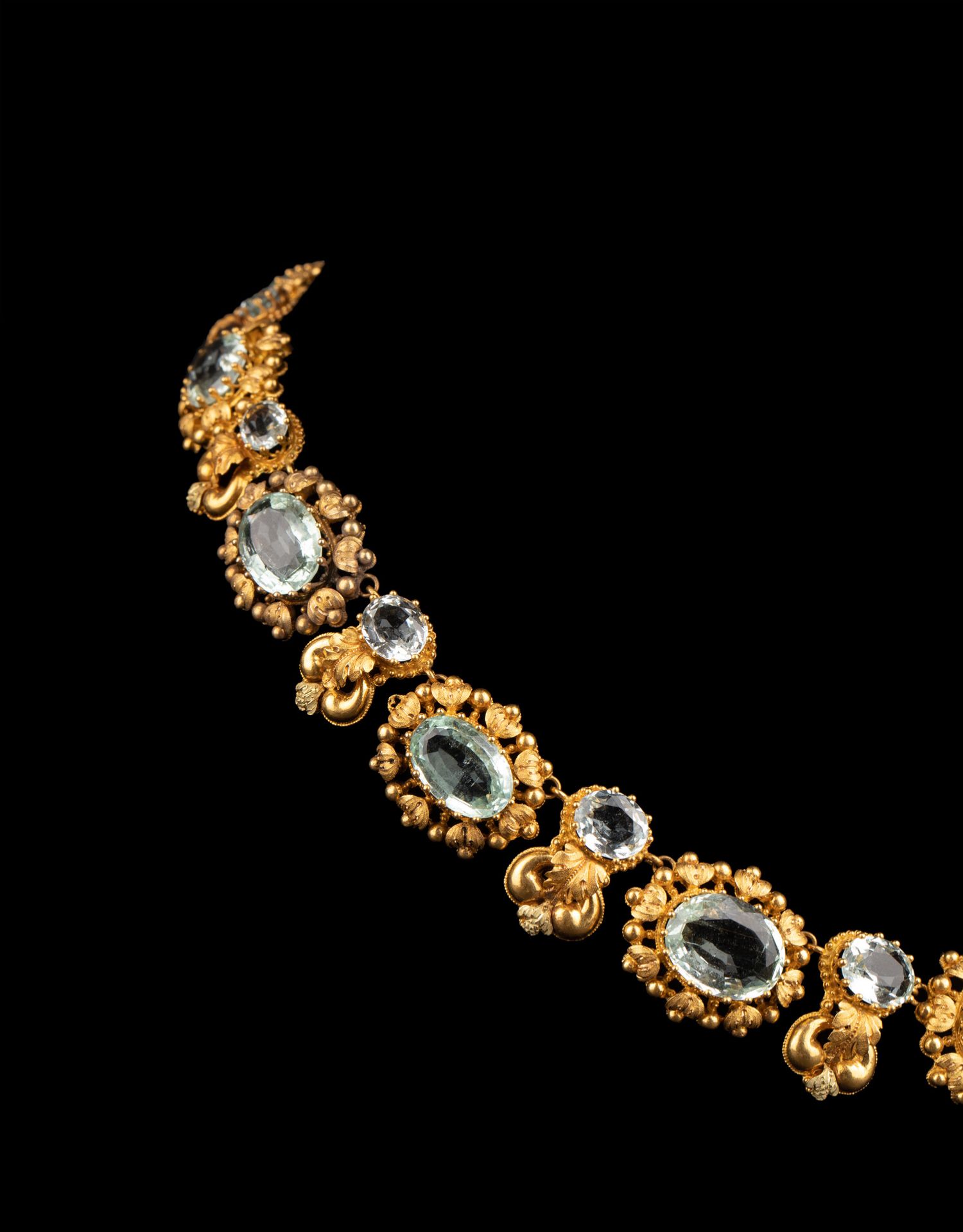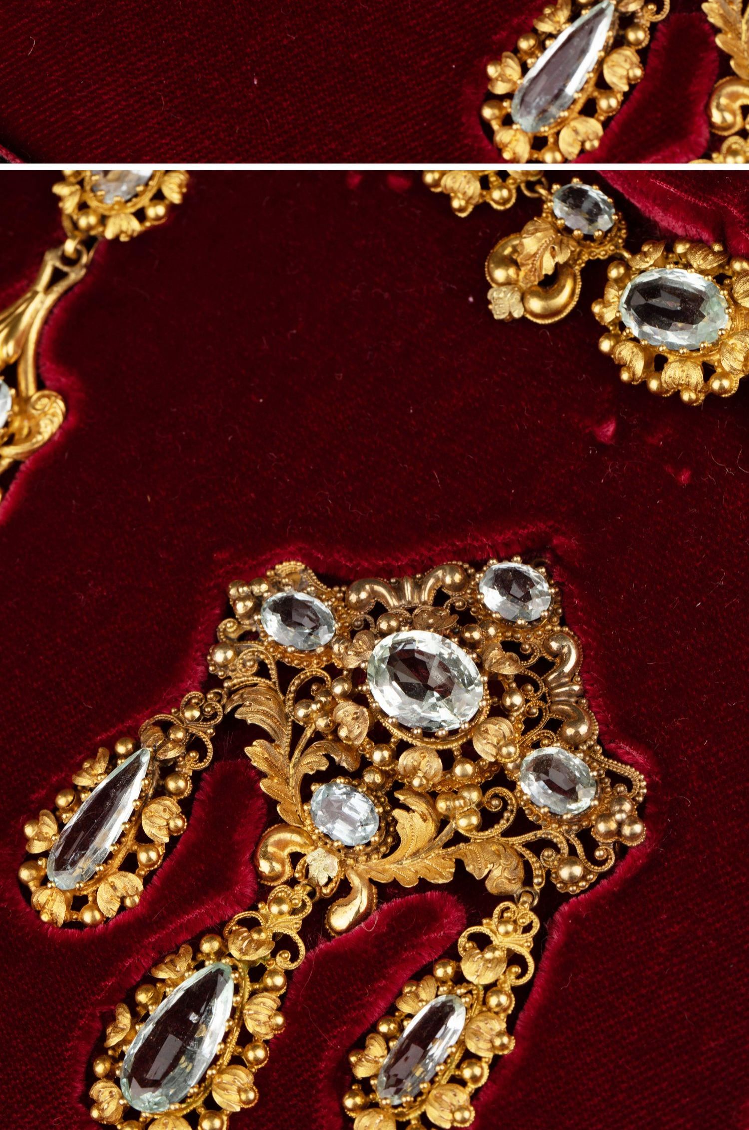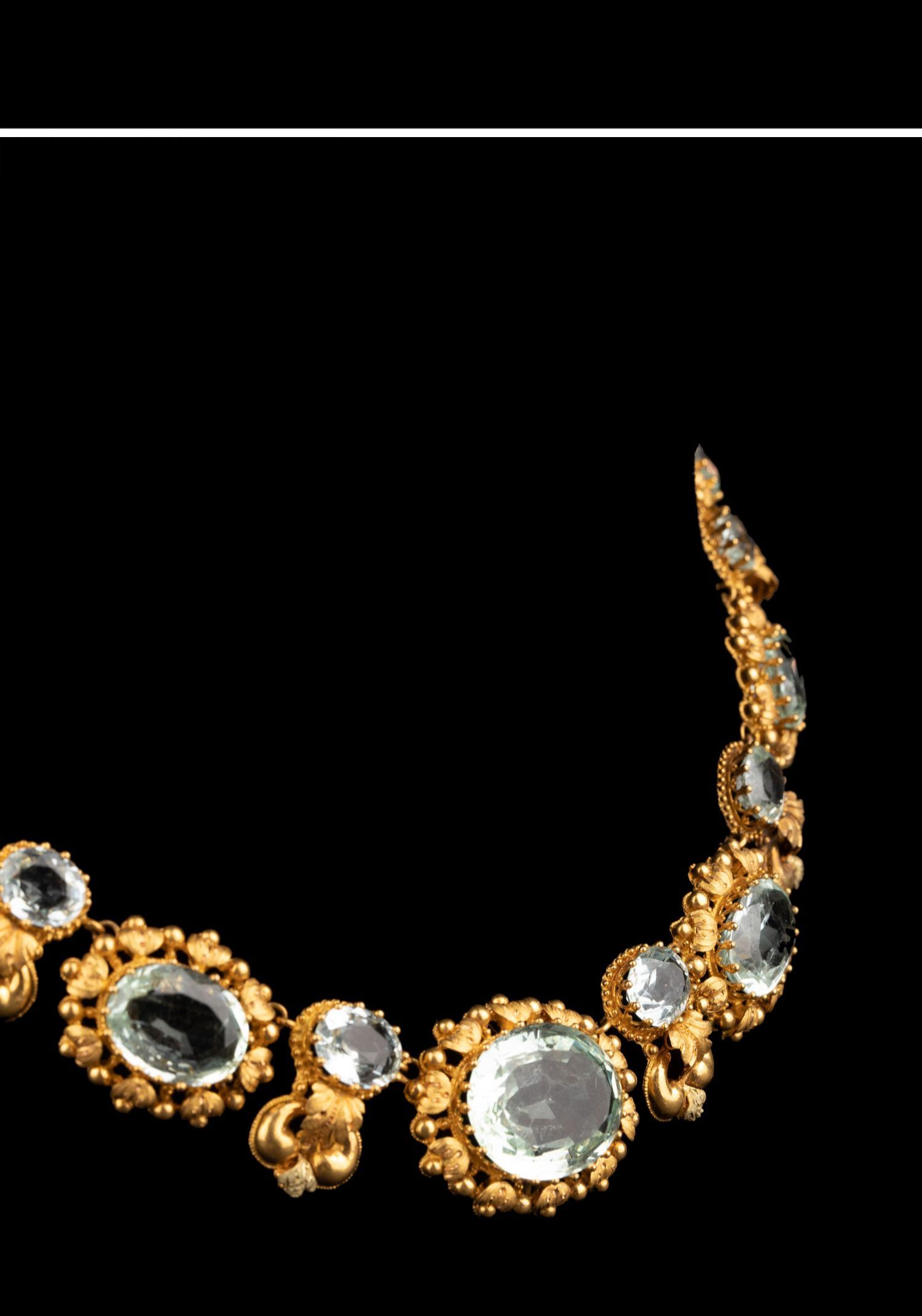 独角鹿西洋古董珠宝首饰套装浪漫主义风格黄金雕花镶嵌海蓝宝石