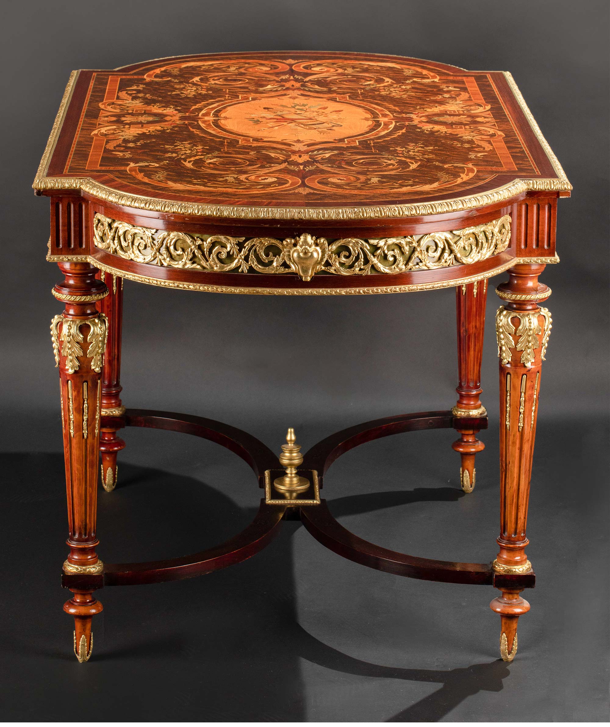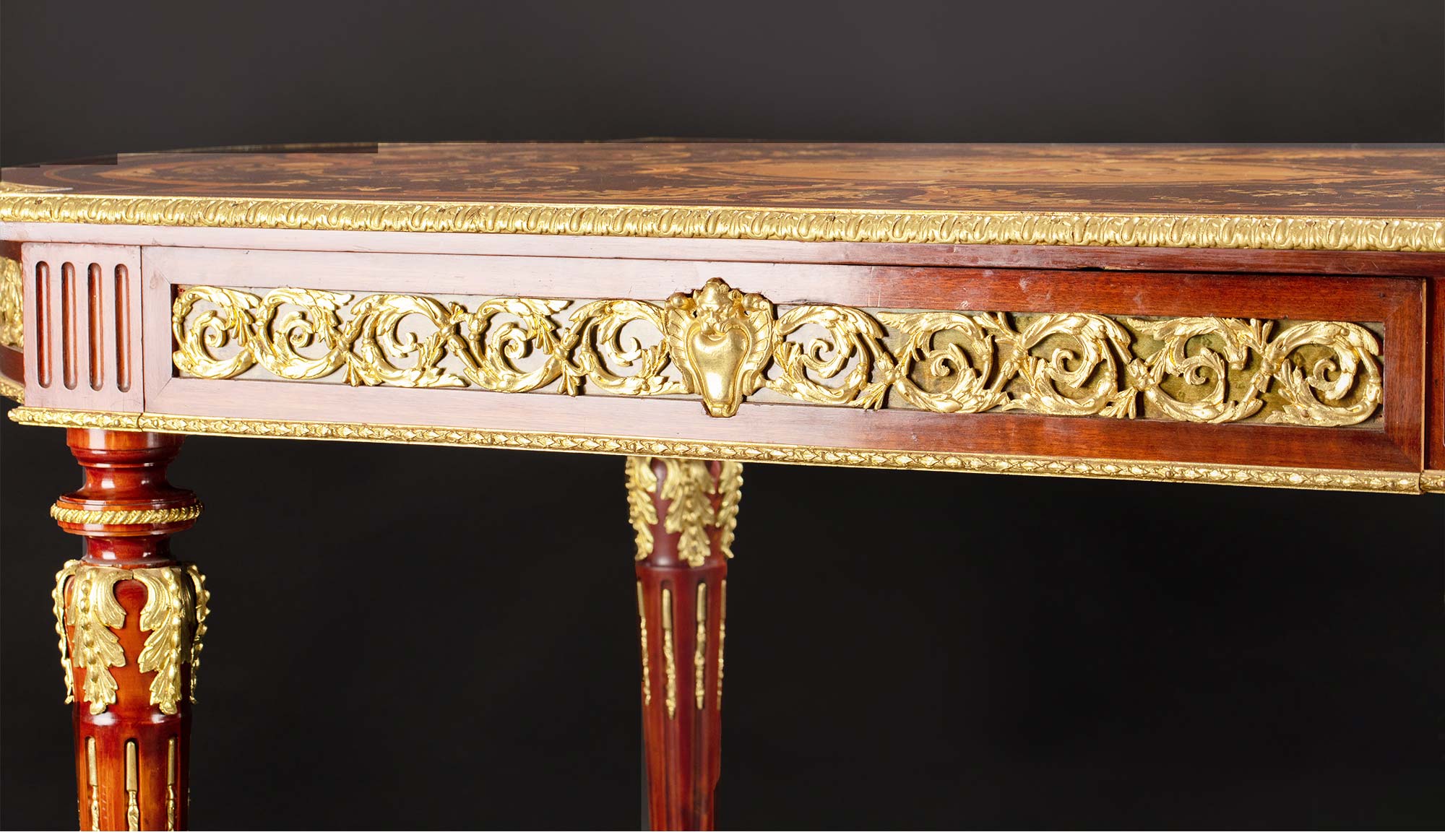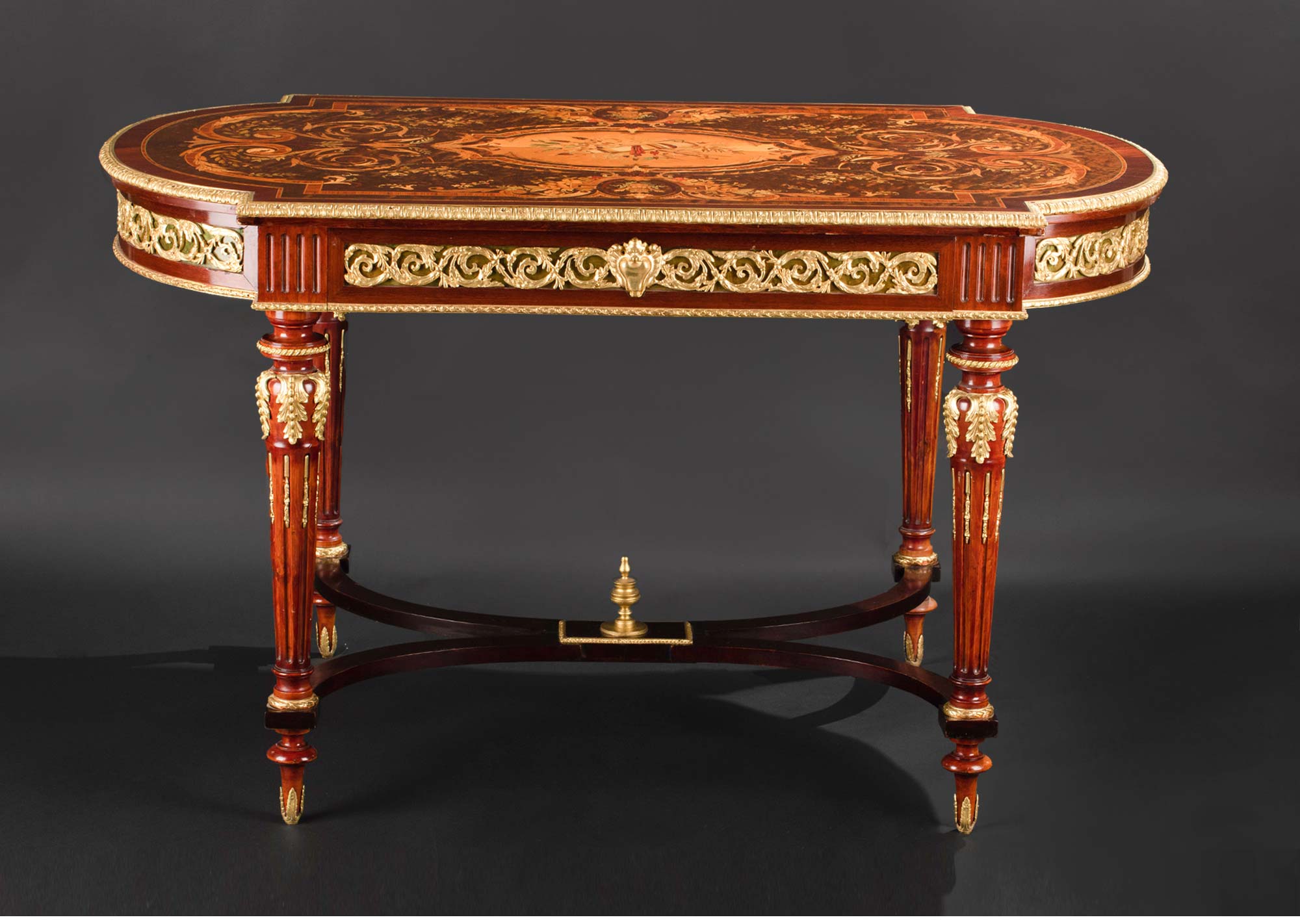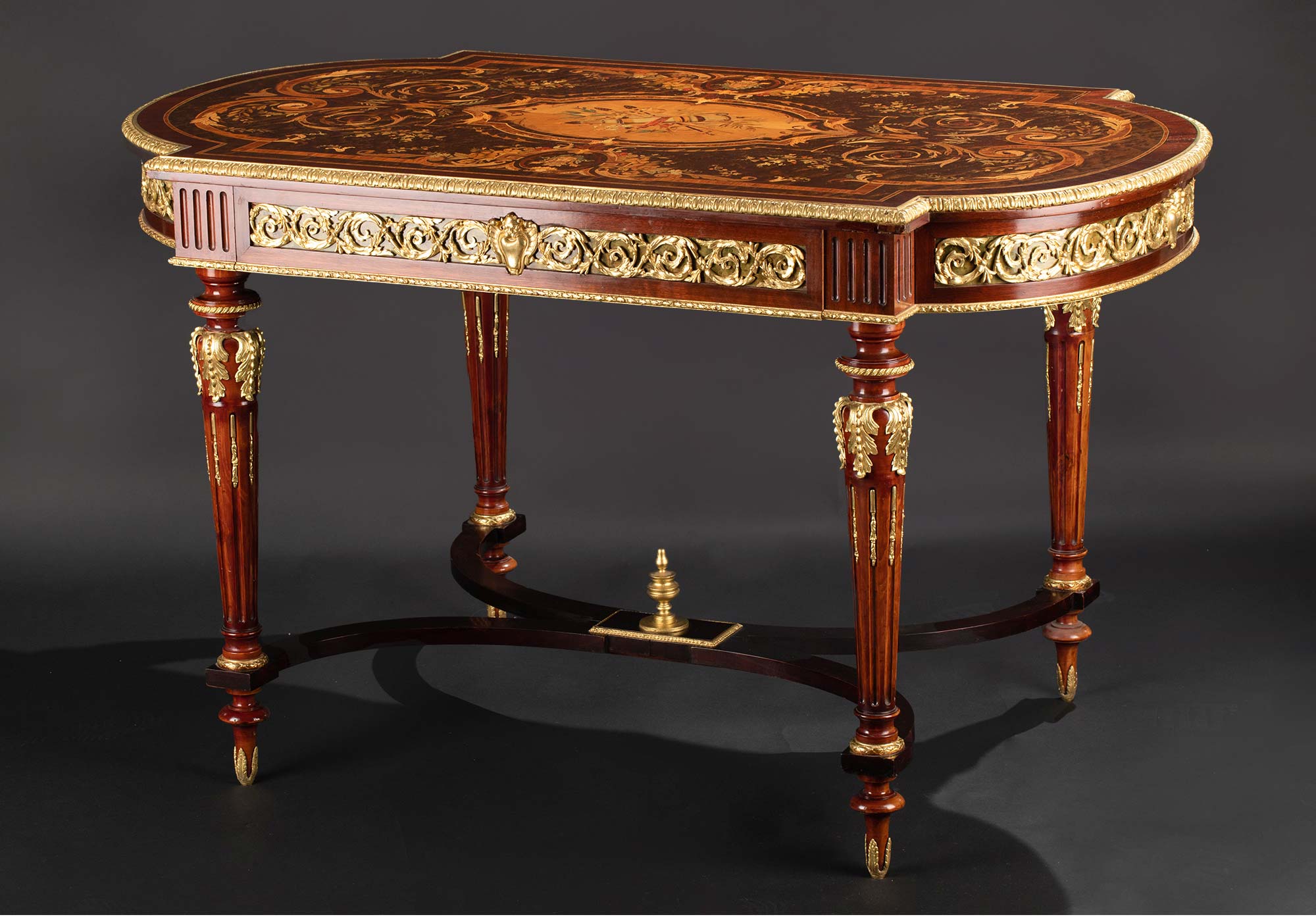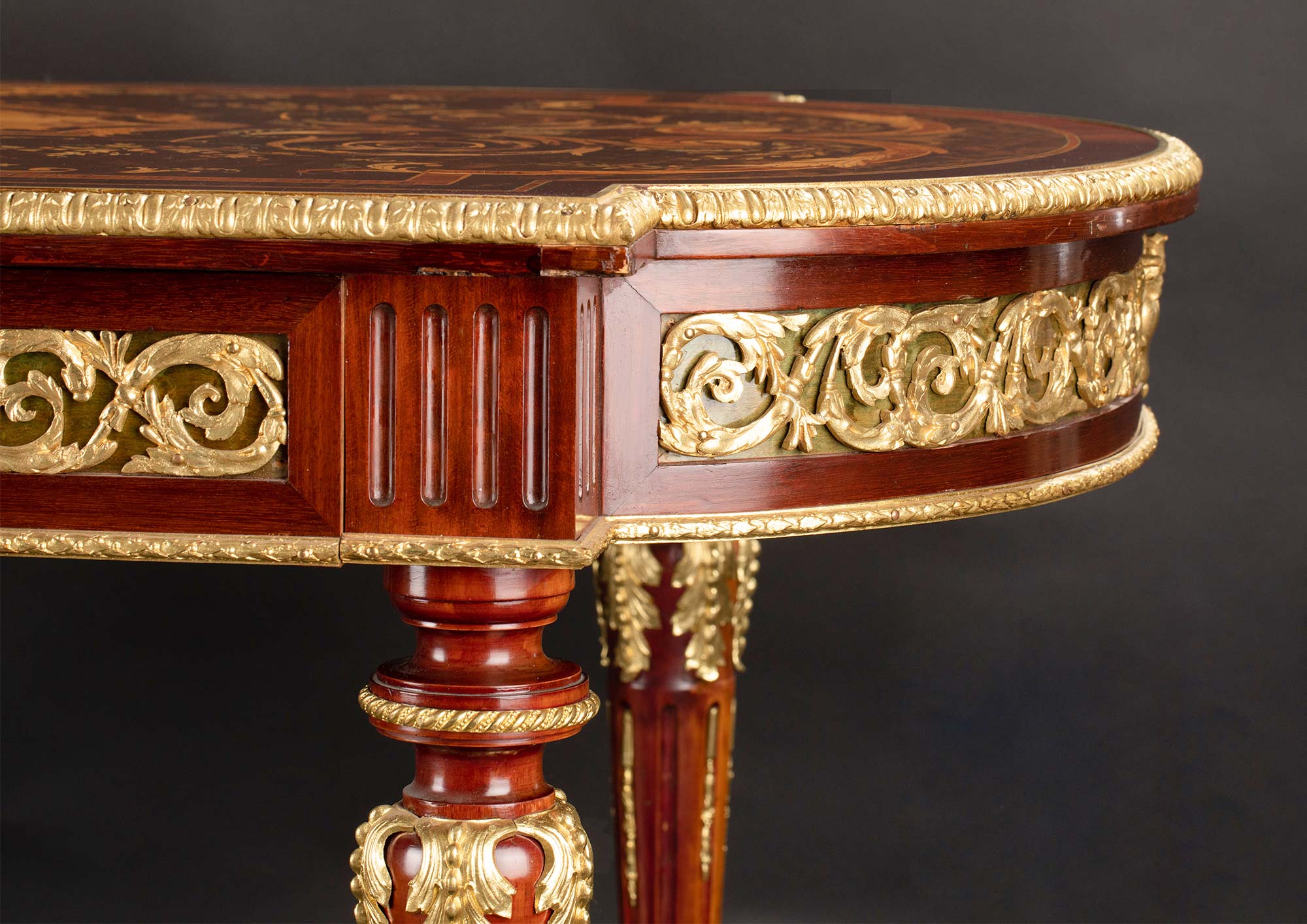 1860年代法国出品路易十六风格铜鎏金雕花古典花叶纹细木镶嵌装饰绿水晶圆形写字桌