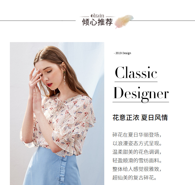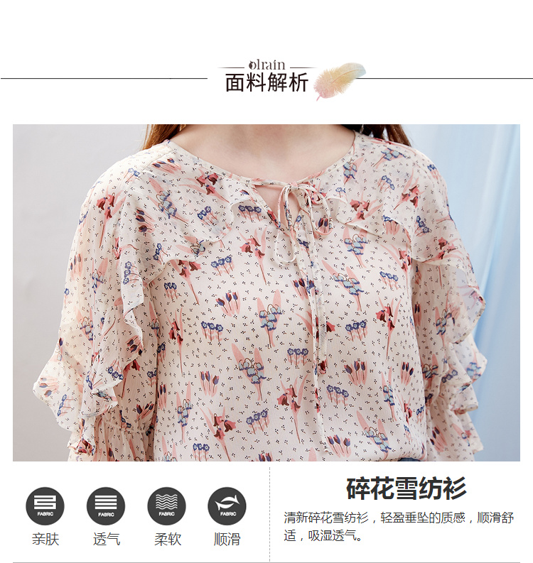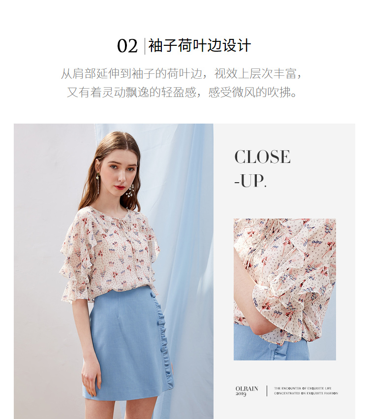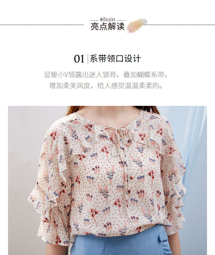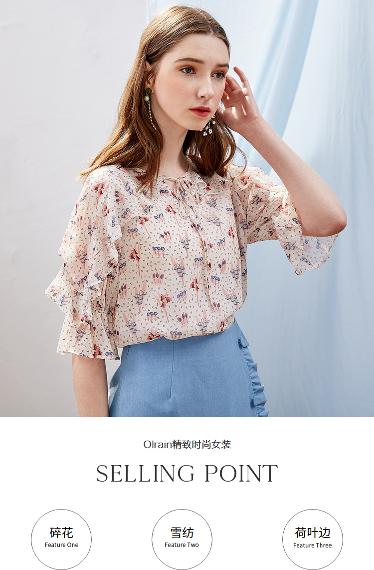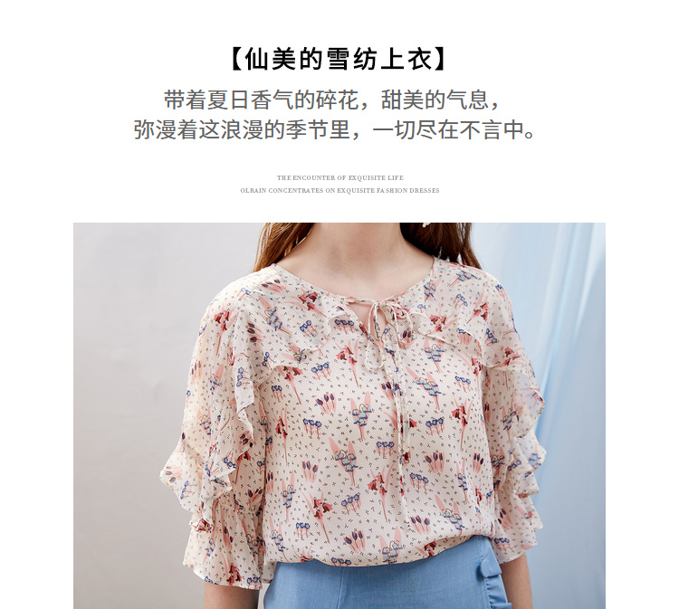 欧芮儿2019新款女装夏装碎花雪纺衫女短袖百搭系带荷叶边洋气小衫