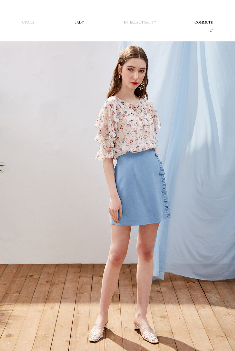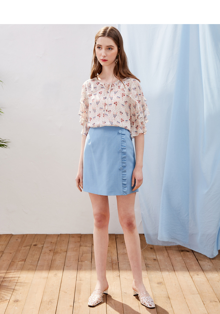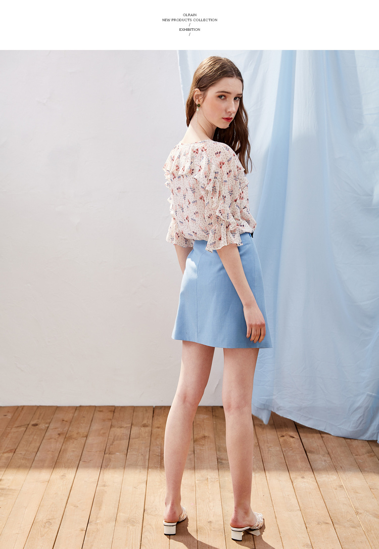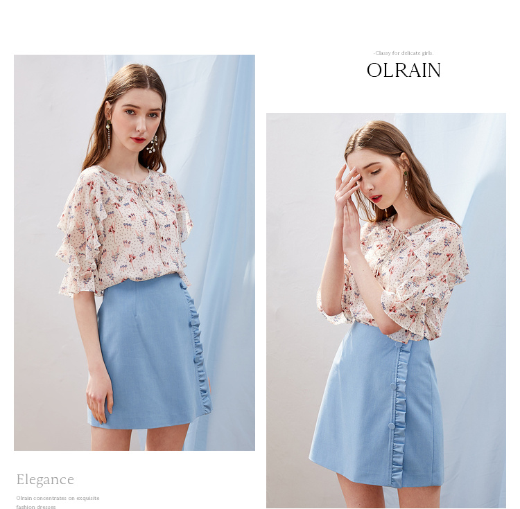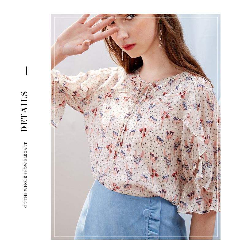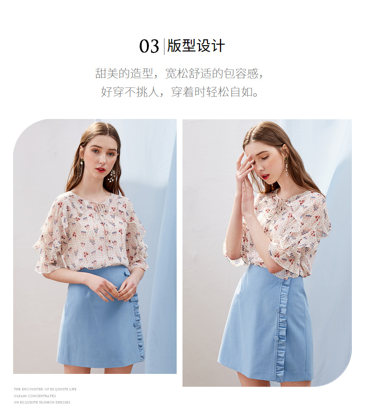 欧芮儿2019新款女装夏装碎花雪纺衫女短袖百搭系带荷叶边洋气小衫