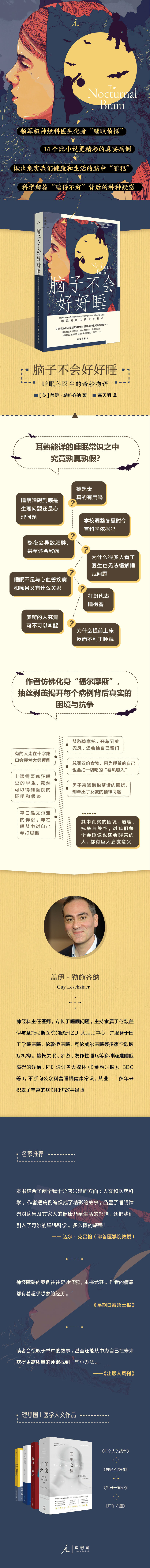 作者是神经/睡眠科的主任医生,二十几年一直受训、供职于相关领域执牛耳的医学机构(帝国理工医学院、英国国立神经内外科医院、惠康桑格研究所、盖伊医院睡眠中心……),乃至担当领军人物,拥有傲人的学术成果和丰富的病例积累,同时又具备通过BBC等媒体向公众科普、讲故事的多年经验和特色鲜明的英式幽默感。在本书中,作者同时发挥了专业和叙事两方面的长处,将奇妙故事和神经机理巧妙结合,读来令人大开眼界、手不释卷。