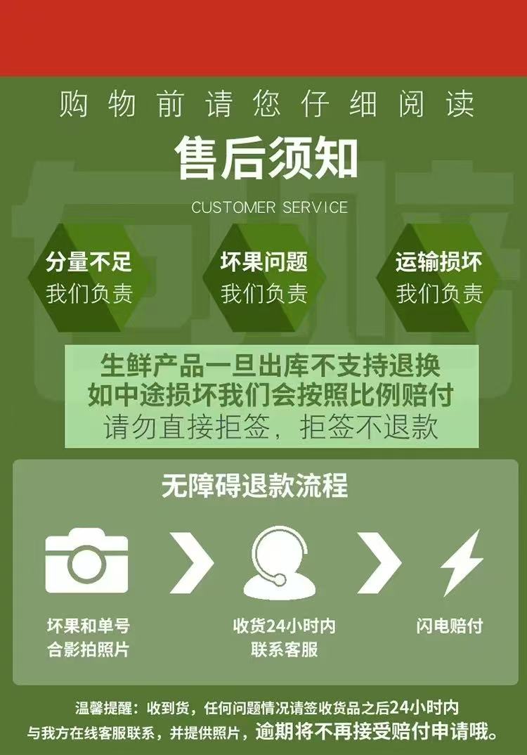 生鲜水果一旦发货,不接受退货,请勿拒收,如遇售后问题请先签收,并在24小时内,将坏果和快递单放一起拍照反馈卖家(坏果和快递单须在同一张照片内,不接受拼图,单号须清晰可见),提供照片后闪电赔付。