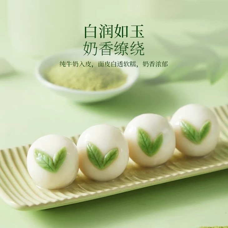 面皮白润如玉,奶香浓郁,龙井茶粉和白芸豆巧妙融合入馅;