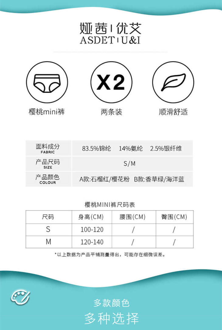 预售|优艾 樱桃Mini裤 娅茜优艾3D无缝女童三角内裤 2条/盒 .潮快闪[福利品]