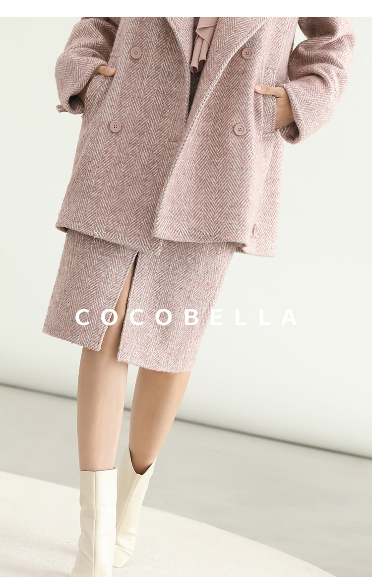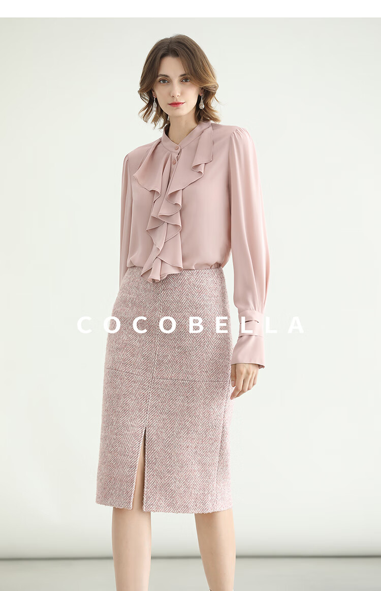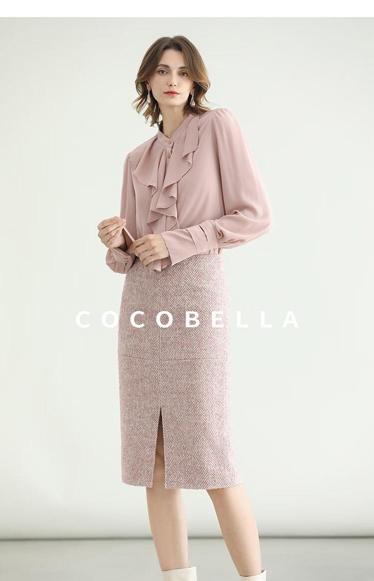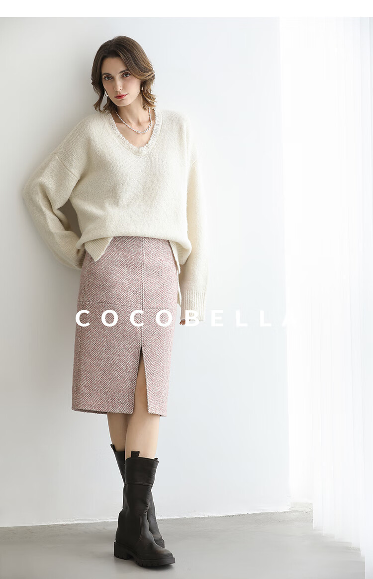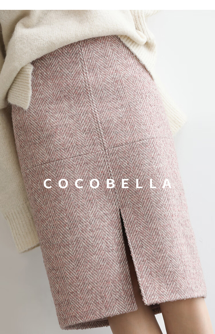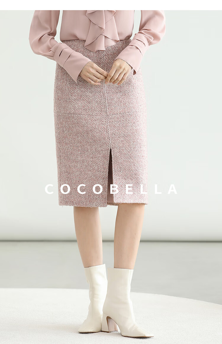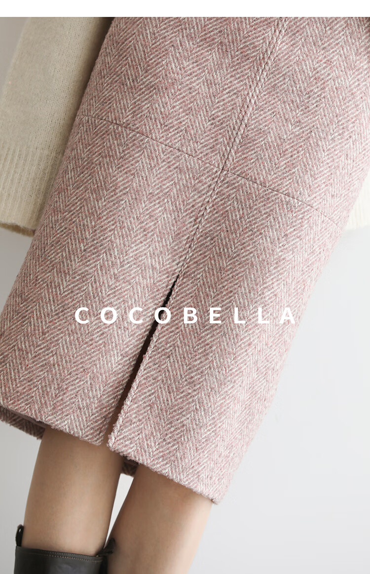 COCOBELLA气质粉色开叉高腰半身裙女秋冬通勤毛呢半裙HS0065
