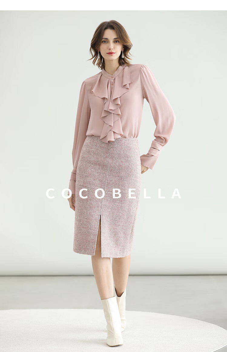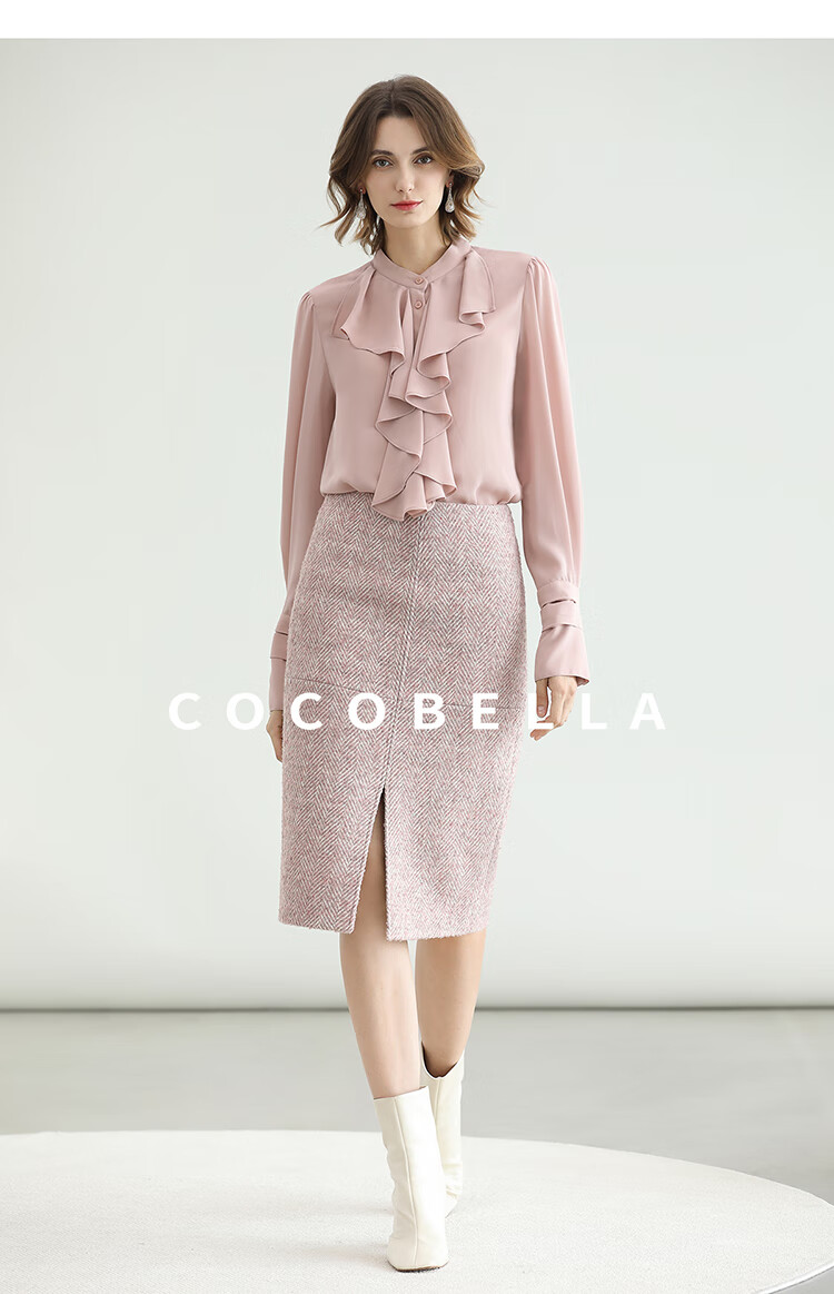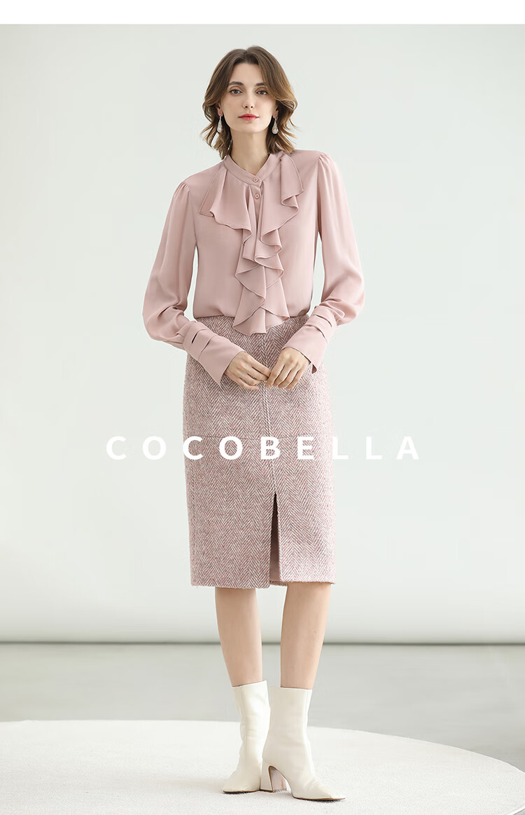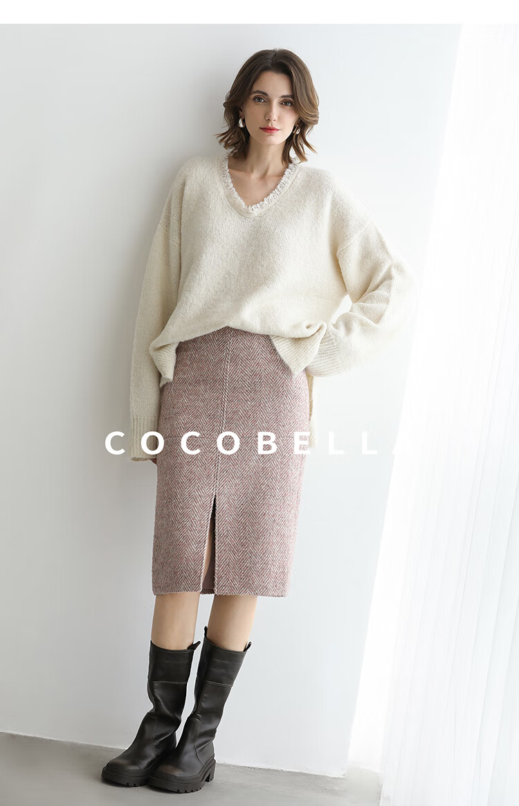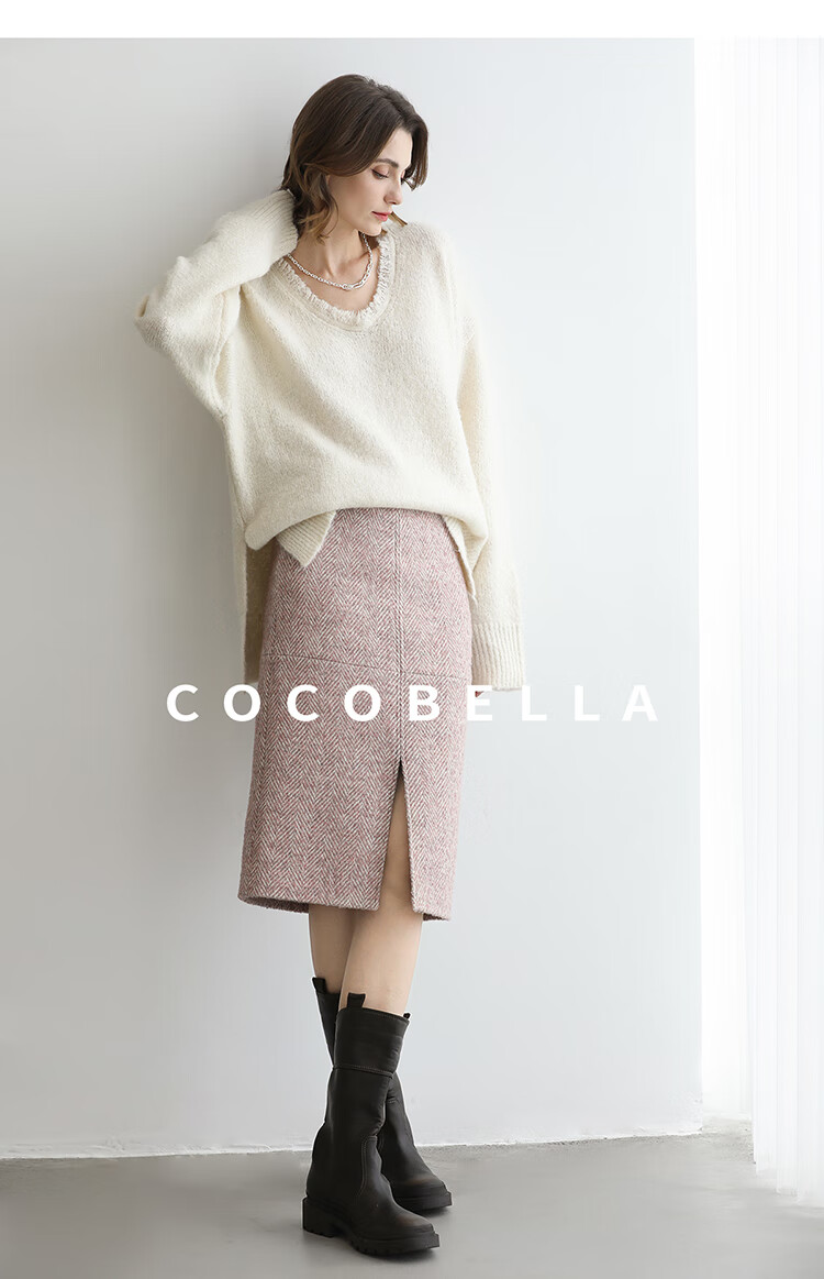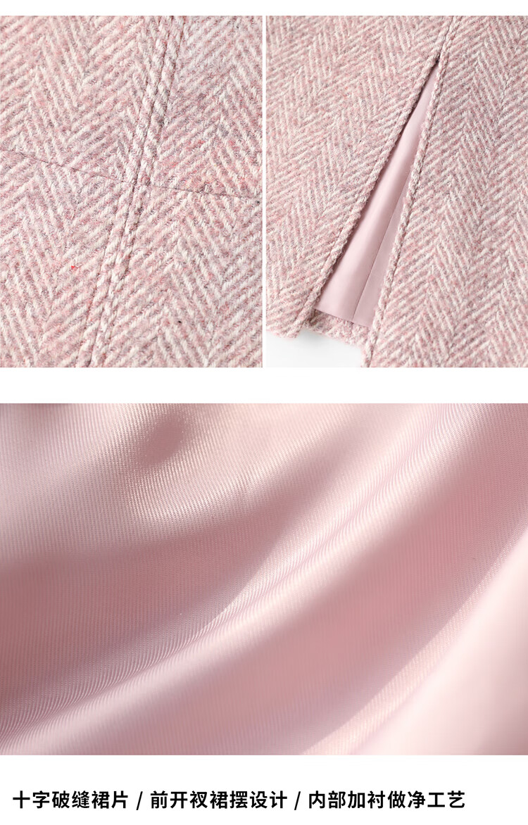 COCOBELLA气质粉色开叉高腰半身裙女秋冬通勤毛呢半裙HS0065