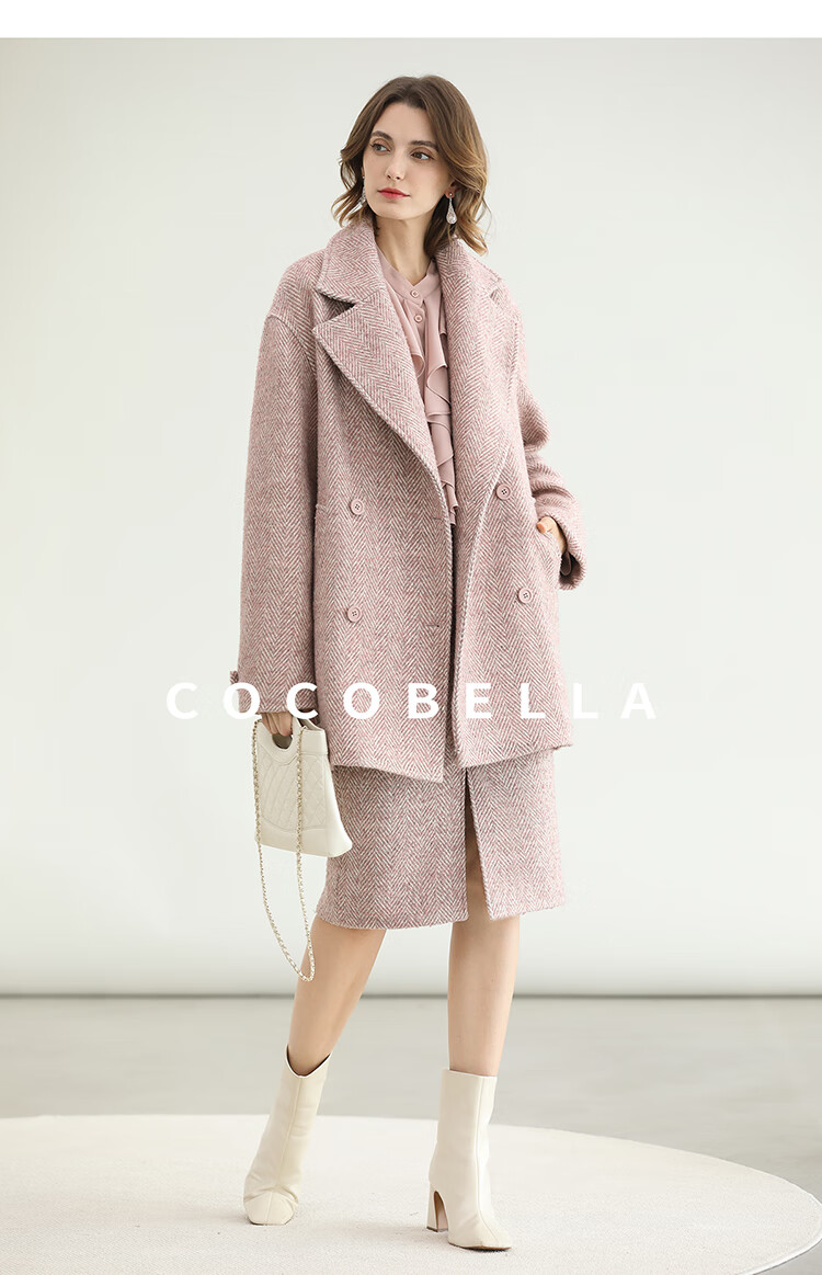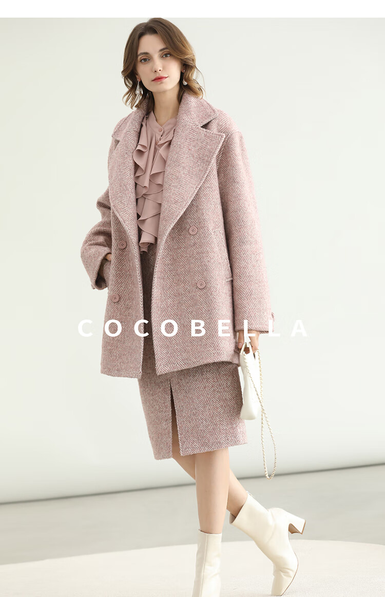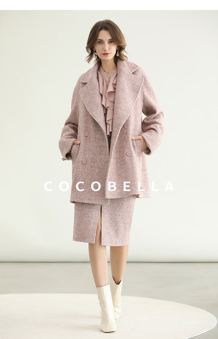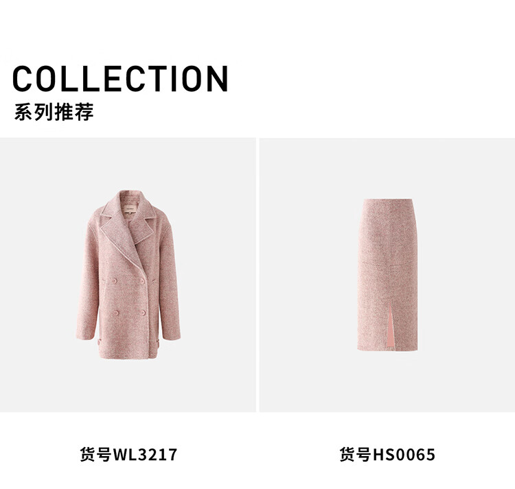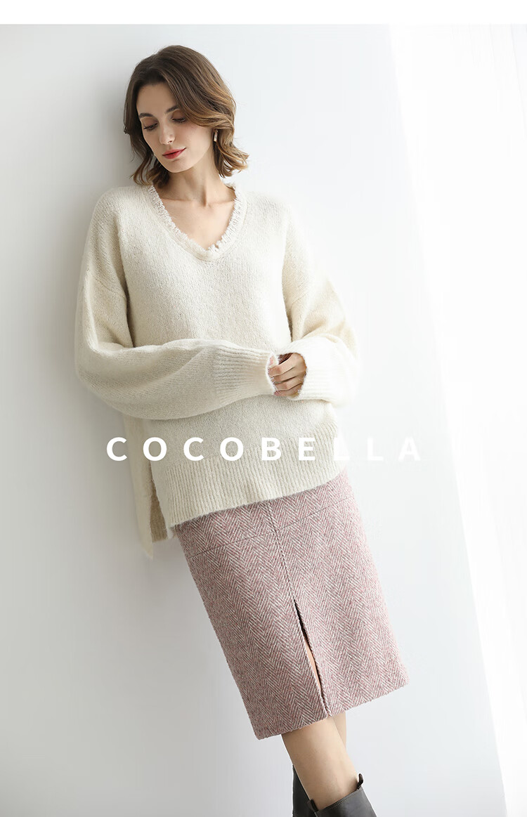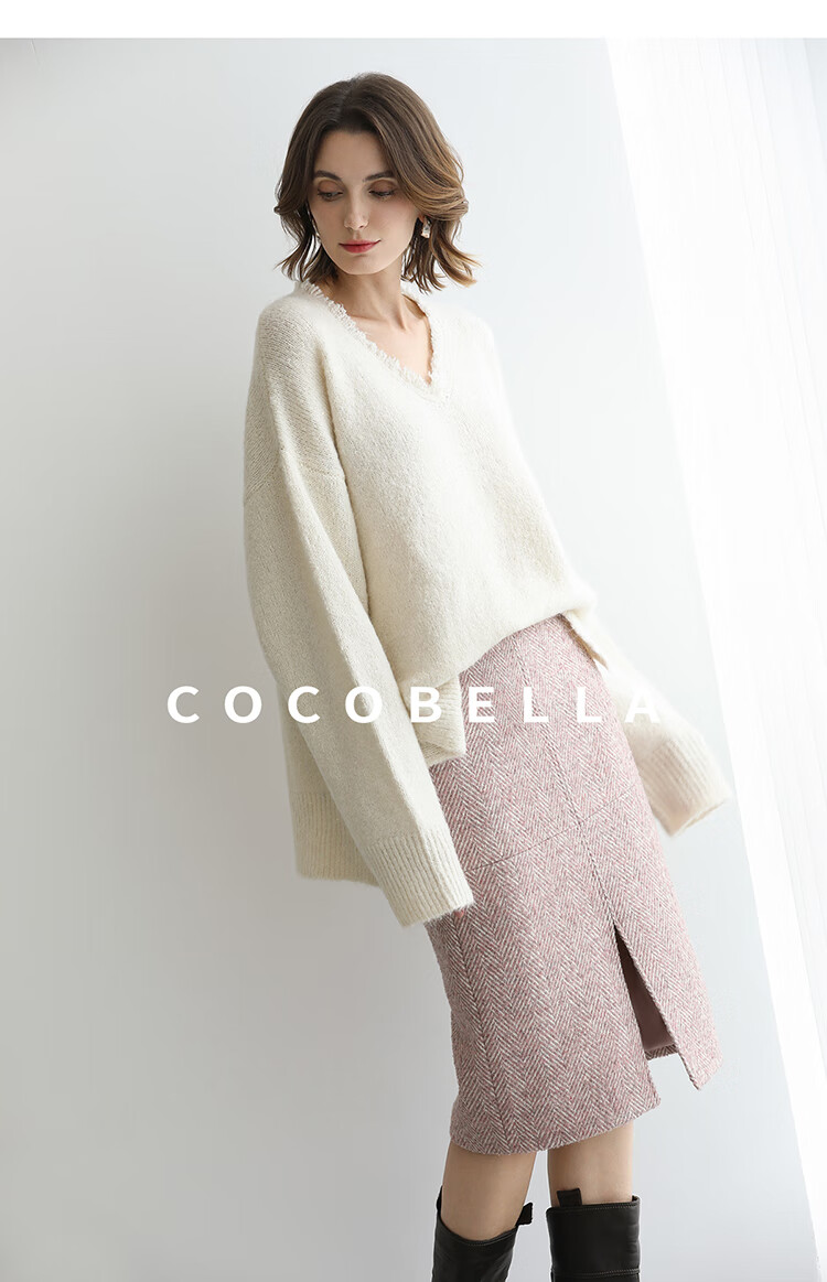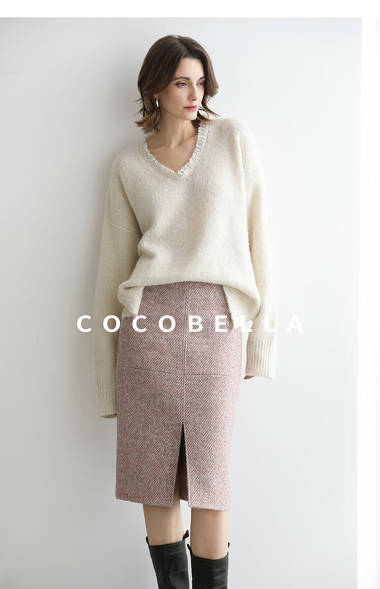 COCOBELLA气质粉色开叉高腰半身裙女秋冬通勤毛呢半裙HS0065