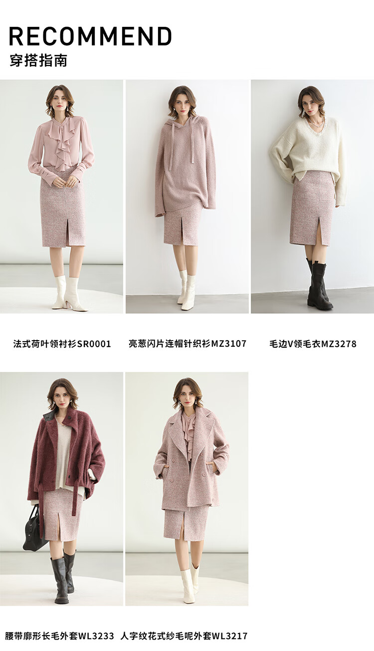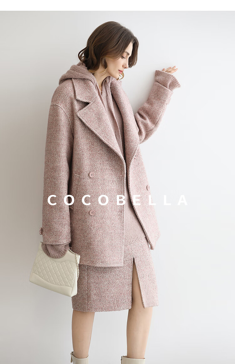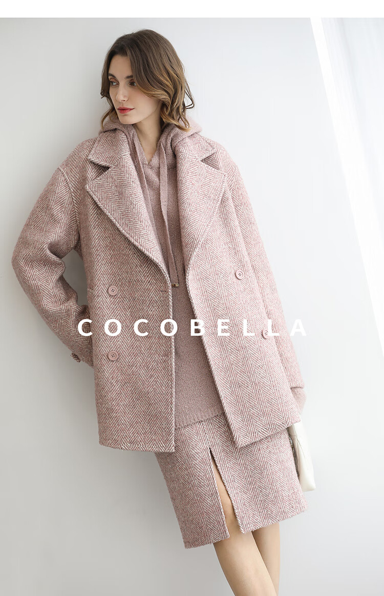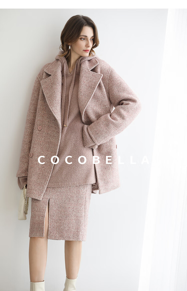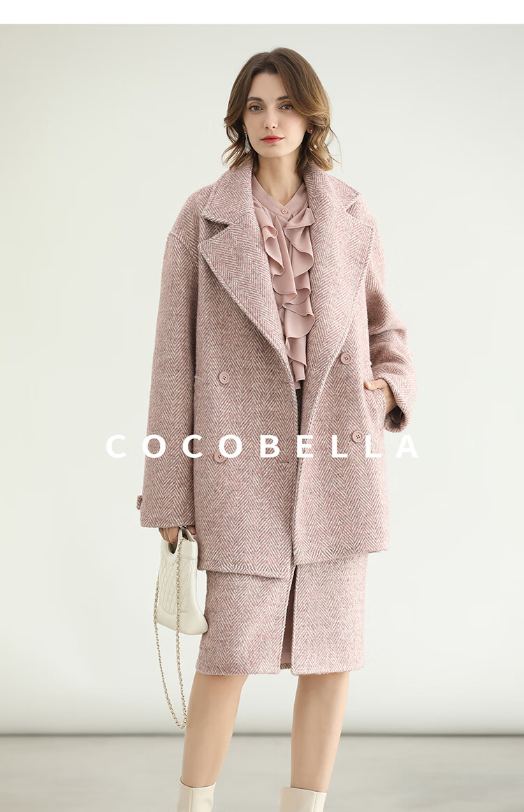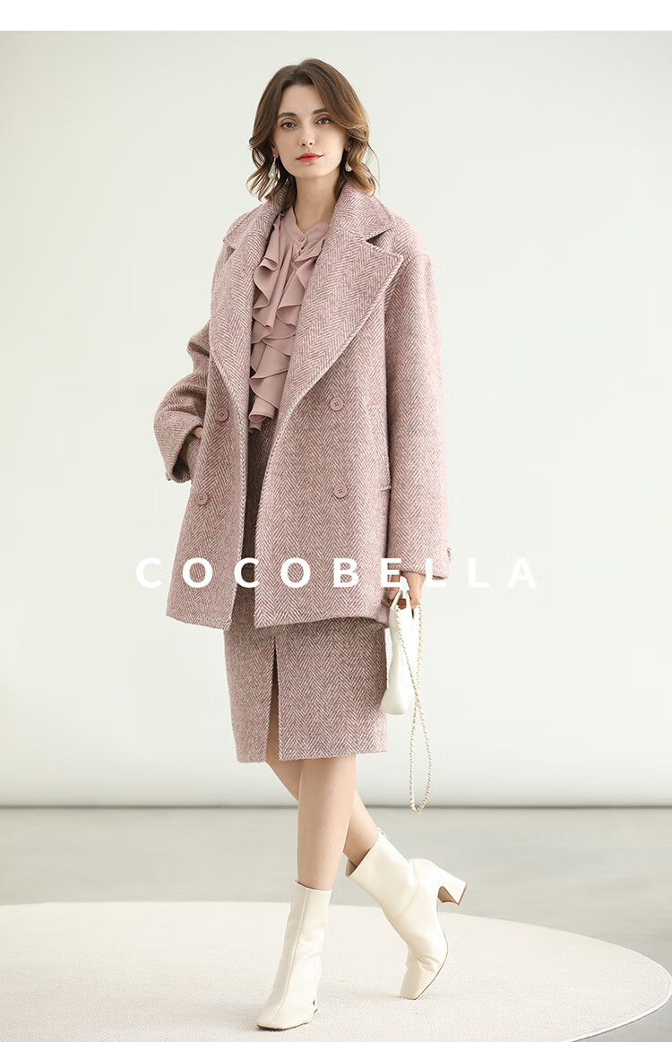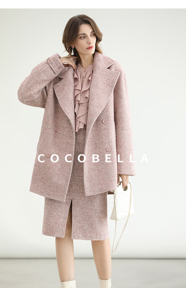 COCOBELLA气质粉色开叉高腰半身裙女秋冬通勤毛呢半裙HS0065
