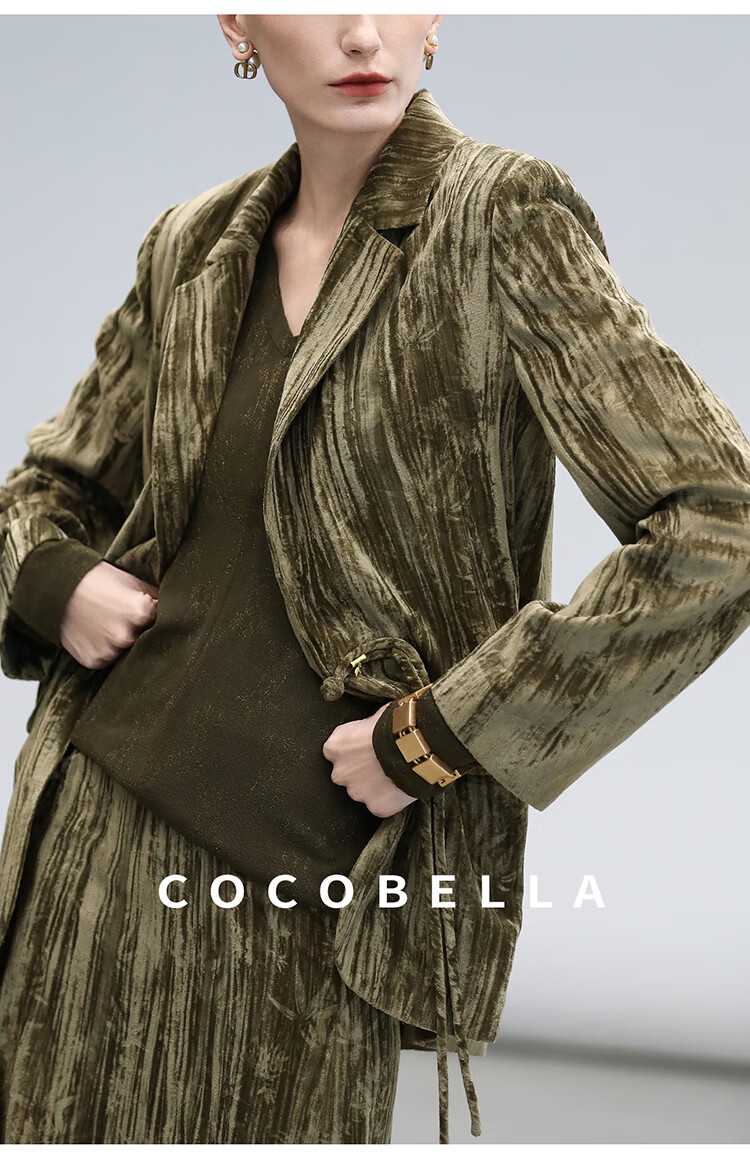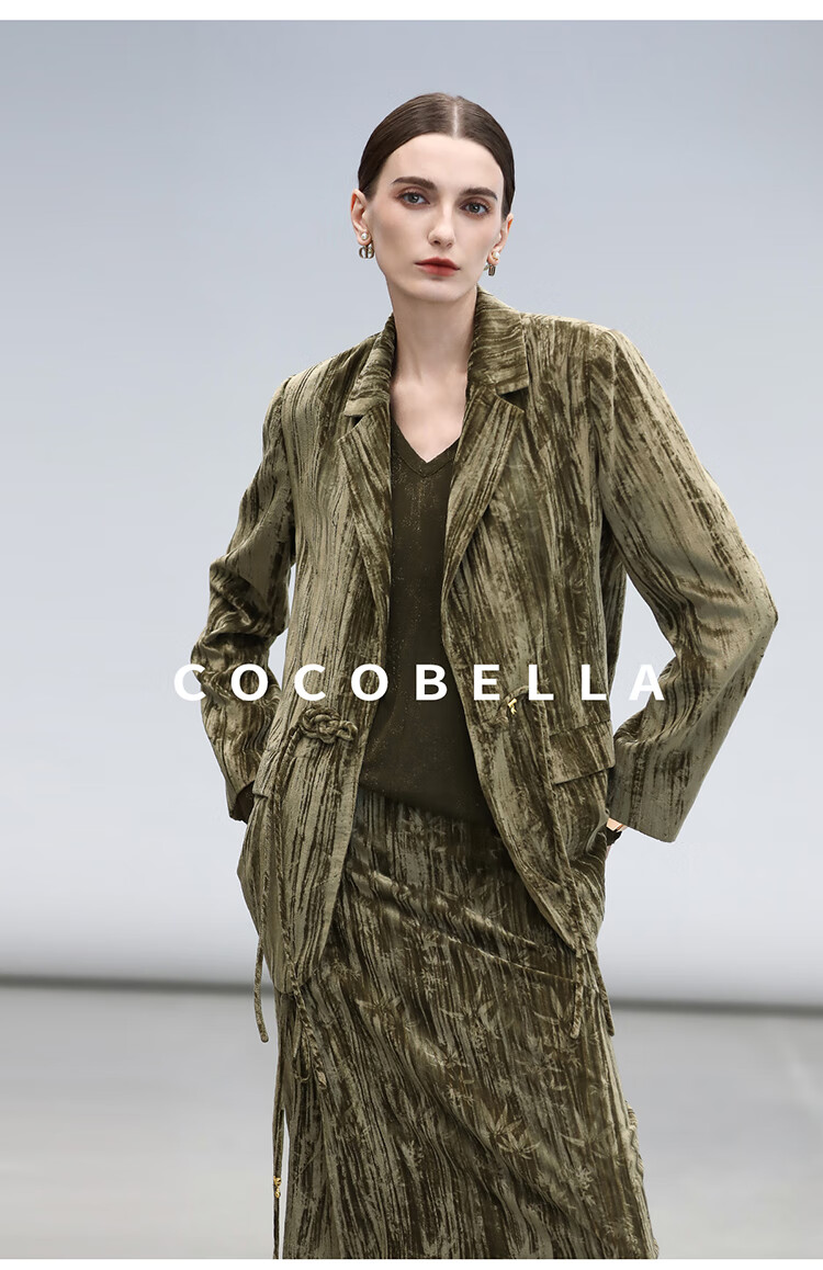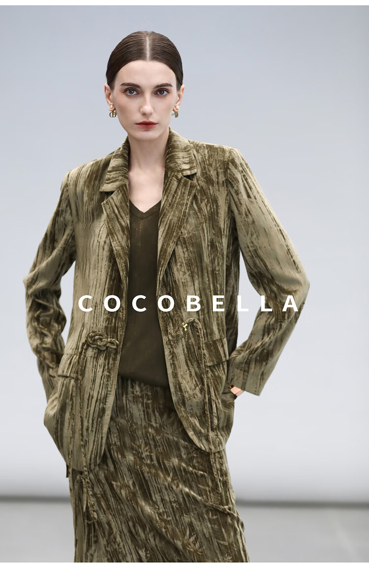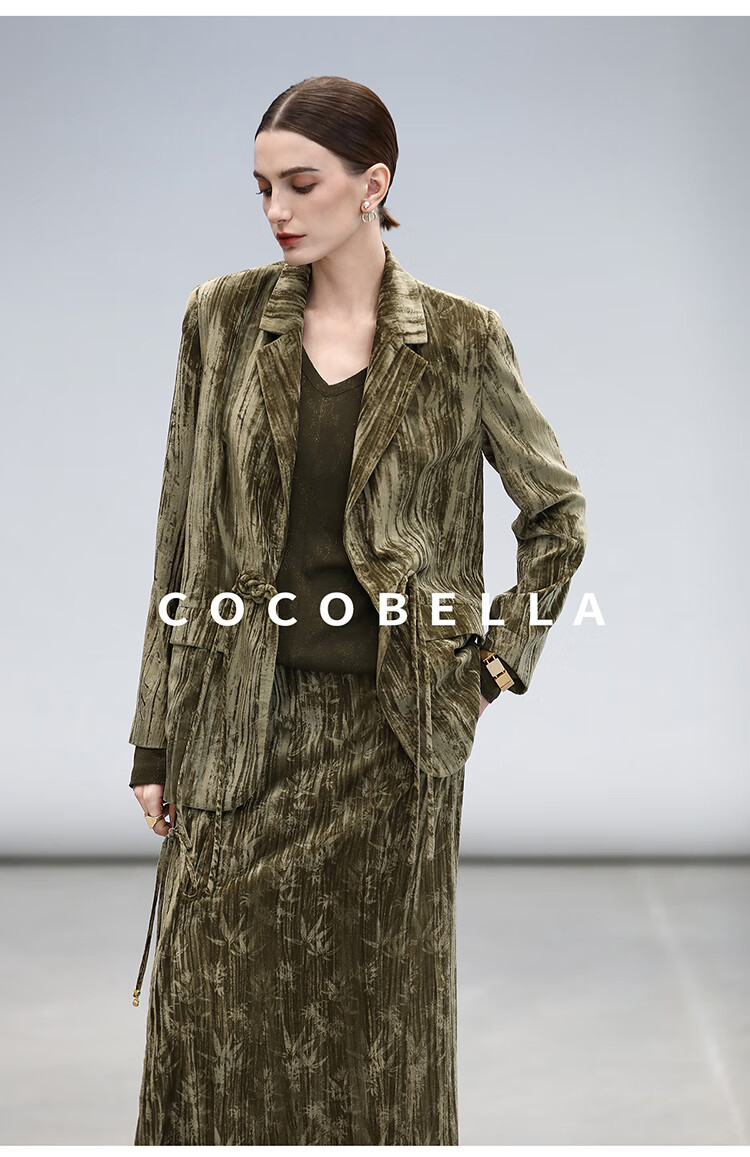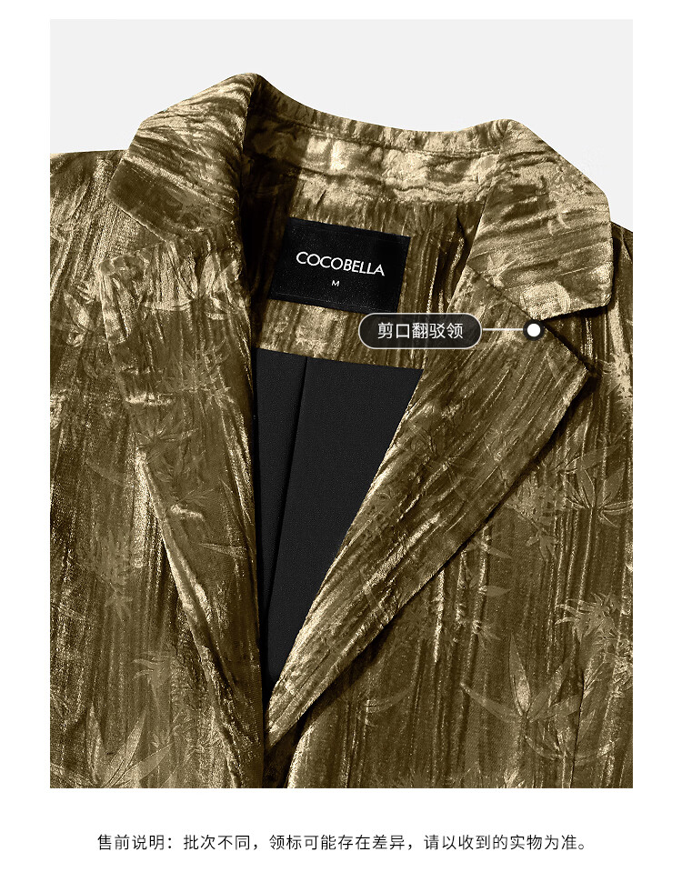 COCOBELLA新中式竹叶拓印压褶丝绒西装女国风盘扣外套SI3032
