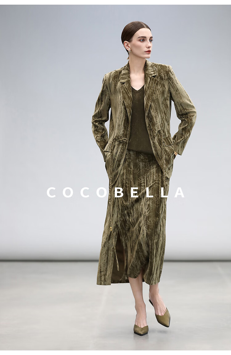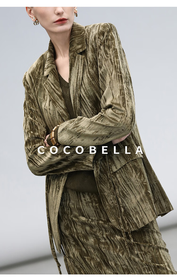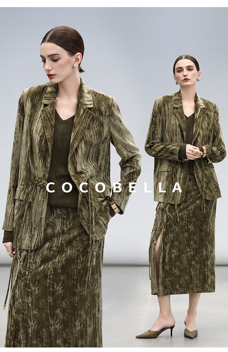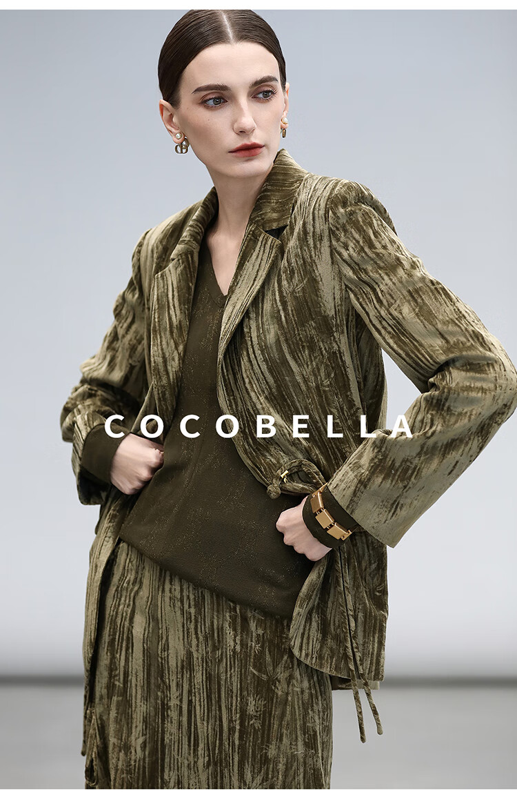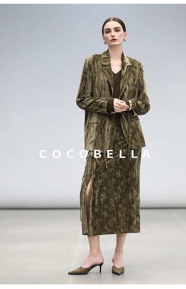 COCOBELLA新中式竹叶拓印压褶丝绒西装女国风盘扣外套SI3032