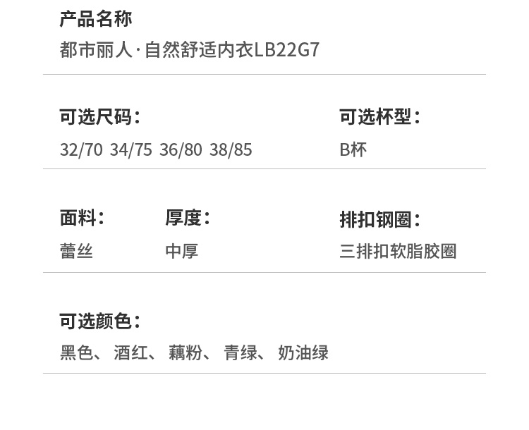 都市丽人自然舒适B杯常规内衣蕾丝薄3/4杯文胸三排扣软脂胶圈LB22G7