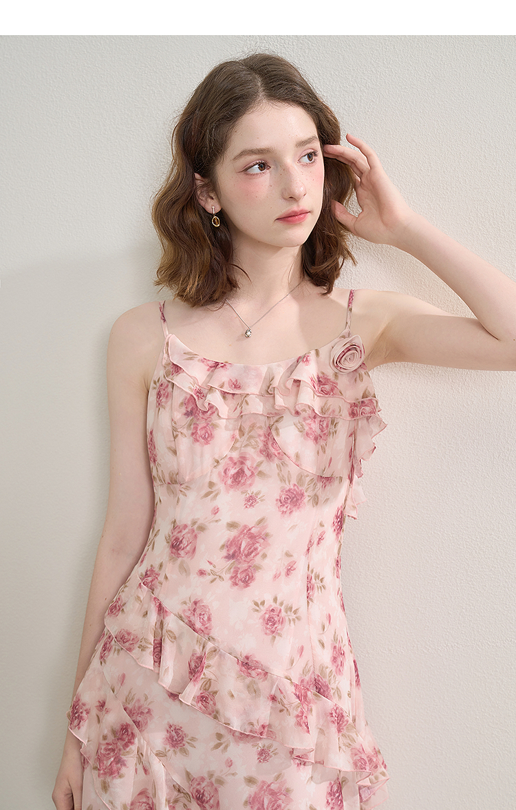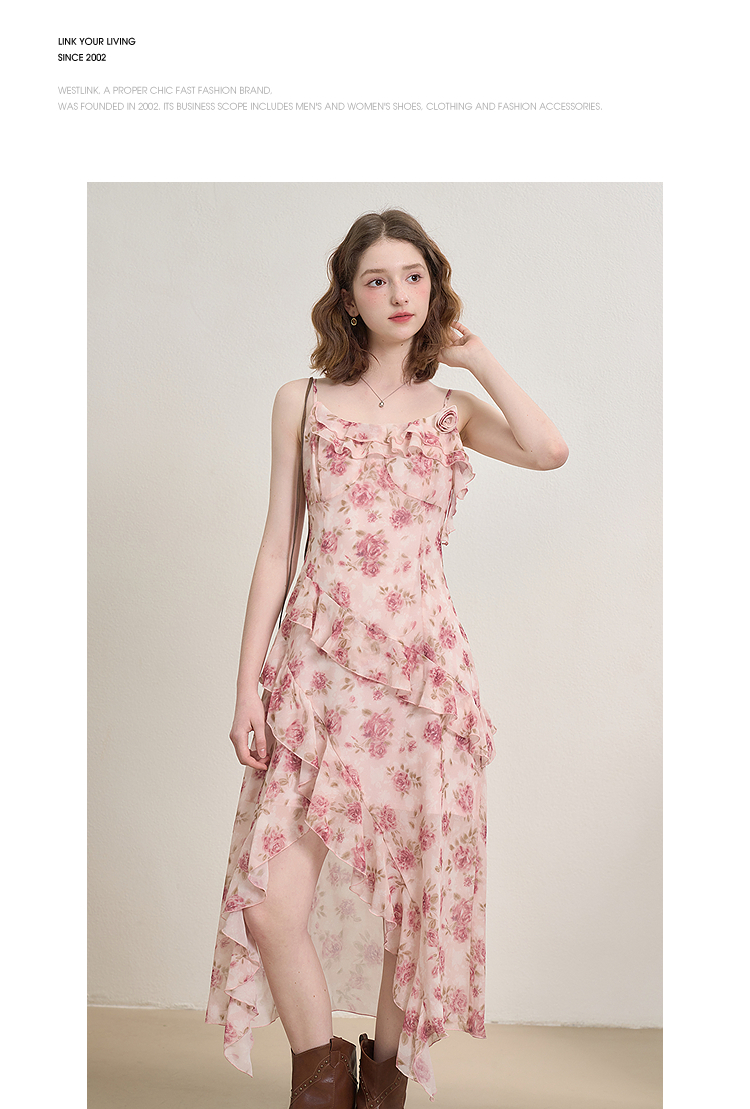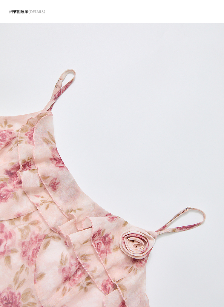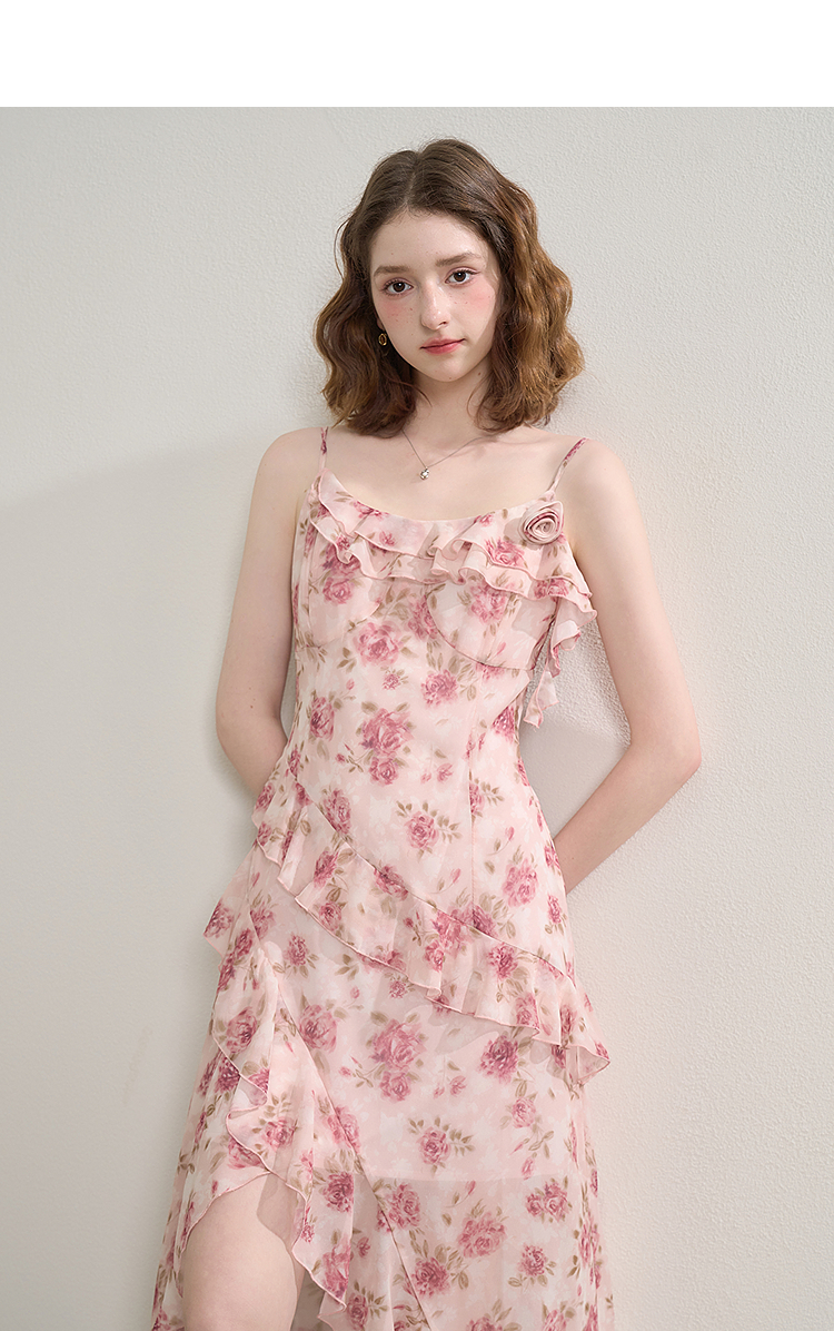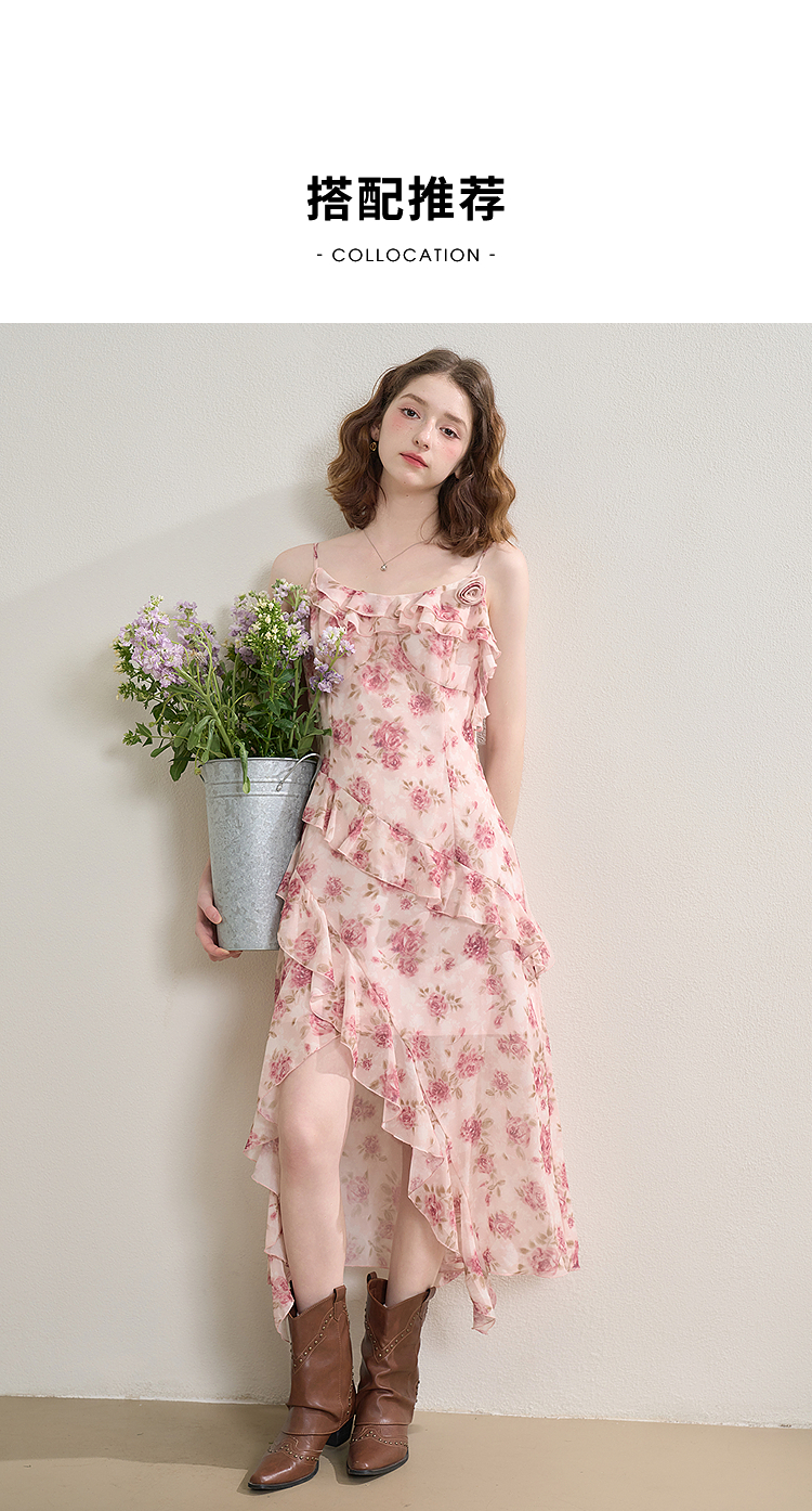 西遇浪漫玫瑰法式拼接荷叶边碎花吊带裙女夏季不规则连衣裙LXD50959