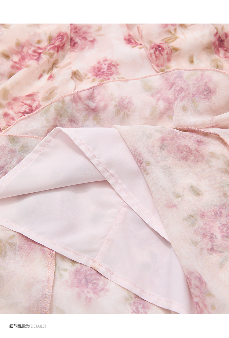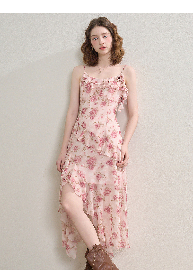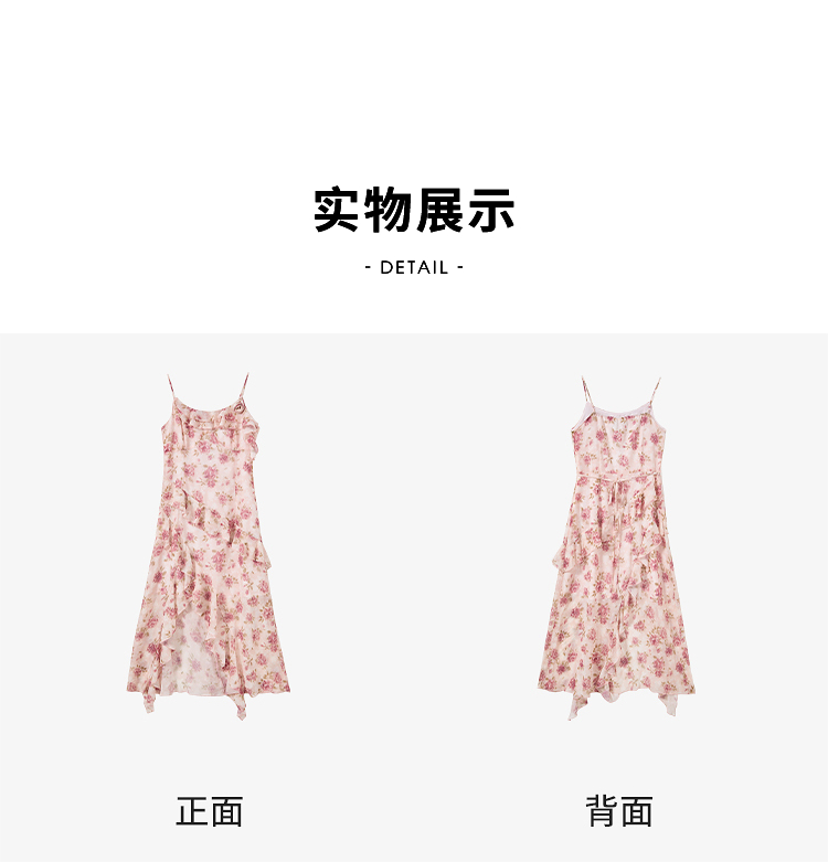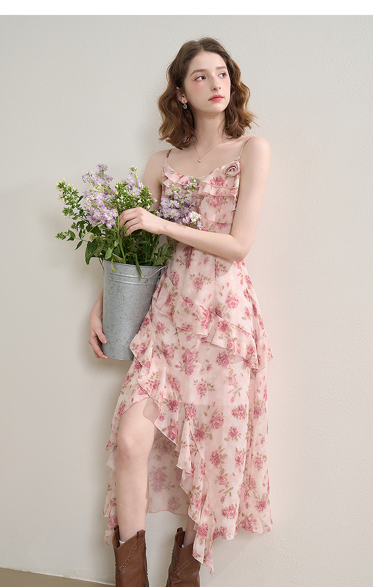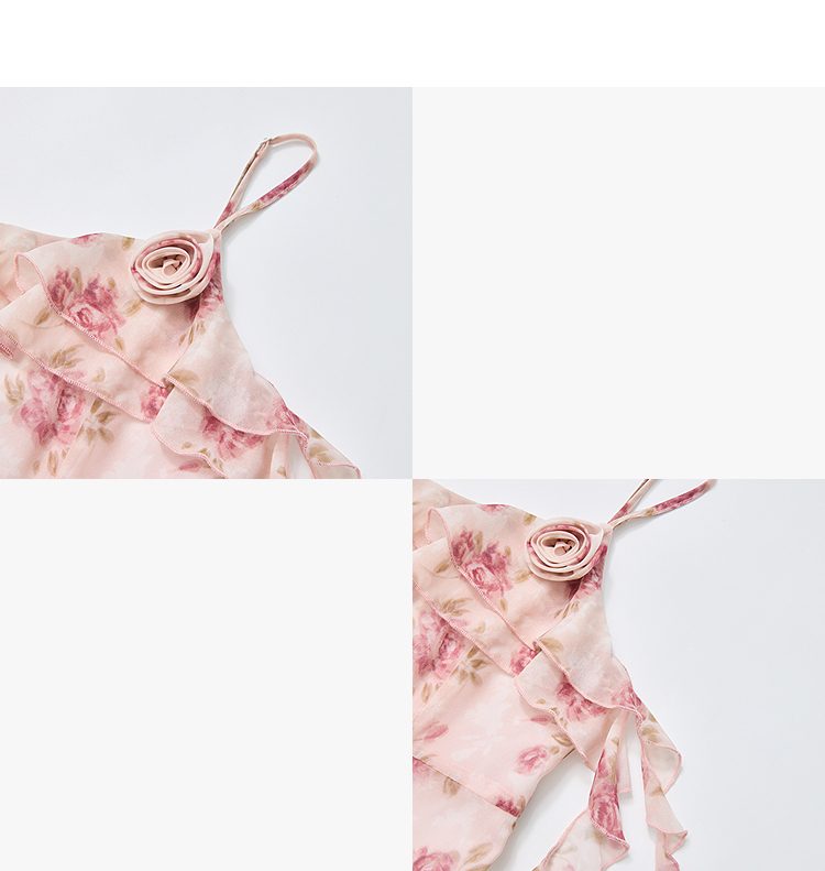 西遇浪漫玫瑰法式拼接荷叶边碎花吊带裙女夏季不规则连衣裙LXD50959
