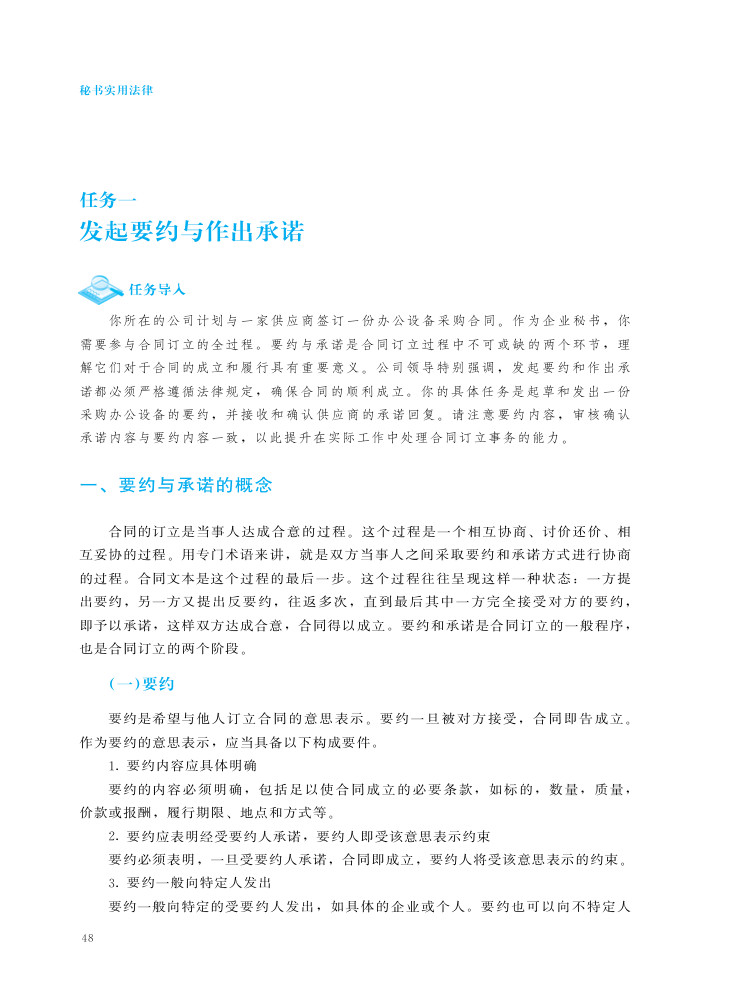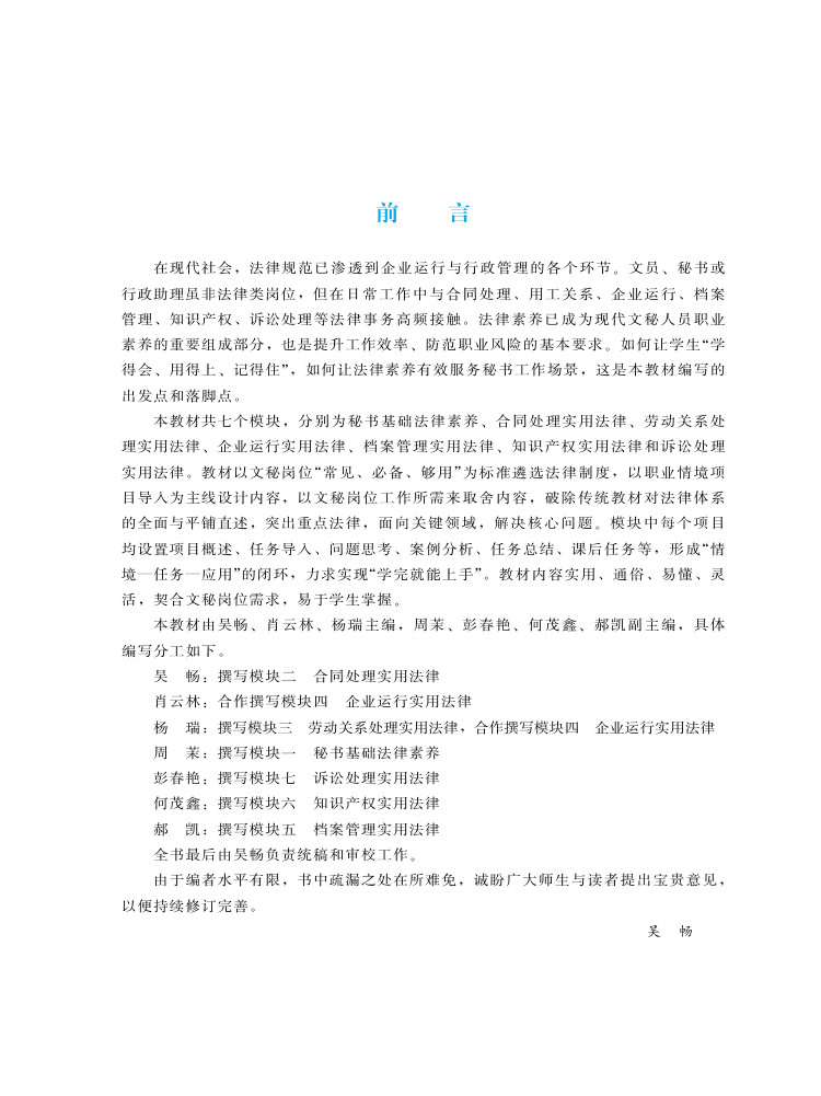 《秘书实用法律》是高等职业院校文秘专业的必修课程教材,旨在培养学生具备必要的秘书理论和较强的秘书实践能力。教材聚焦文秘岗位法律需求,构建"知识+案例+实务"三维体系。全书以秘书职场法律风险为基石,系统解析公司法、合同法、劳动法核心条款,融入电子商务法、数据安全法等新兴领域法规。通过劳动合同审查、商务函件合规性校验等8个典型场景实战,强化知识产权保护与纠纷处理能力,配套行业标杆案例库解析法律文书写作规范。课程创新引入AI合同审查工具,提升法务工作效率,助力学生掌握法律风险防范与合规管理的双核能力,培养适应法治化职场的复合型文秘人才