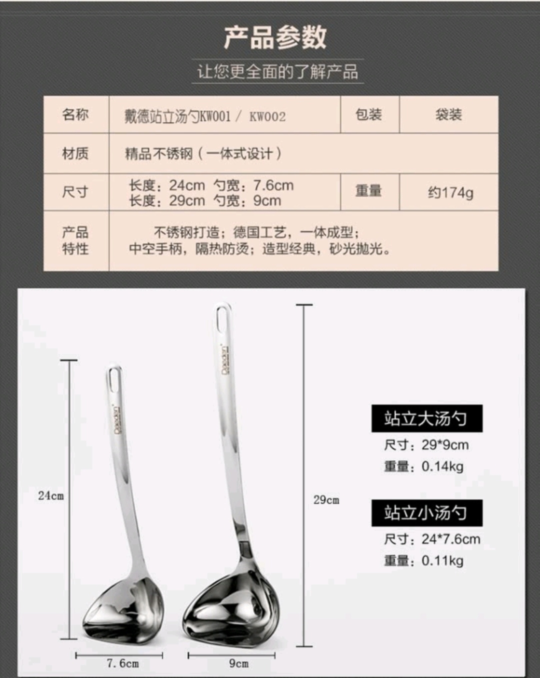 德国戴德18/10不锈钢站立大汤勺可直立可挂勺子