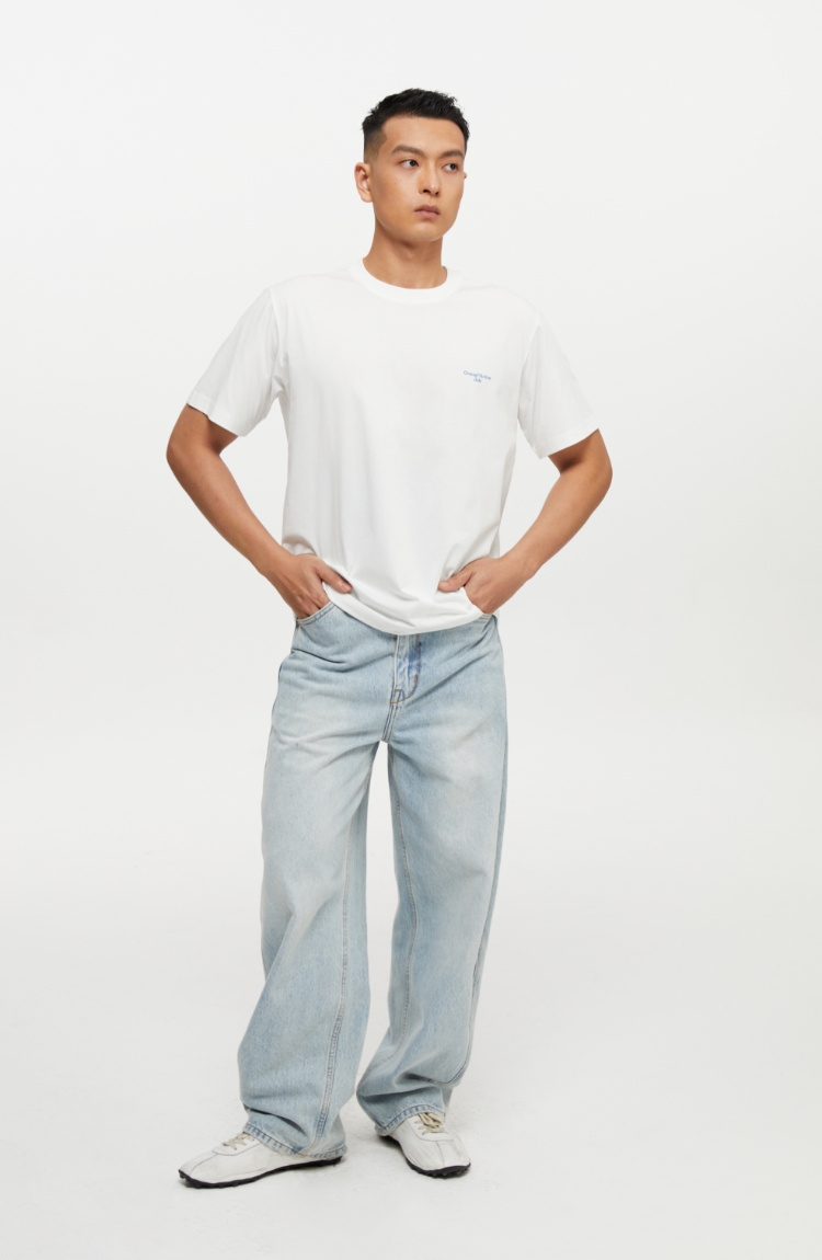 复古水洗蓝高腰直筒牛仔裤