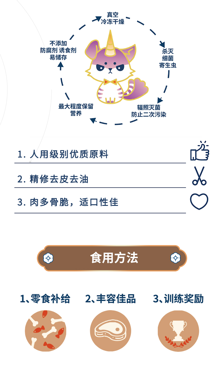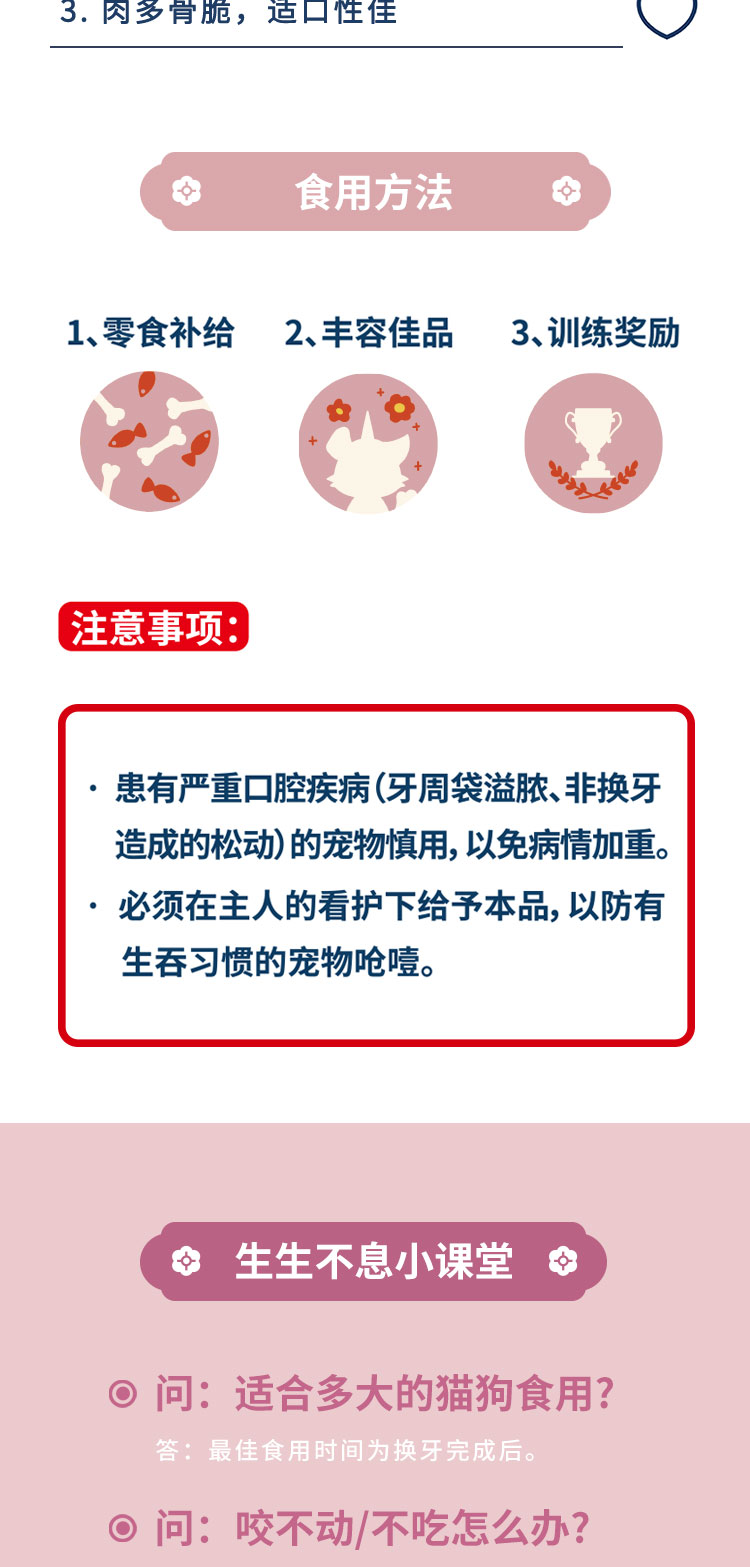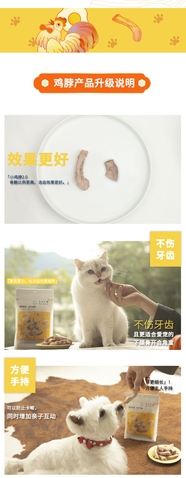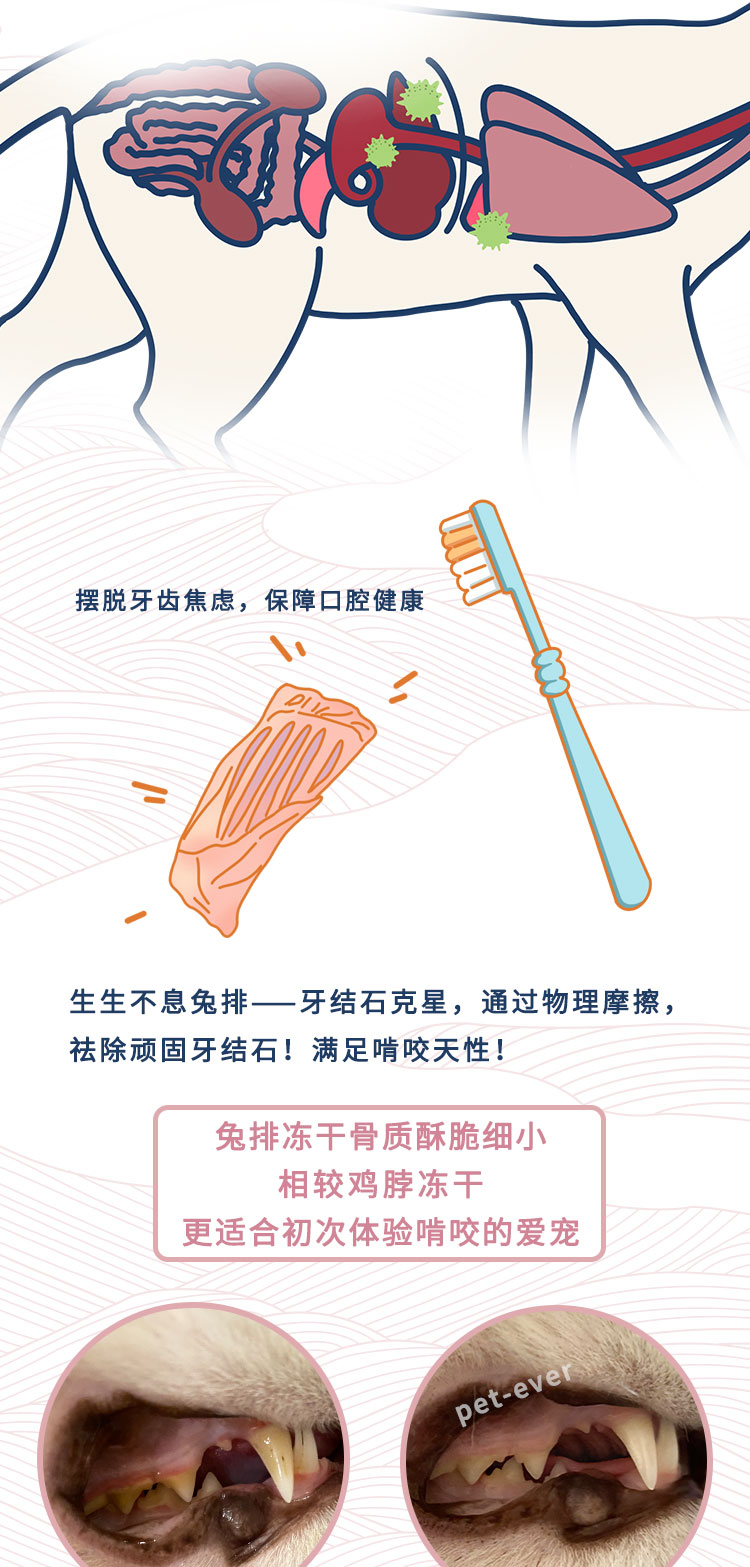 答:兔排冻干骨质酥脆细小,鸡脖冻干骨骼紧实细密,前者更适合初次体验啃咬的爱宠,后者啃咬难度相对高一些些,同时洁牙效果也更好一些~