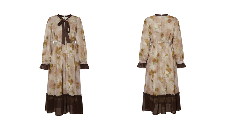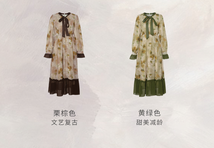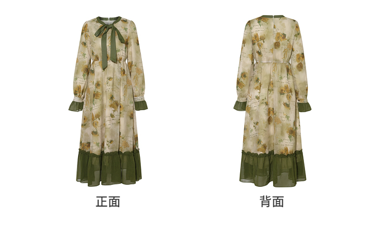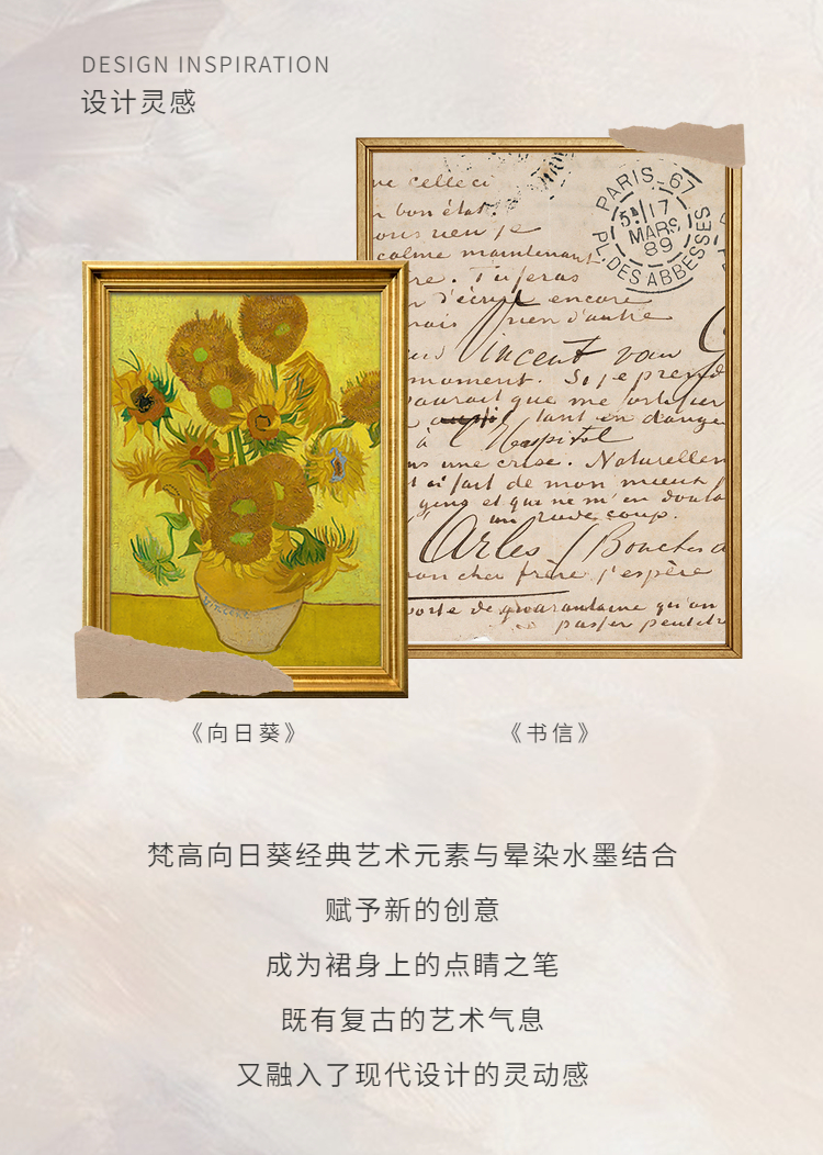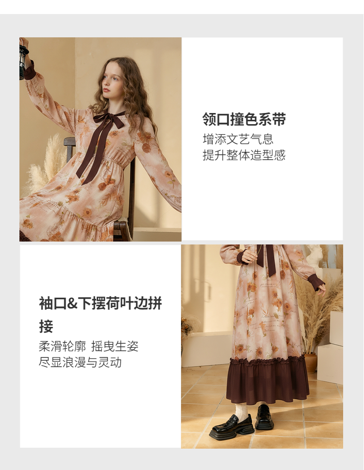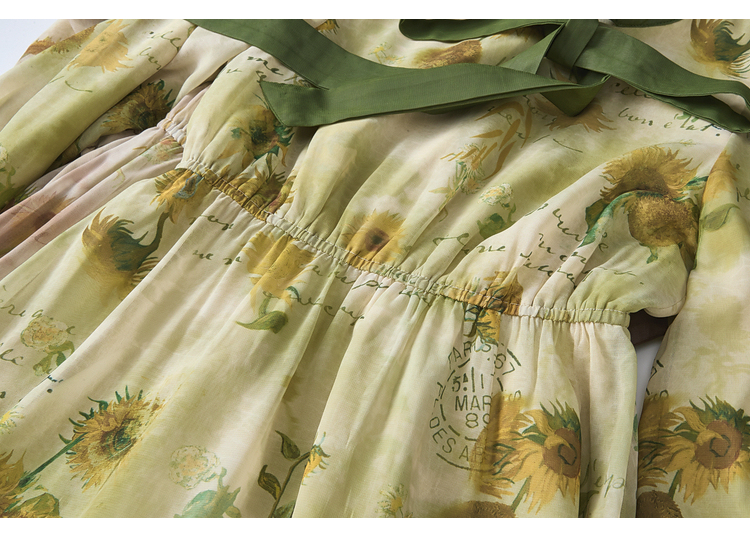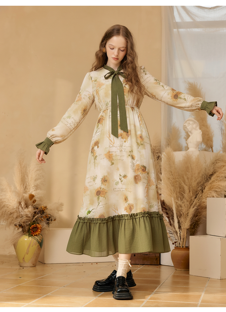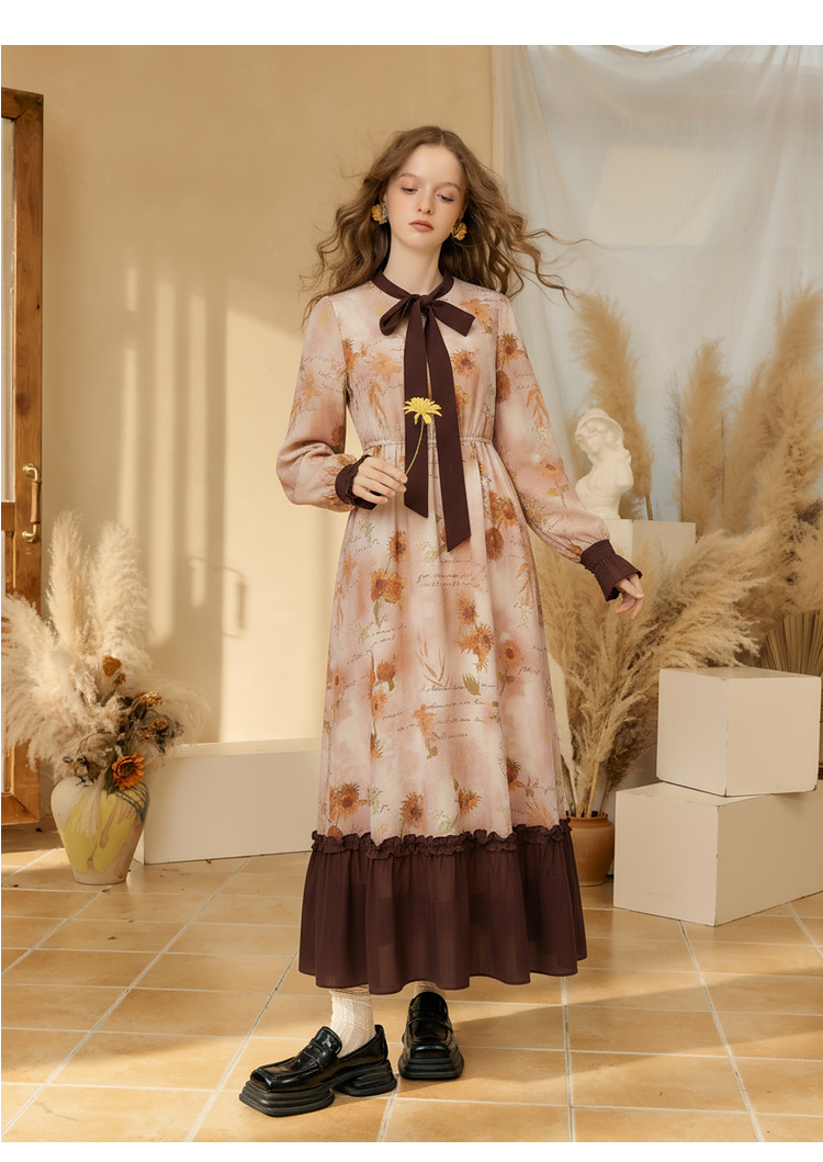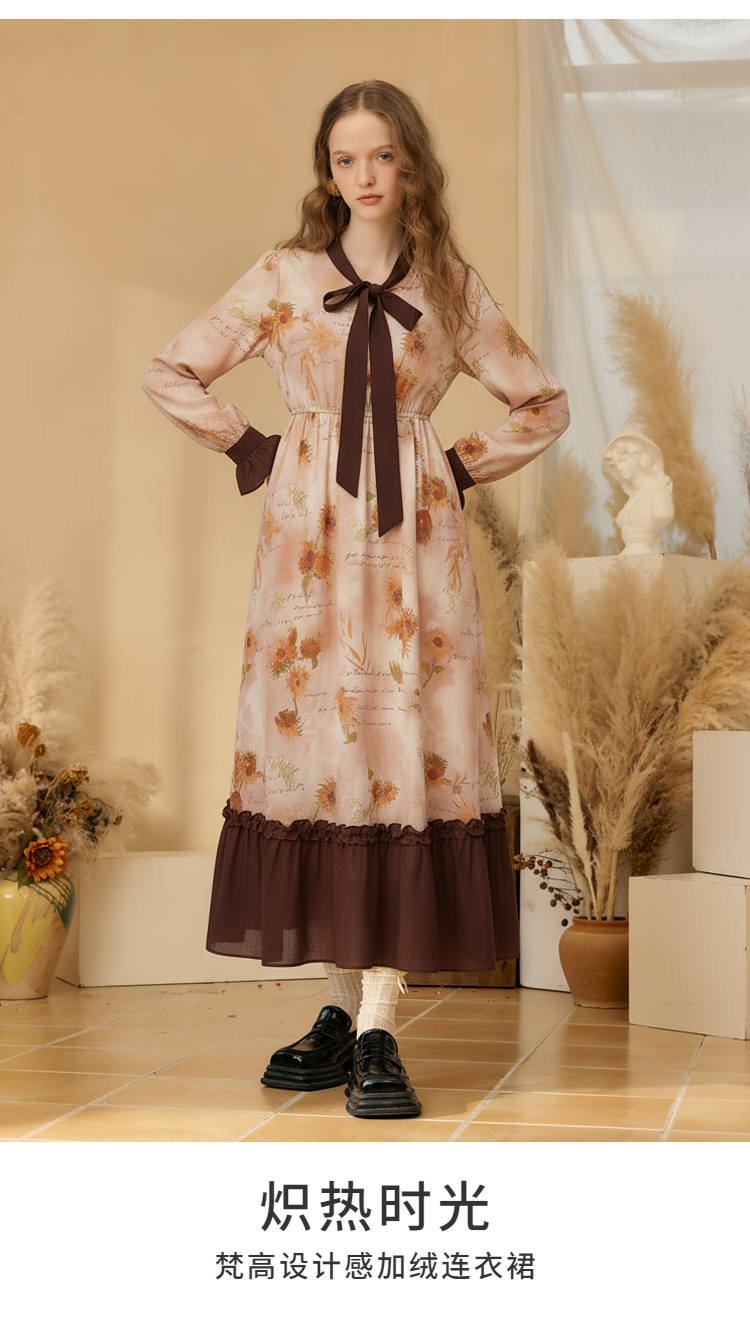 两三事梵高文艺炽热时光 2025冬季新款向日葵印花绑带a字连衣裙