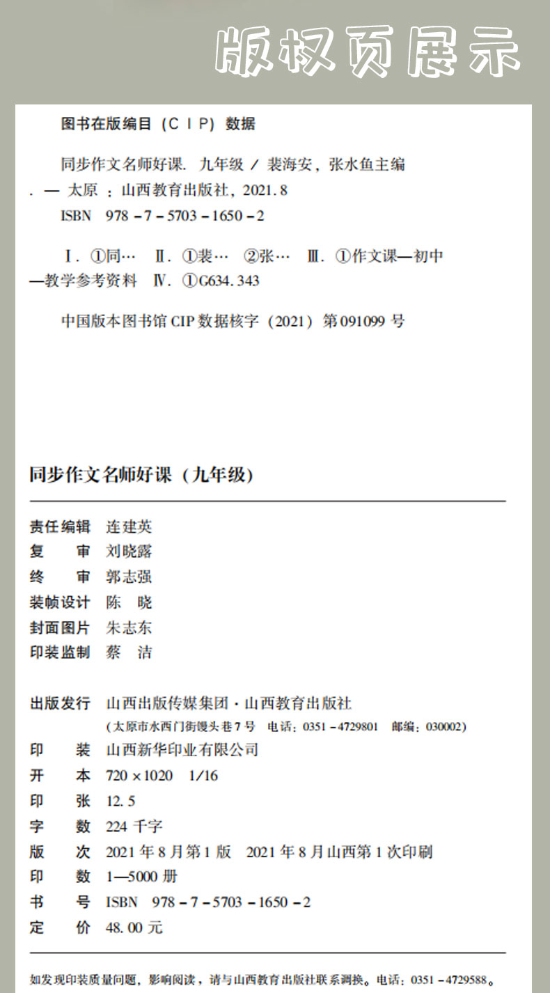 正版同步作文 名师好课 初中九年级 主编 裴海安 张水鱼 书内含课件 教学参考资料 山西教育出版社出版