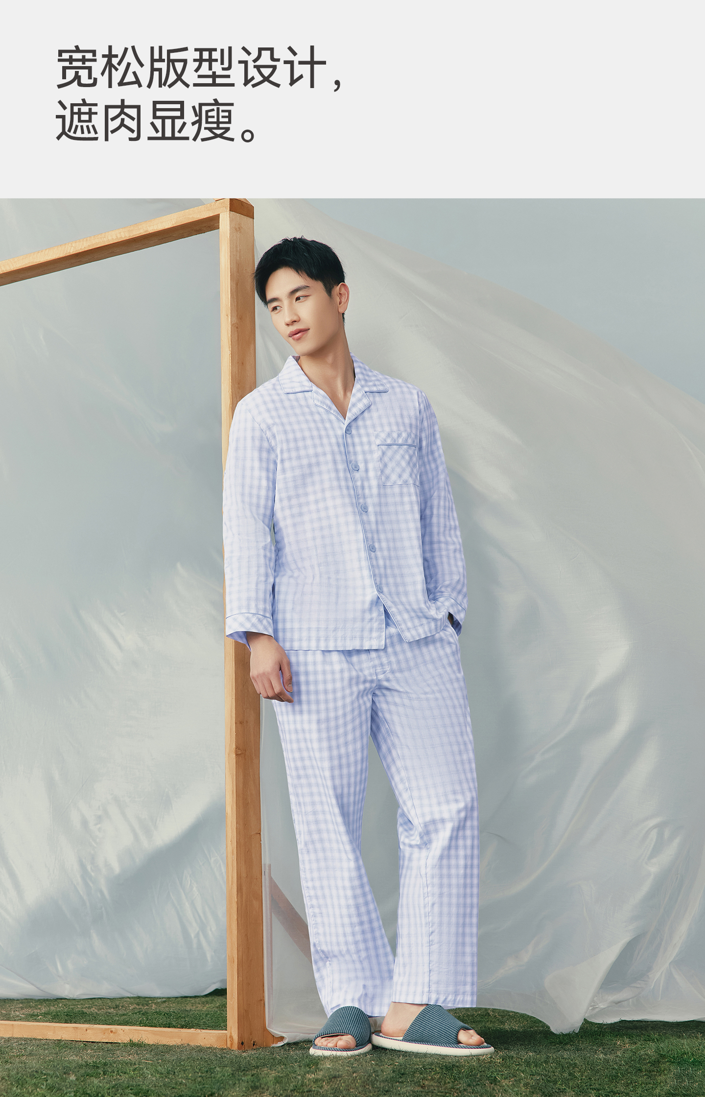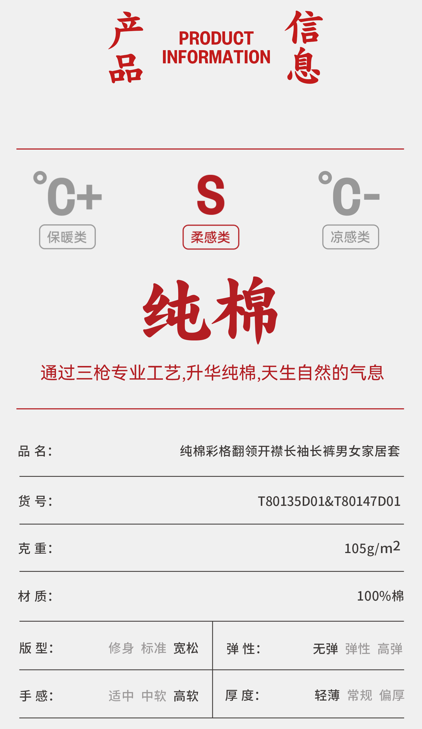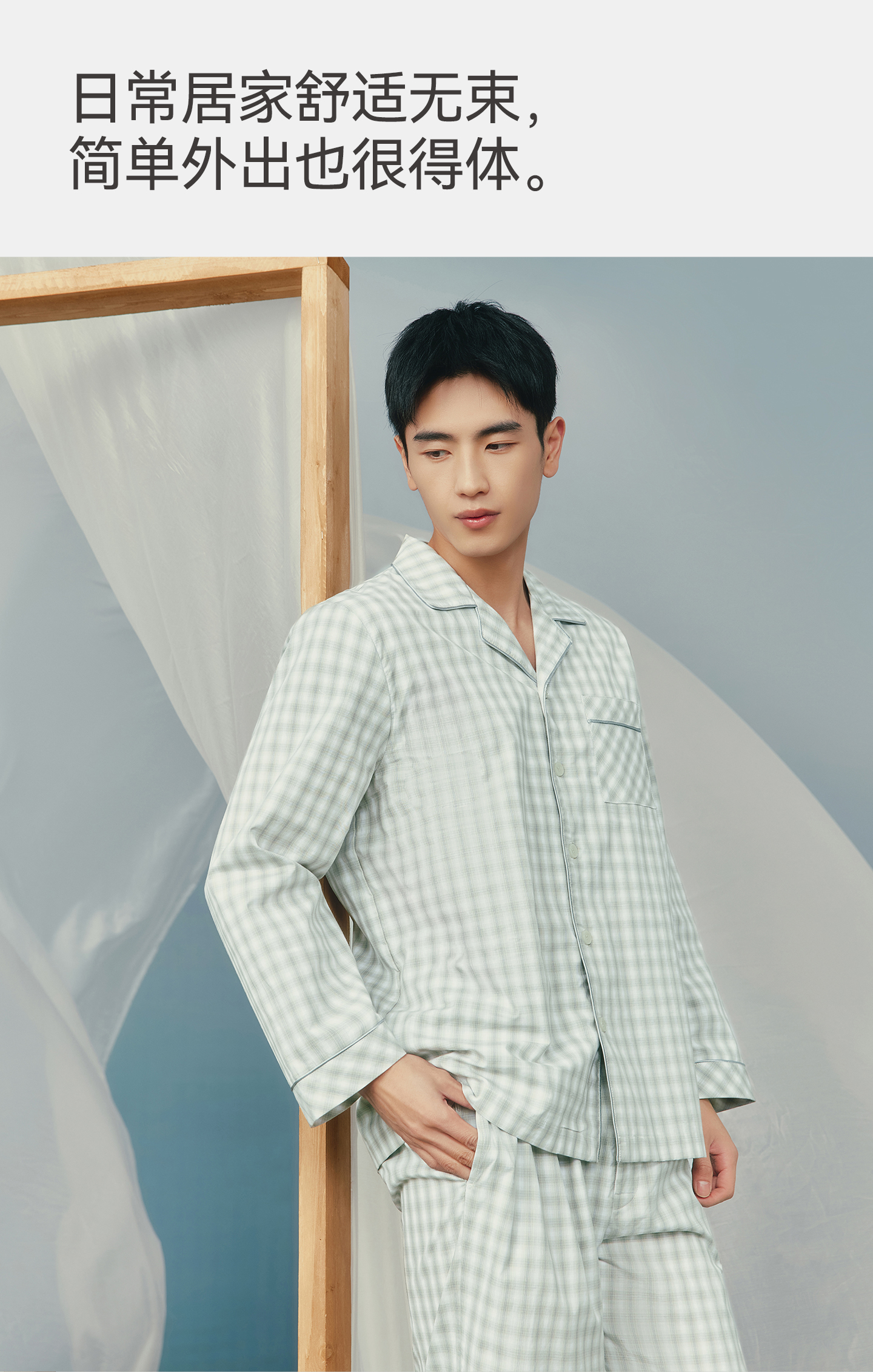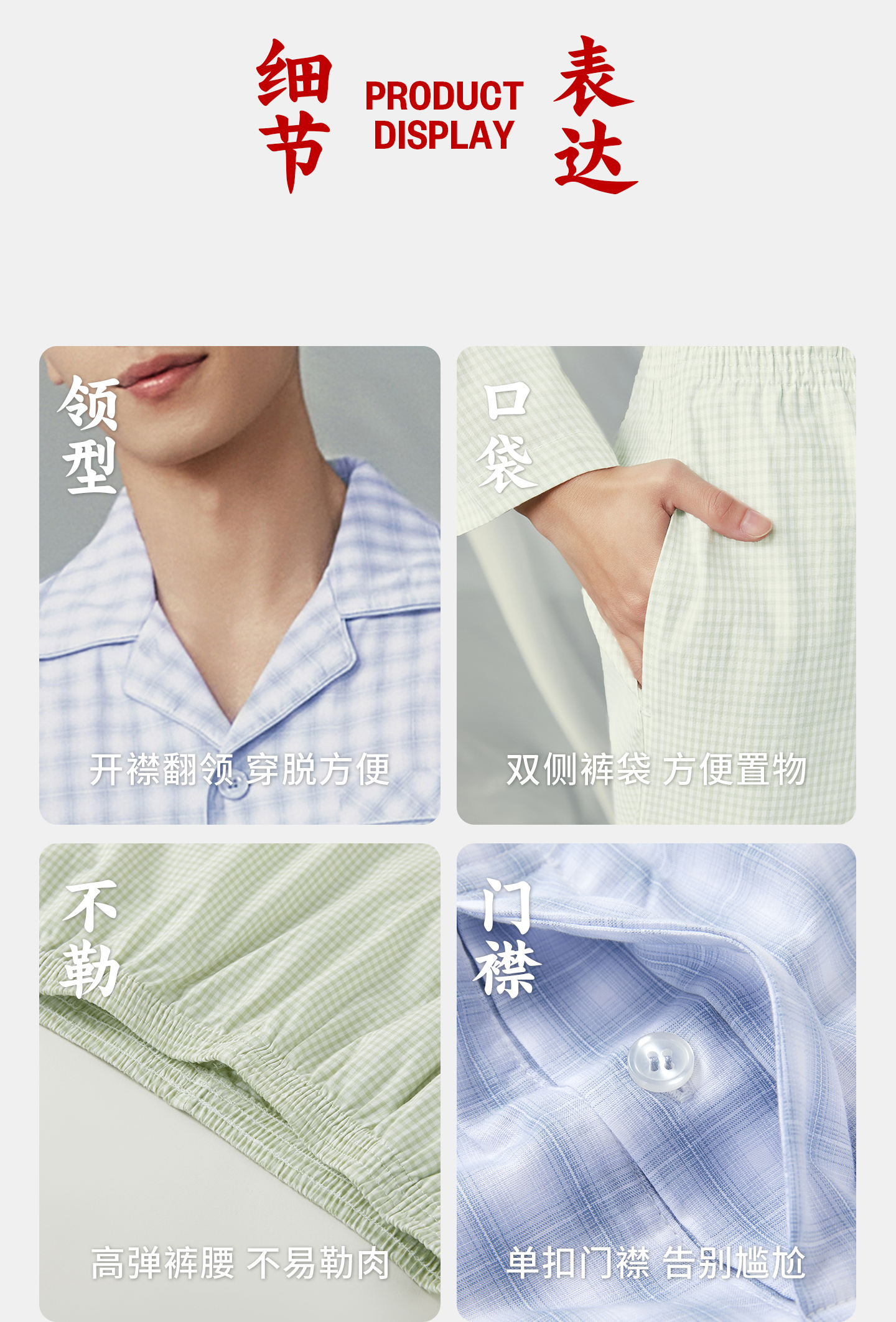 Threegun三枪 纯棉彩格翻领开襟长袖长裤男家居套-T80135D01