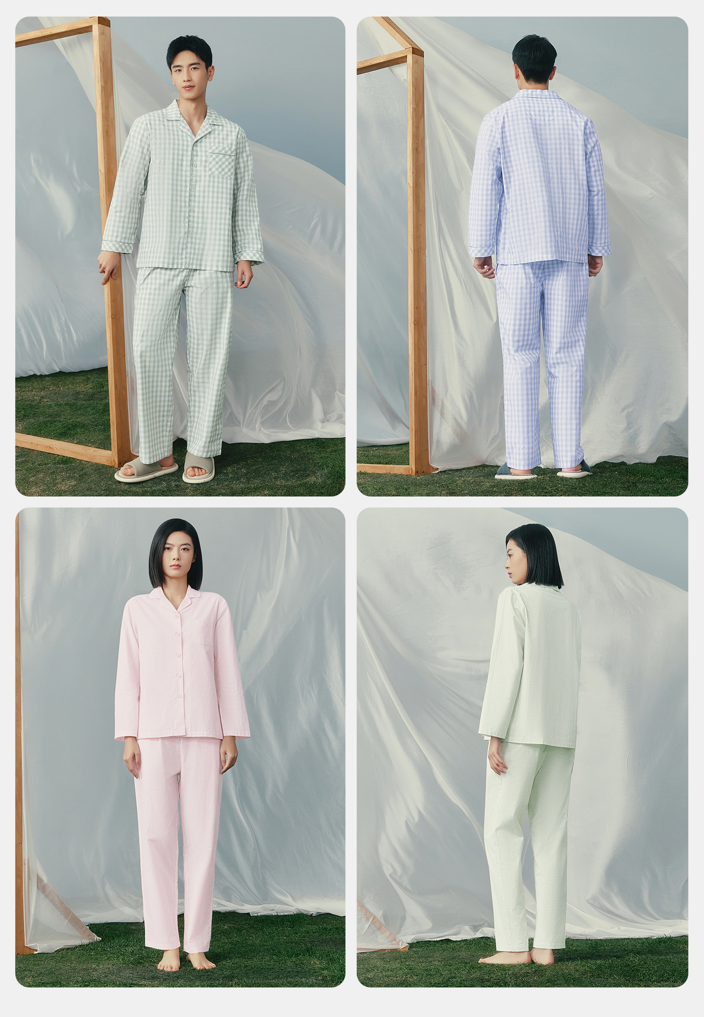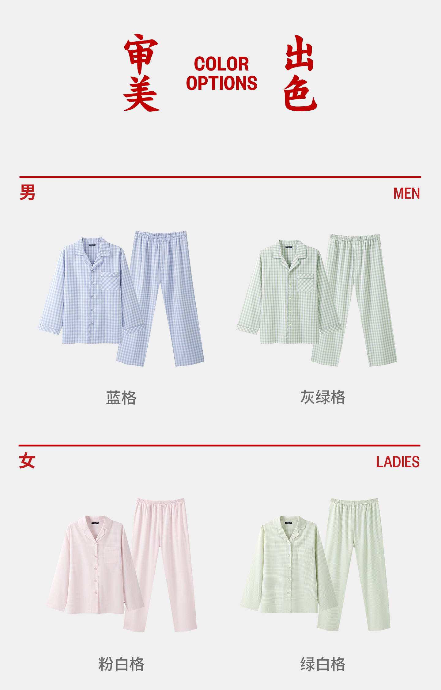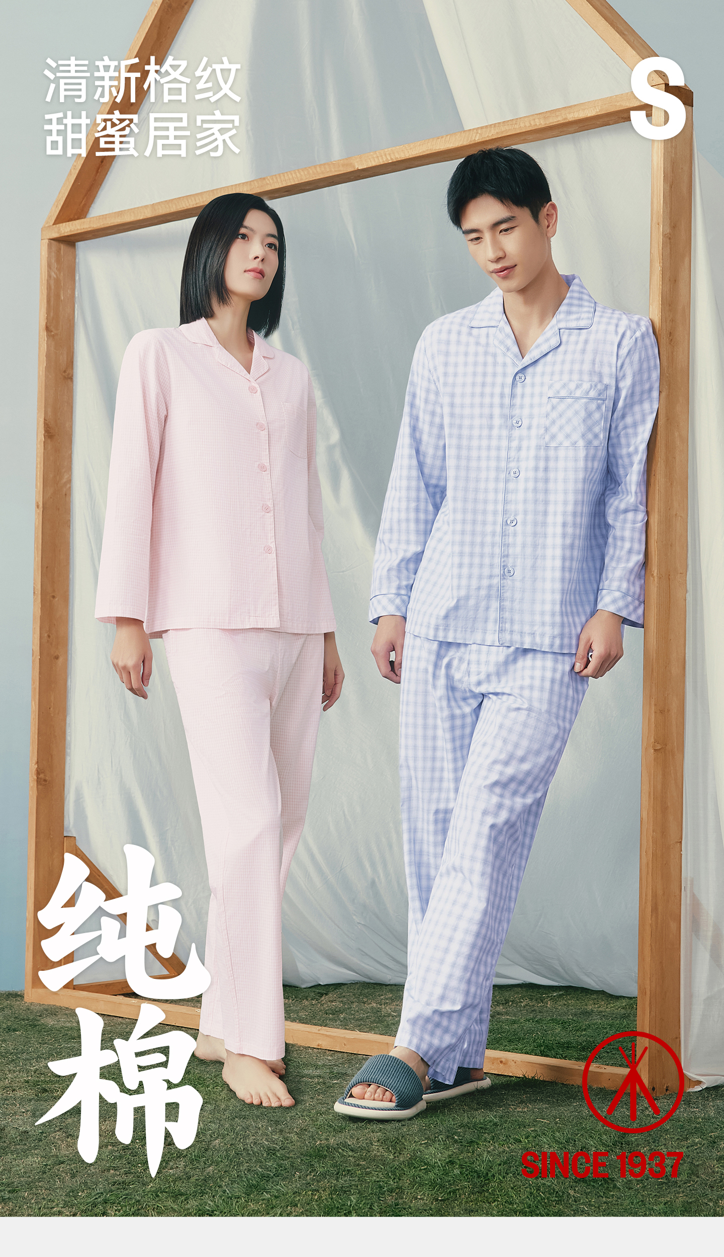 Threegun三枪 纯棉彩格翻领开襟长袖长裤男家居套-T80135D01