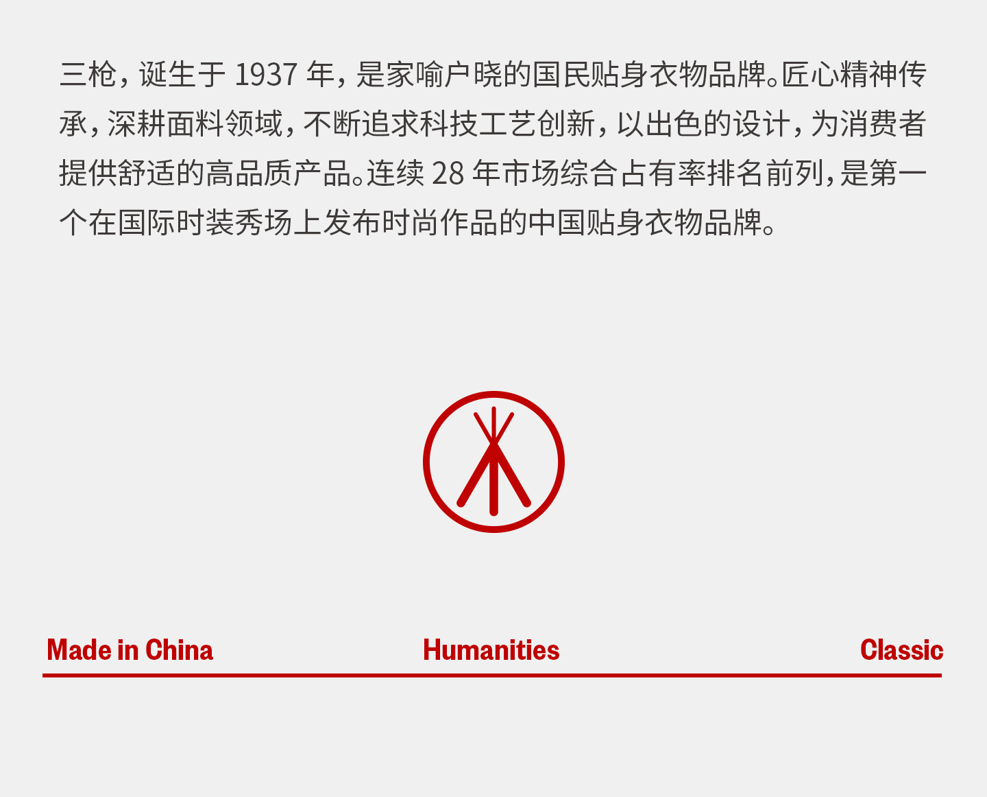 - 创建于1937年,中国代表性民族品牌 “引领内衣发展趋势,倡导身心合一的温馨生活” 是品牌的发展理念 始终致力于面料的舒适性和功能性开发 融合科技与时尚 用心呵护您的每一次贴身体验