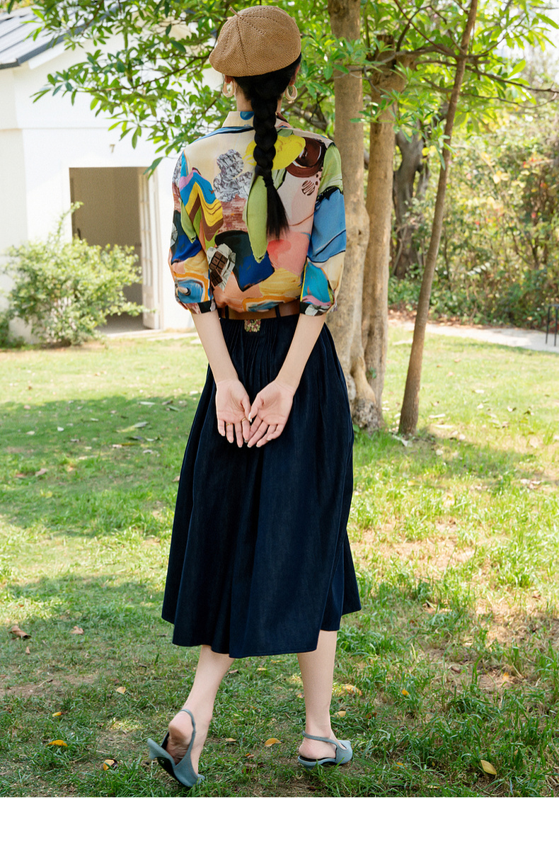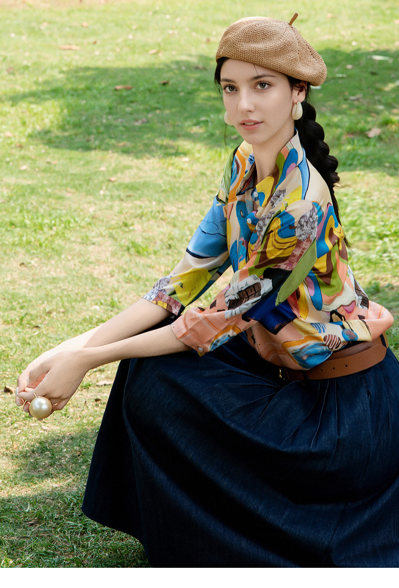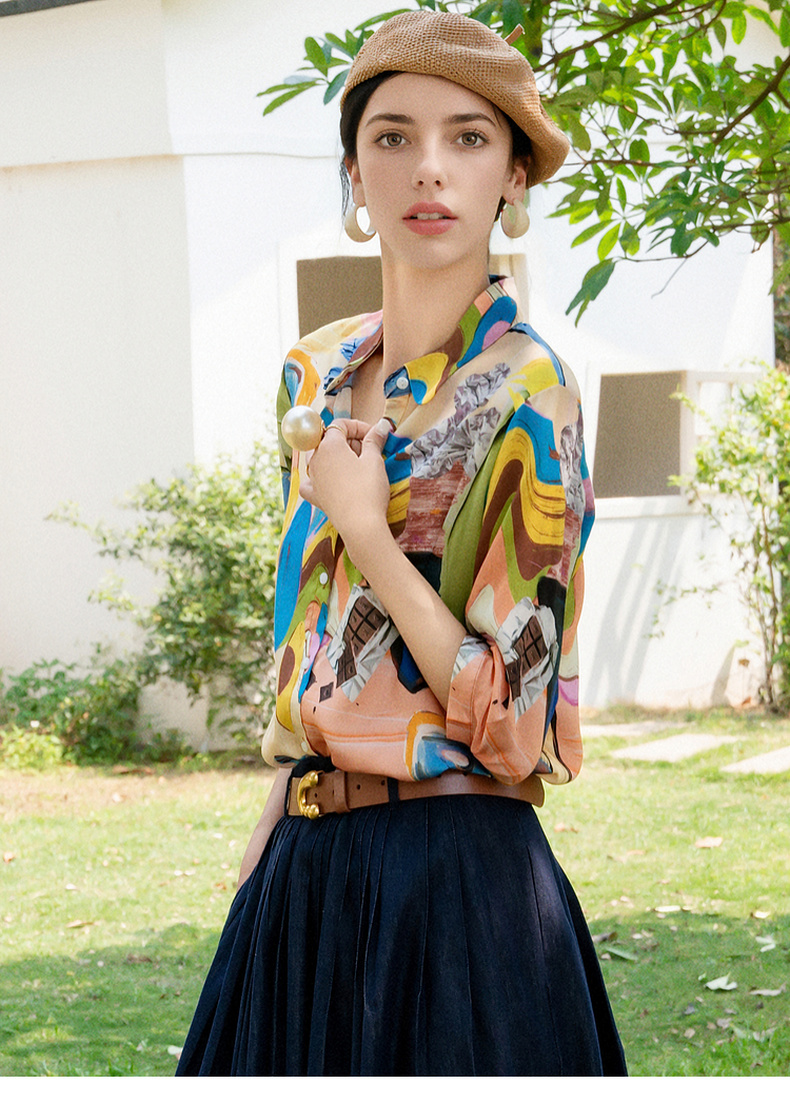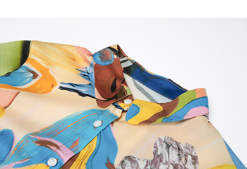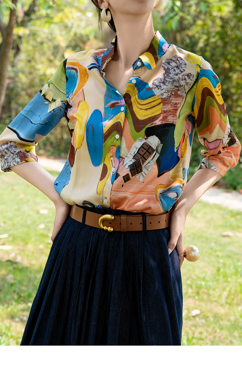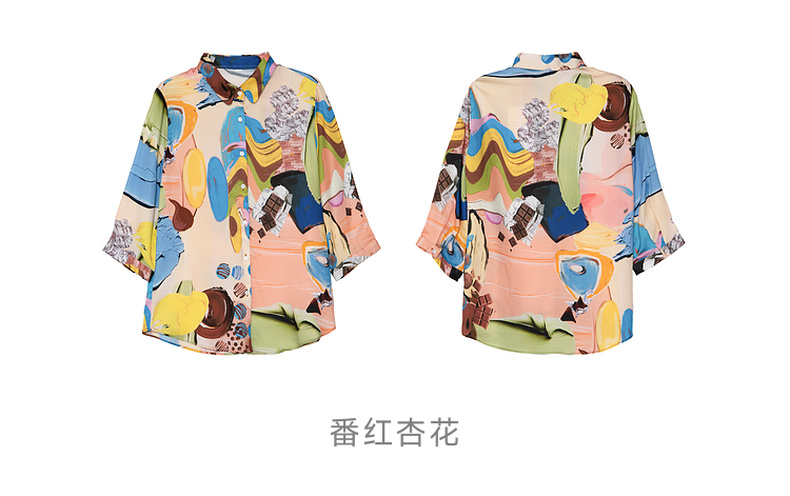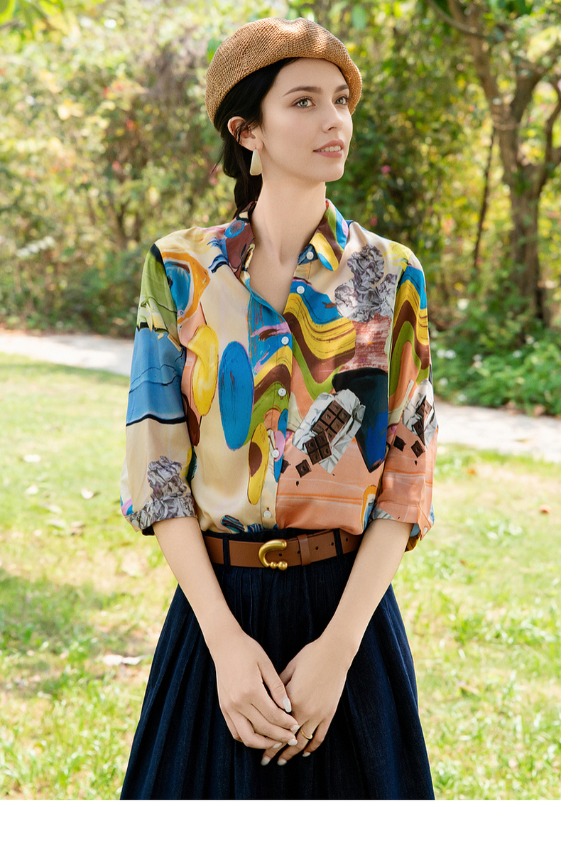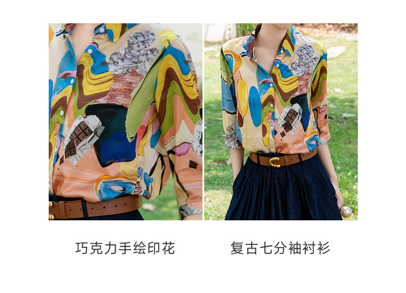 谜底天丝衬衫七分袖女2025夏新款抽象亲肤柔软合体衬衣256MC6285