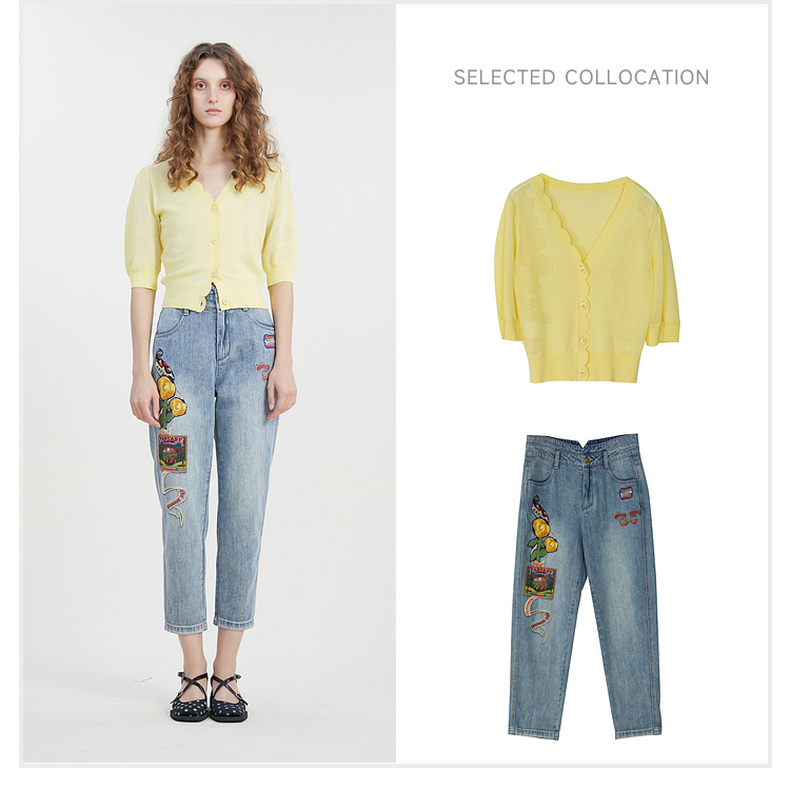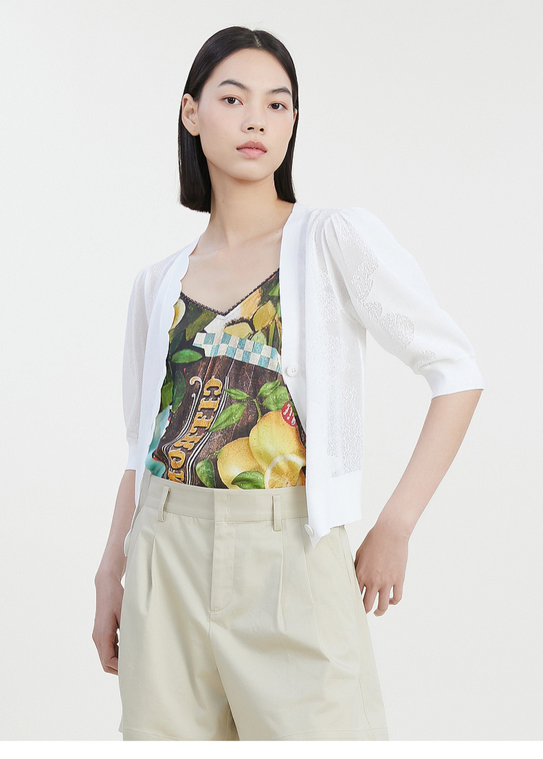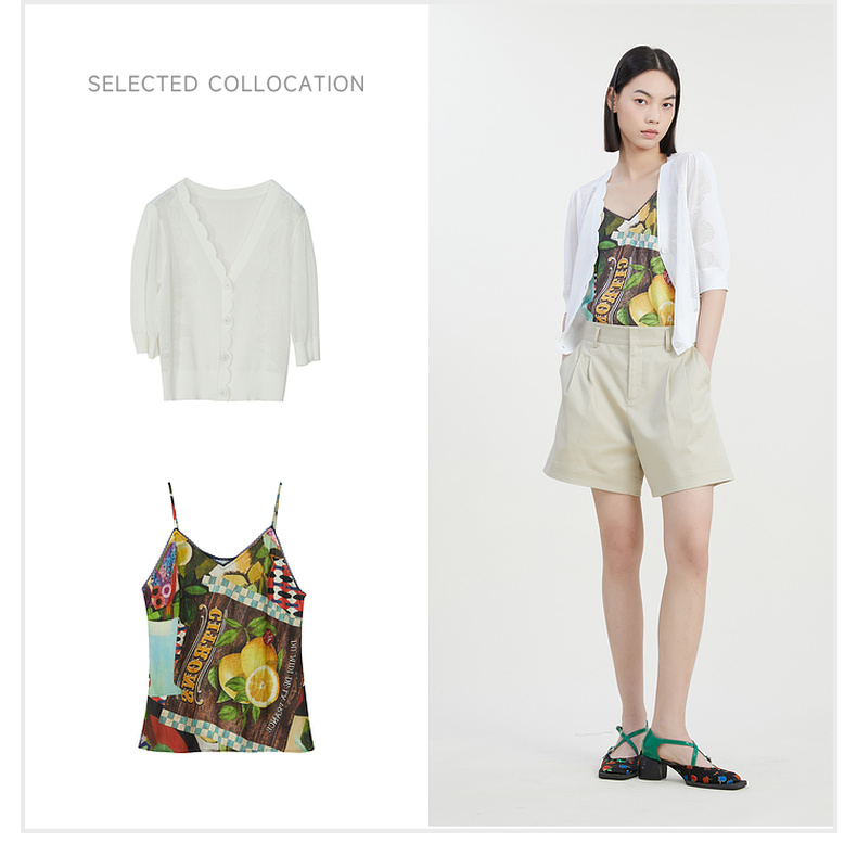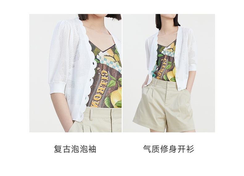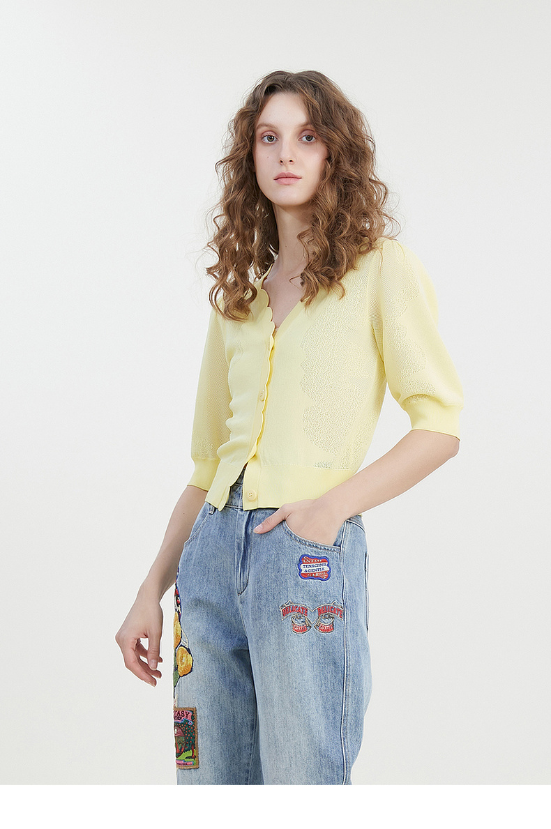 谜底针织衫短袖女2023夏季新款小清新设计感V领针织开衫232MZ0856